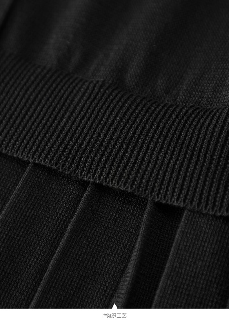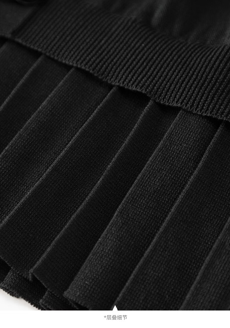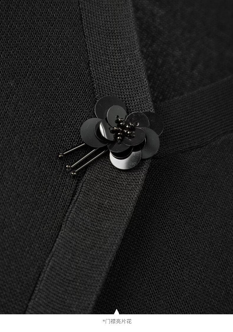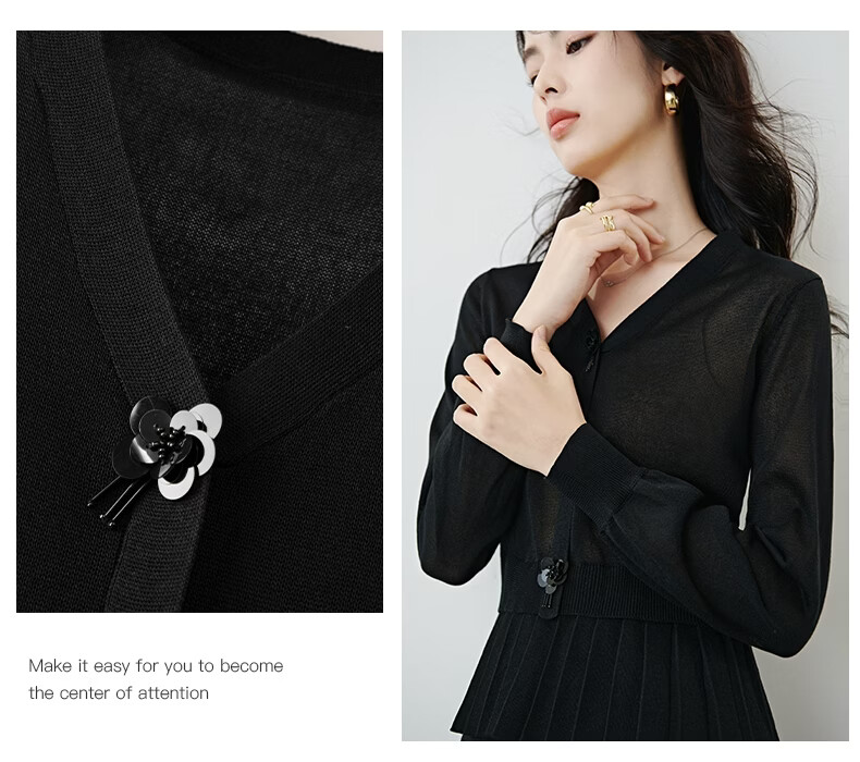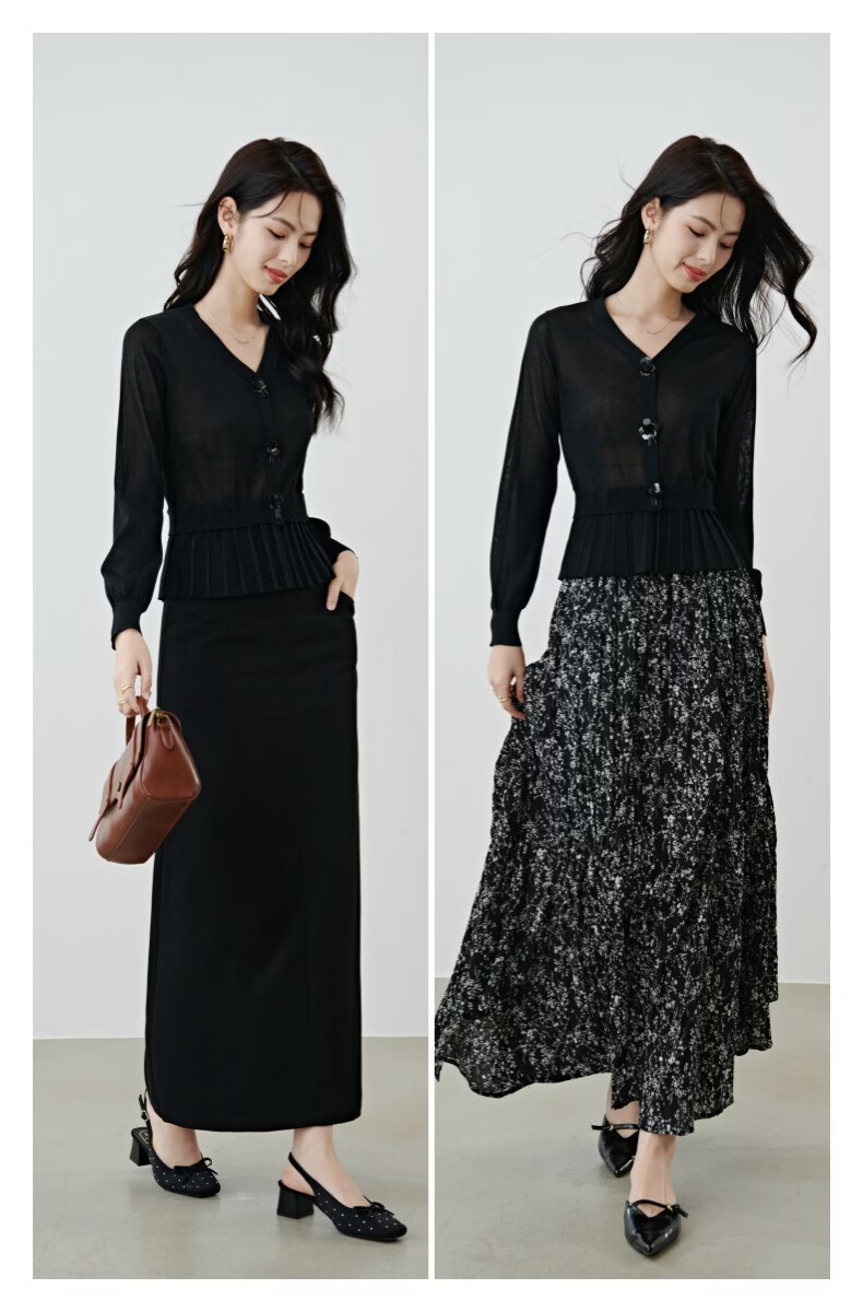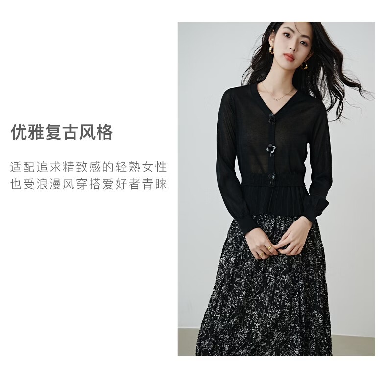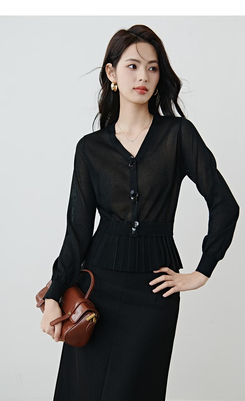 晚白2026春款设计感珠花扣装饰V领上衣小众百褶遮肉下摆莱赛尔针织衫 黑色 L