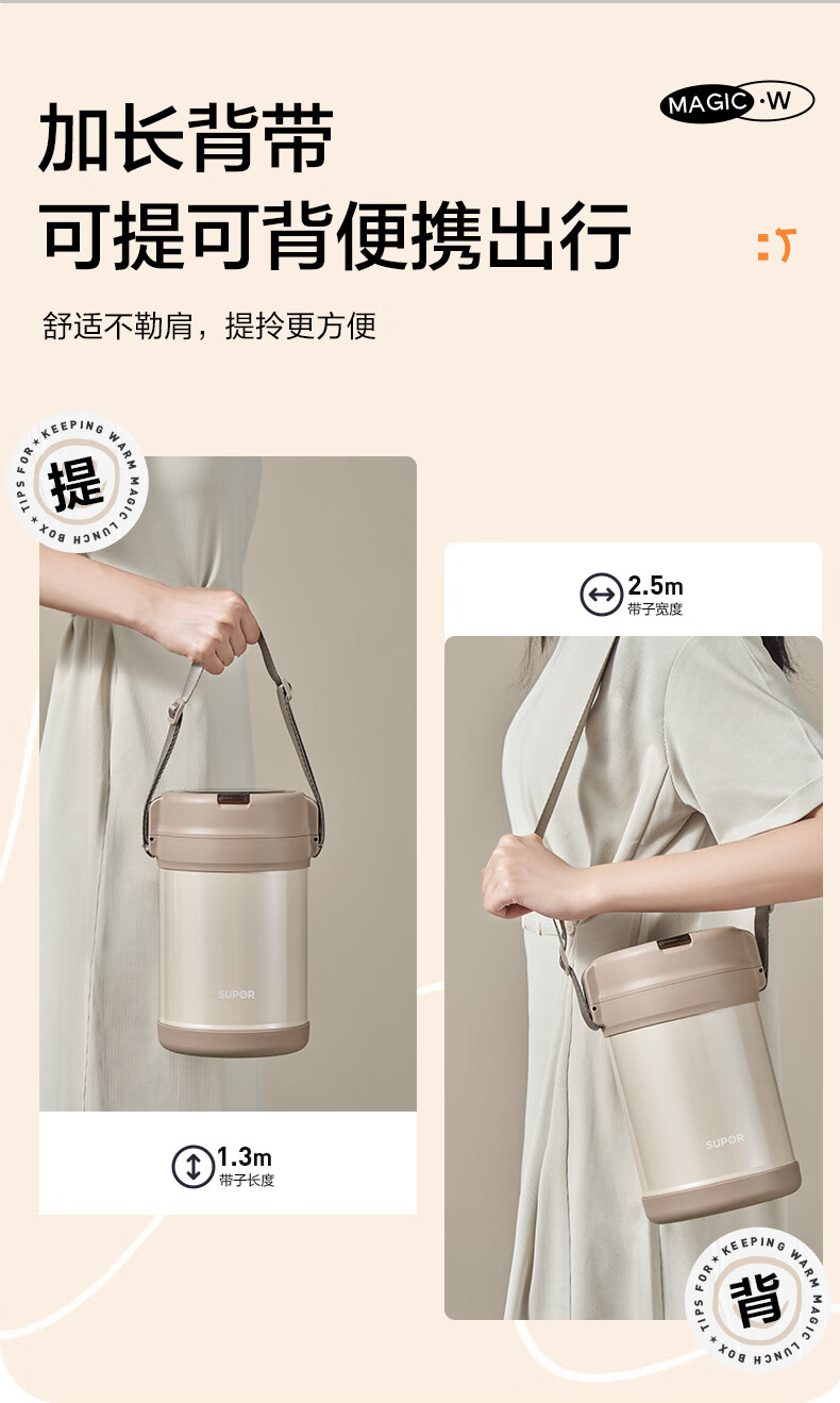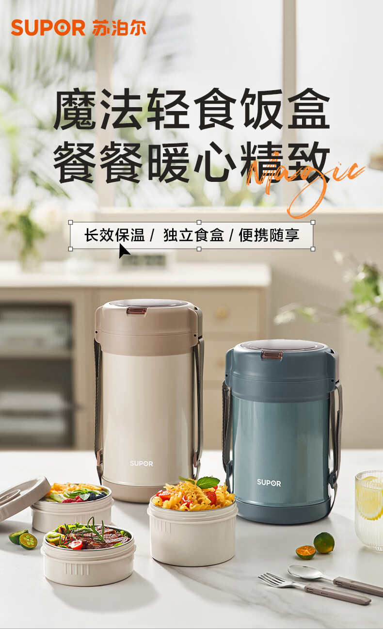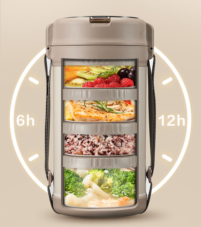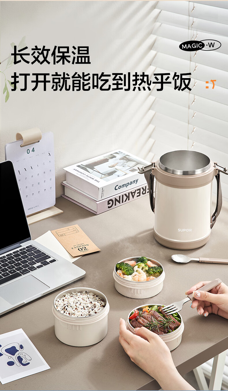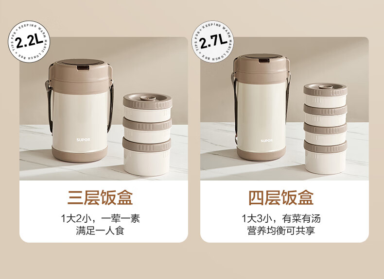 苏泊尔(SUPOR)保温提锅饭桶家用超长保温上班族大容量学生便携多层便当盒 沉香褐2.2L-3层+保温包