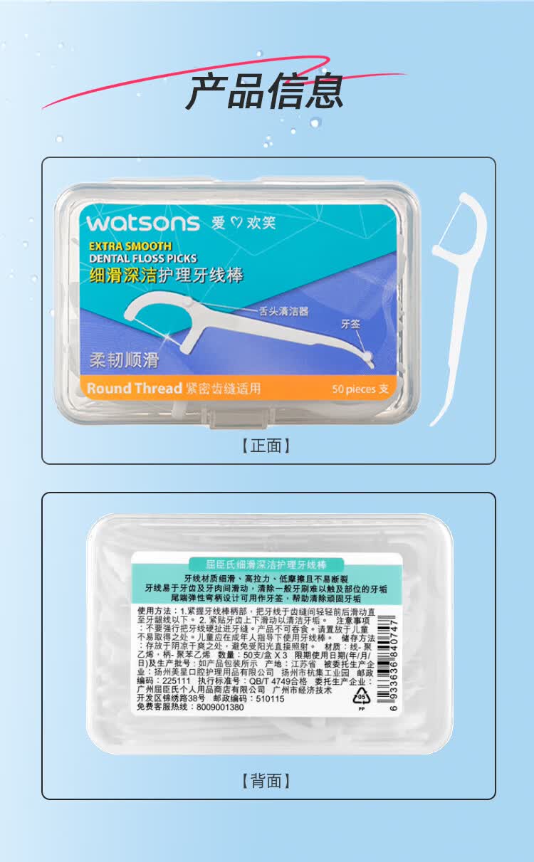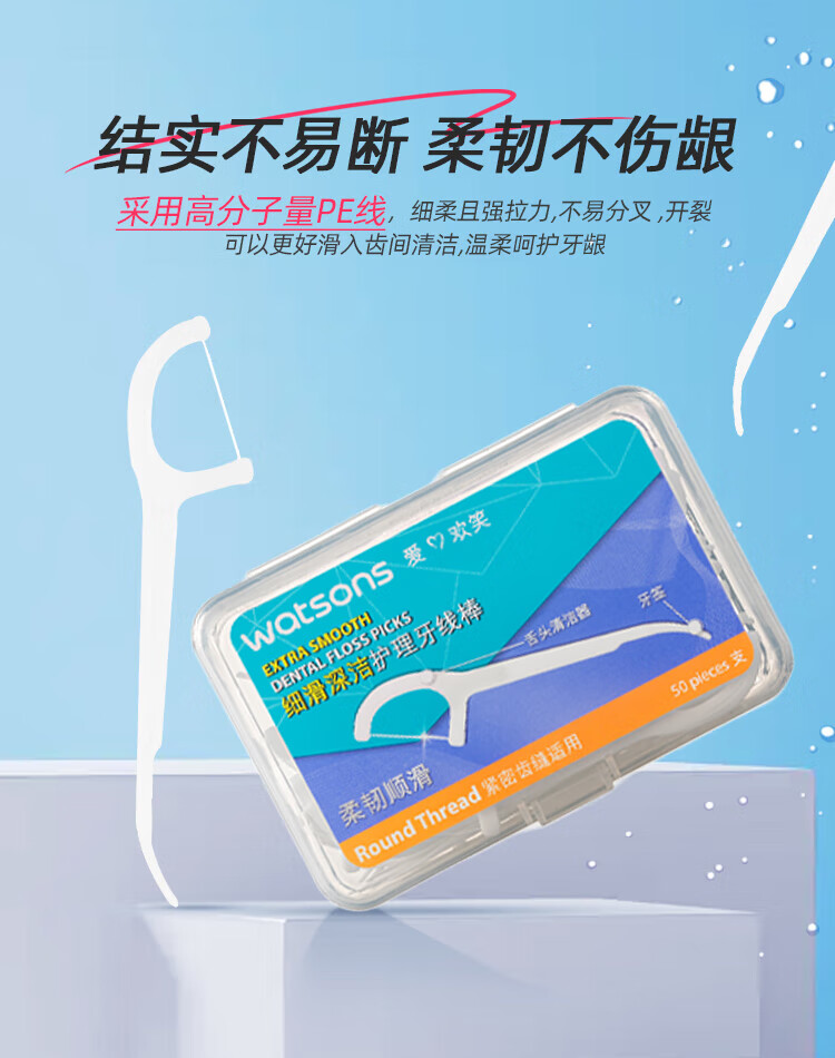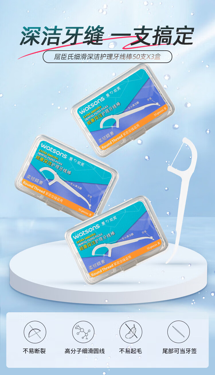 屈臣氏细滑深洁护理牙线棒50支x3盒(适用细密牙缝 韧度更强)