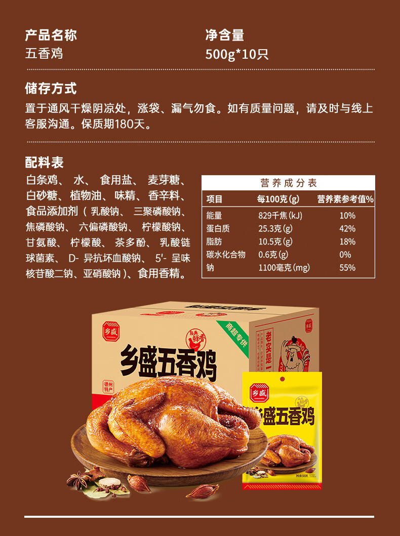 乡盛囤货五香鸡500g*10只装腊味熟食扒鸡烧鸡送礼纯肉礼盒