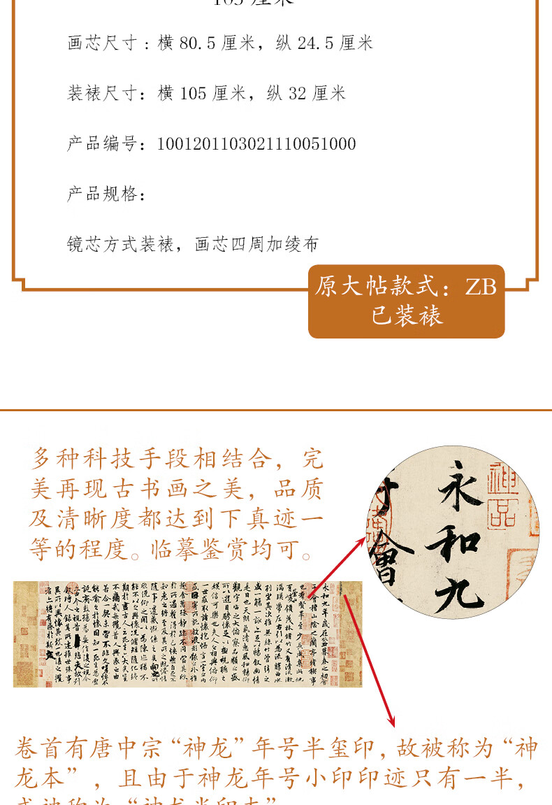 兰亭序冯承素临摹王羲之博物馆级别装饰艺术微喷神龙本高清复制品 兰亭序 镜芯装裱 无框 ZB款