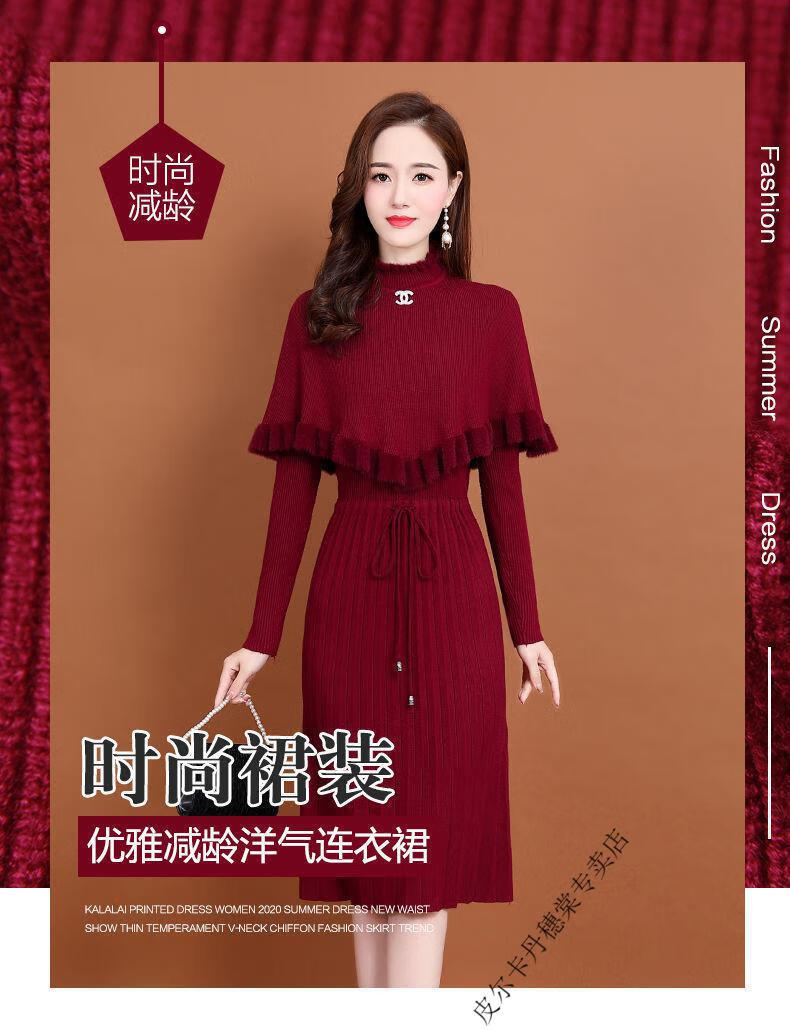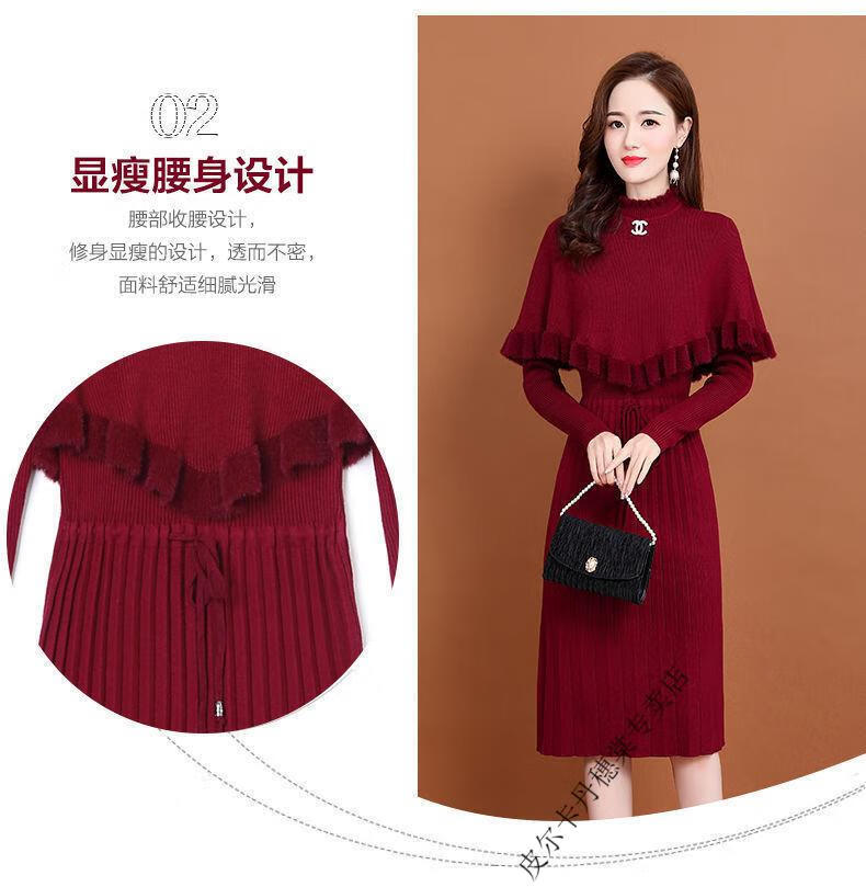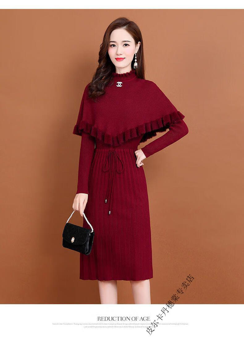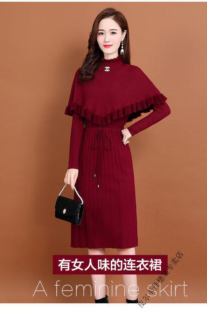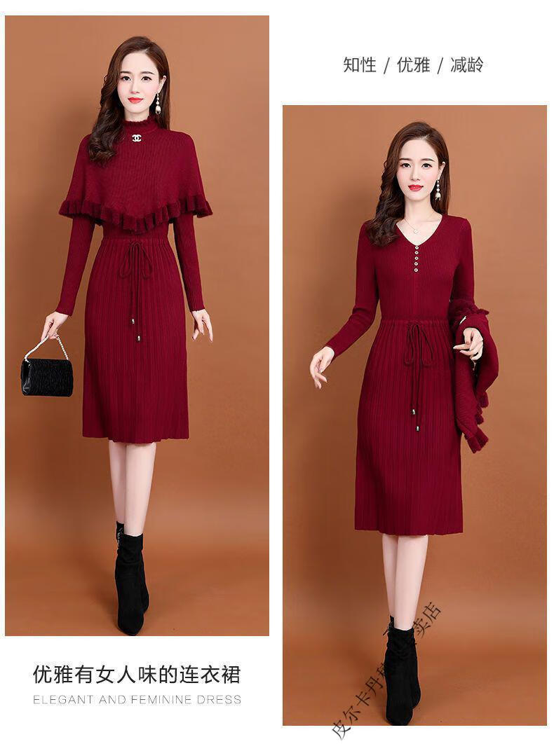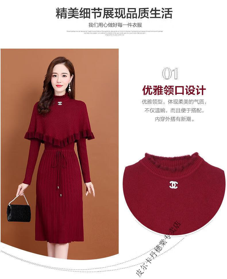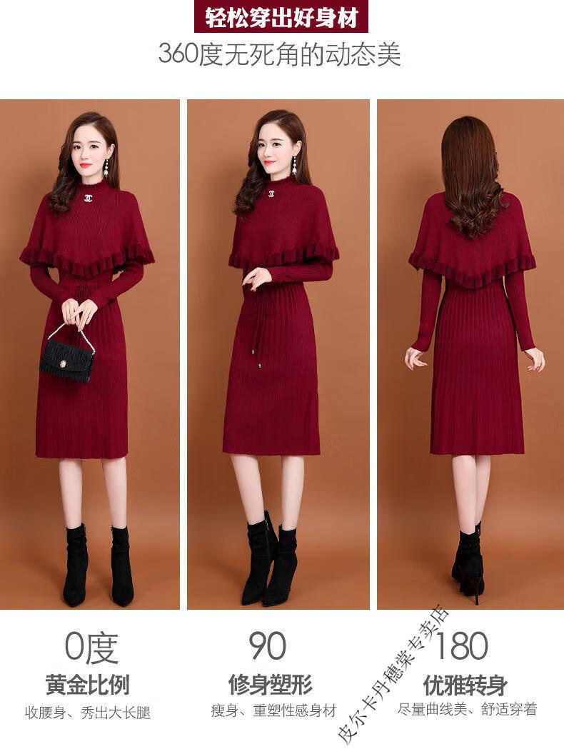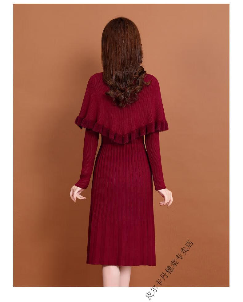 皮尔卡丹羊毛针织连衣裙女加绒加厚2026新款两件j套秋冬季斗篷气质修身显 酒红色 3XL 建议135-150斤