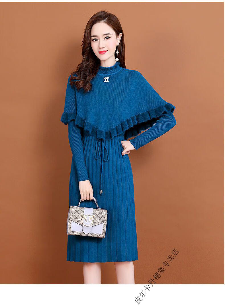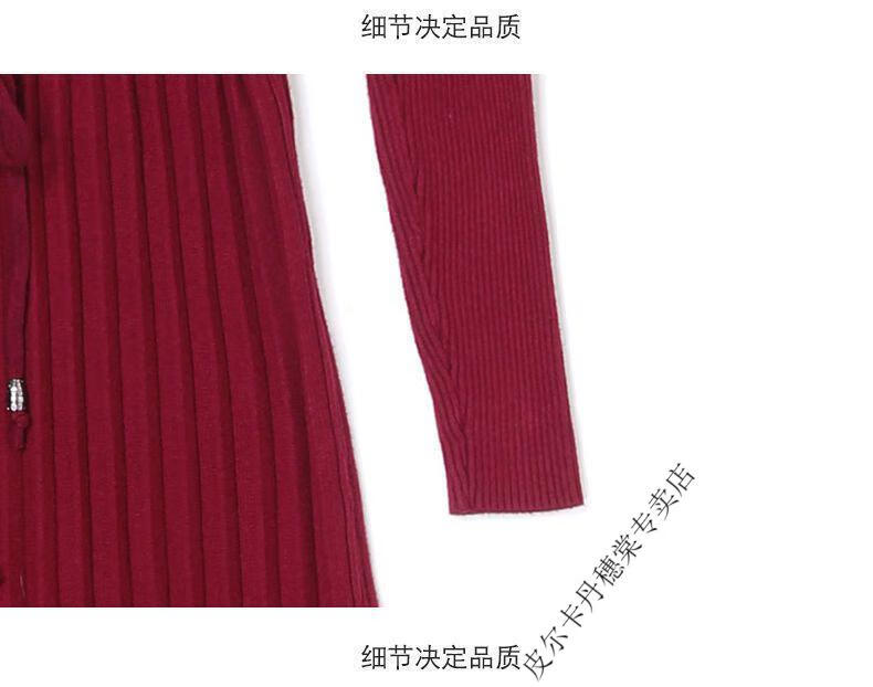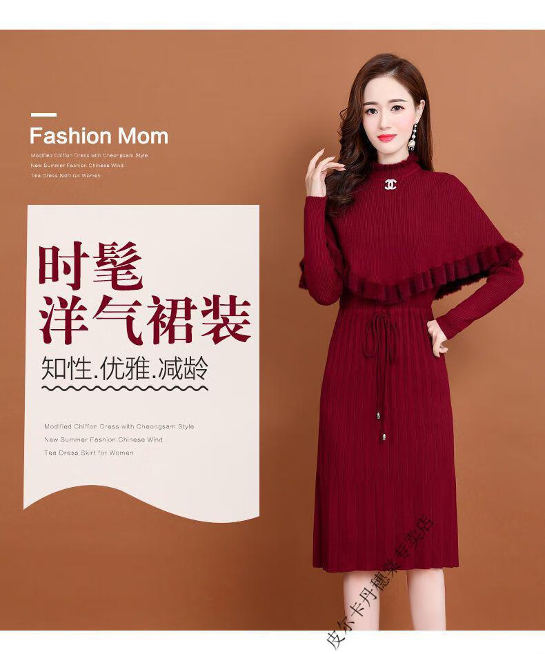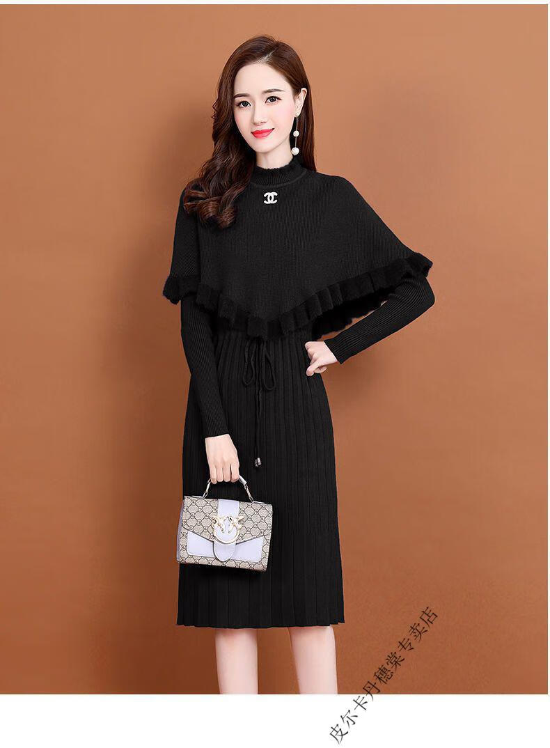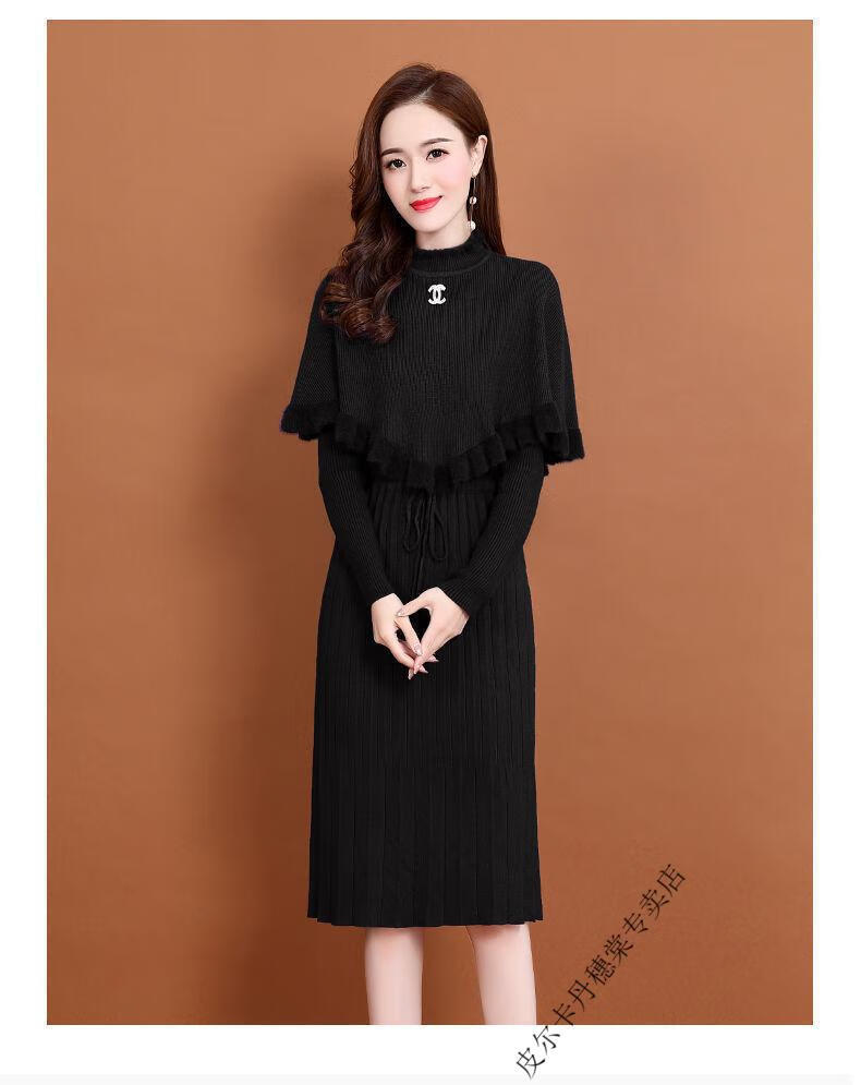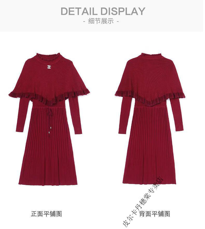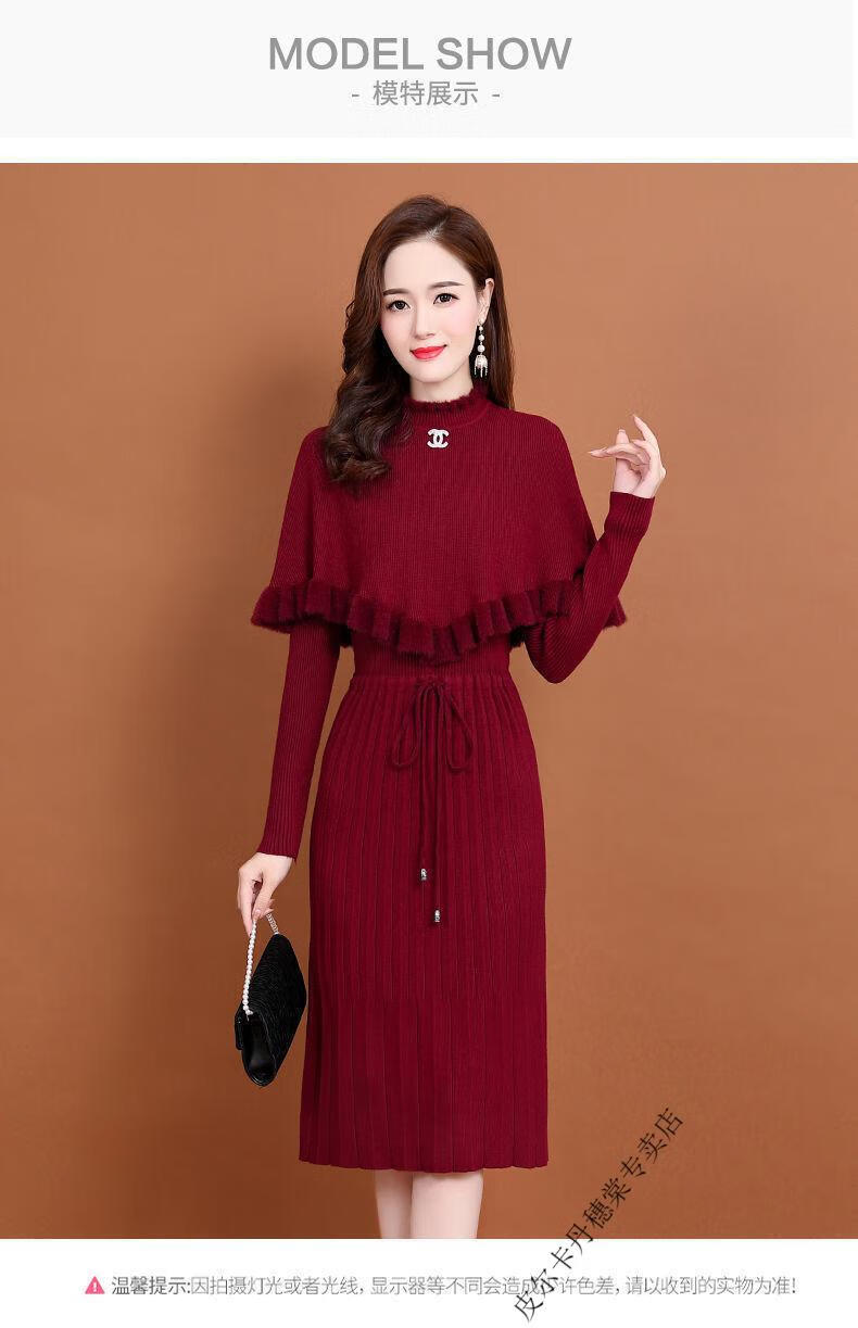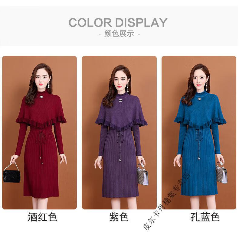 皮尔卡丹羊毛针织连衣裙女加绒加厚2026新款两件j套秋冬季斗篷气质修身显 酒红色 3XL 建议135-150斤
