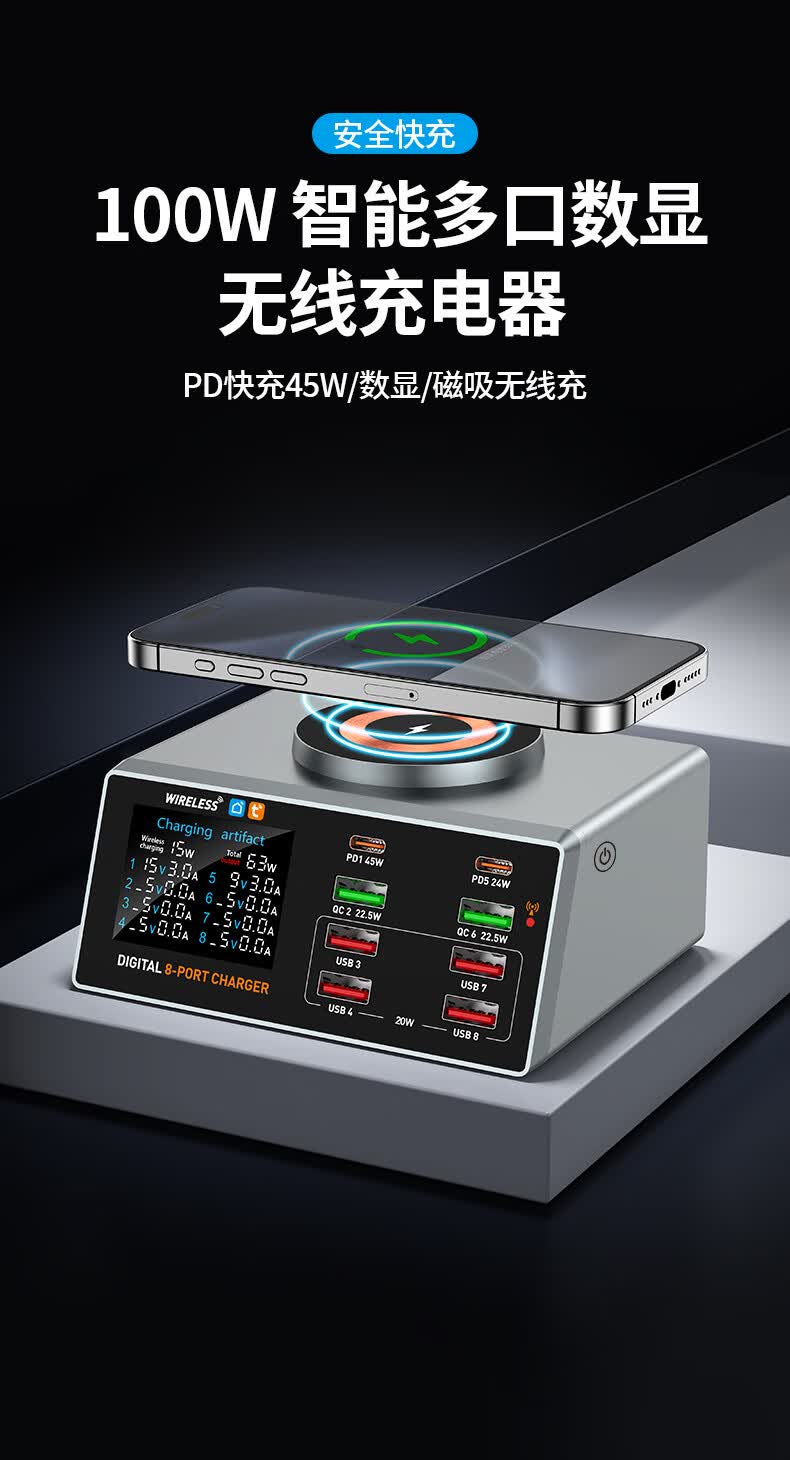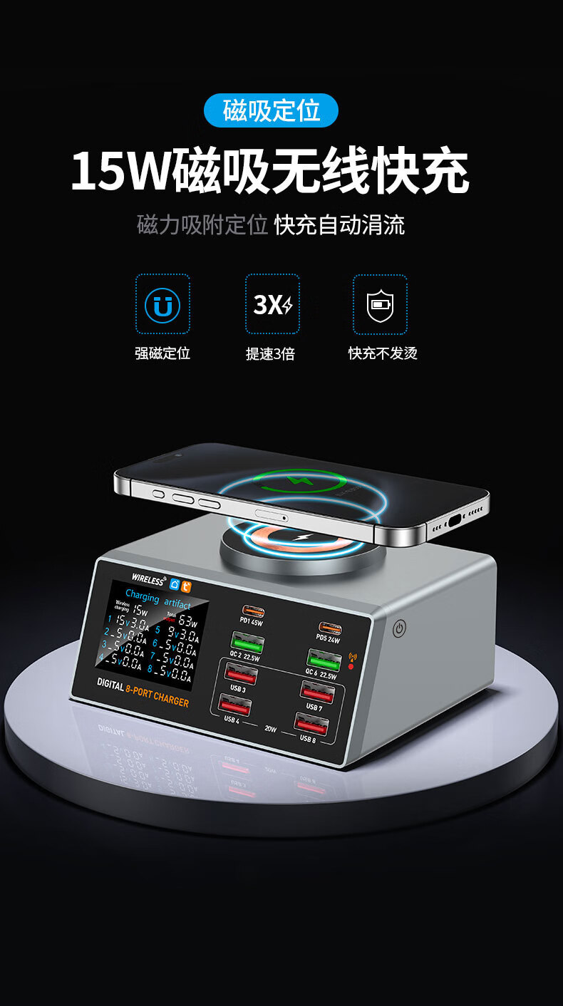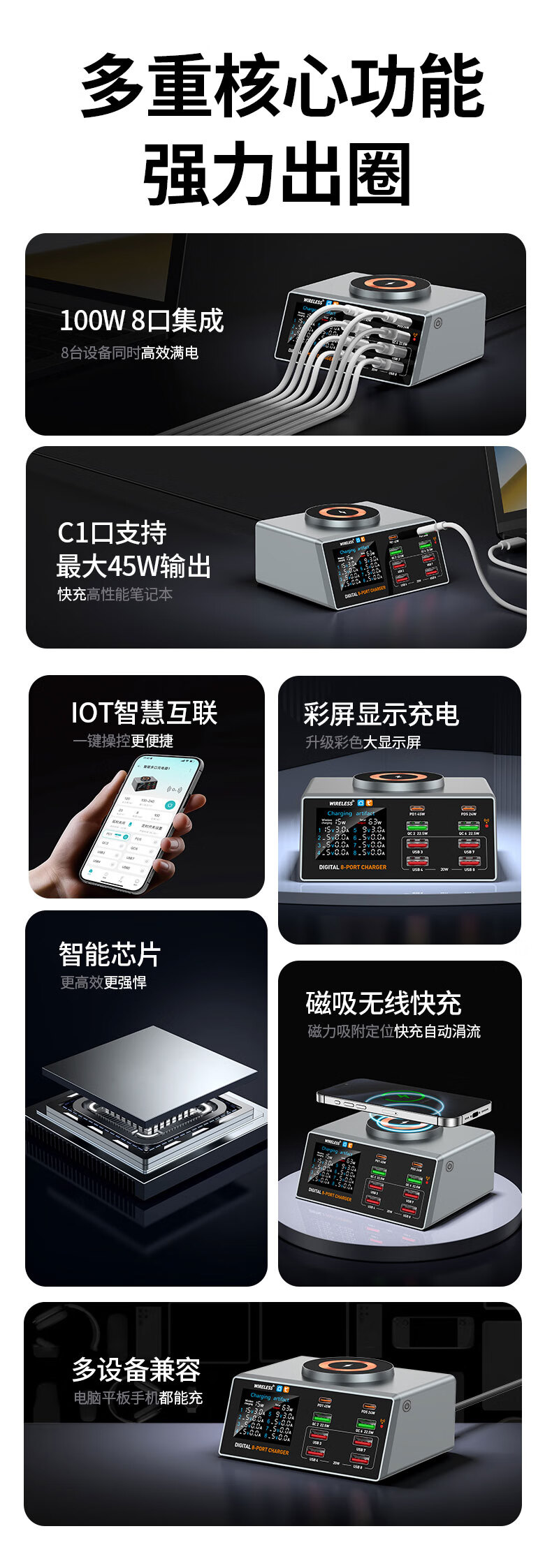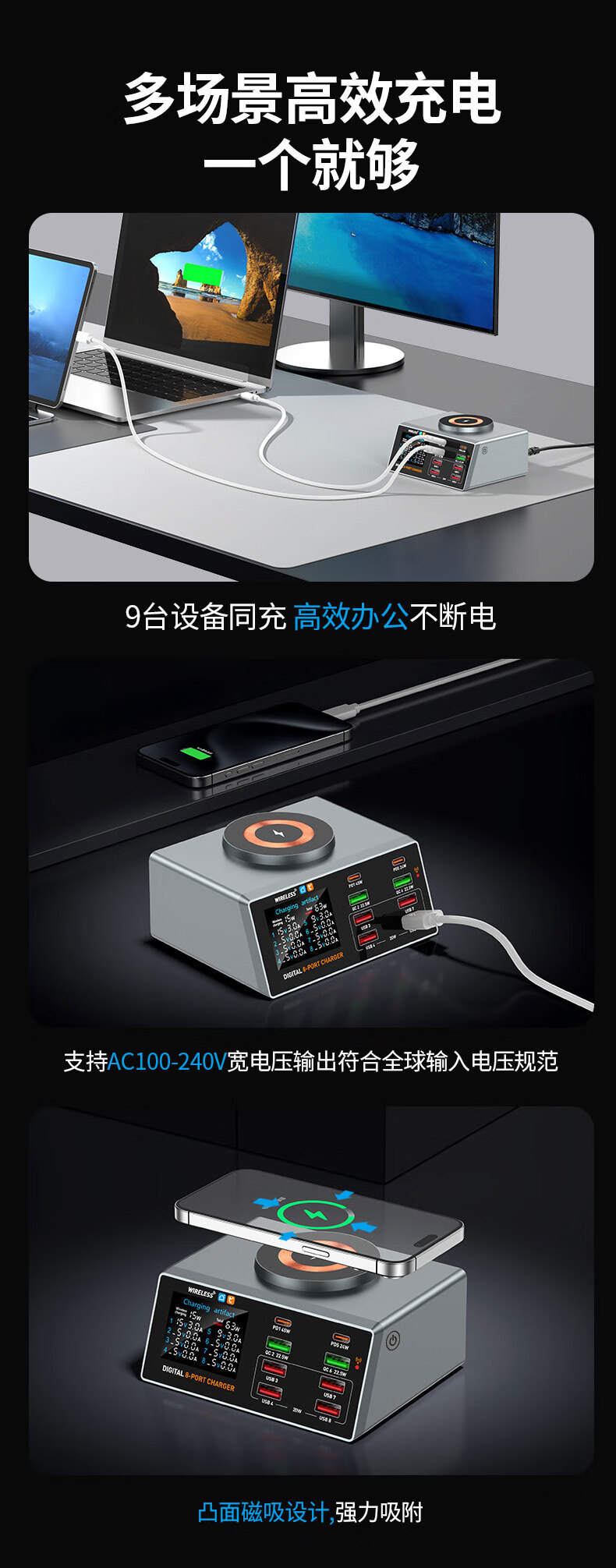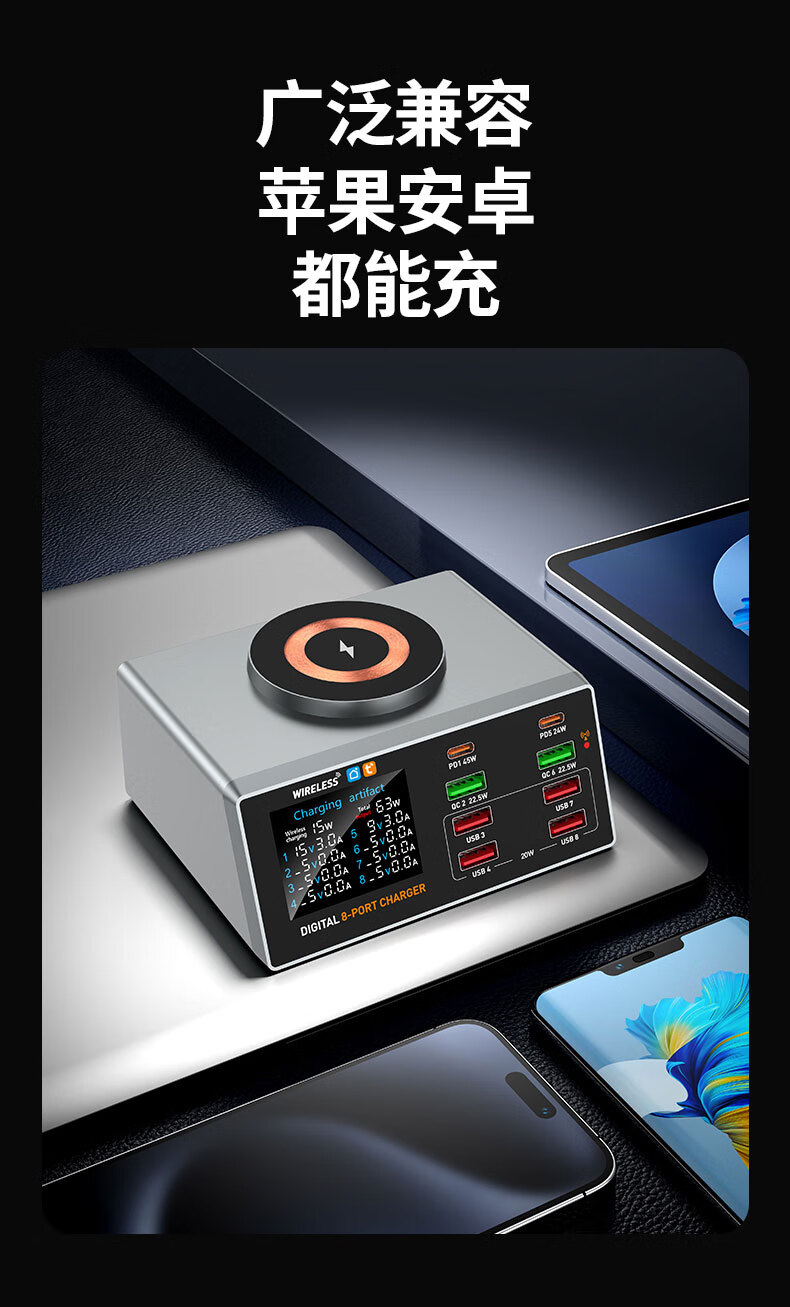 万隆欣桌面充电站多口usb快充PD100W大功率智能屏显闪充坞适用苹果华为手机笔记本通用插座 【APP控制款】充电器无线充磁吸定位【100W】