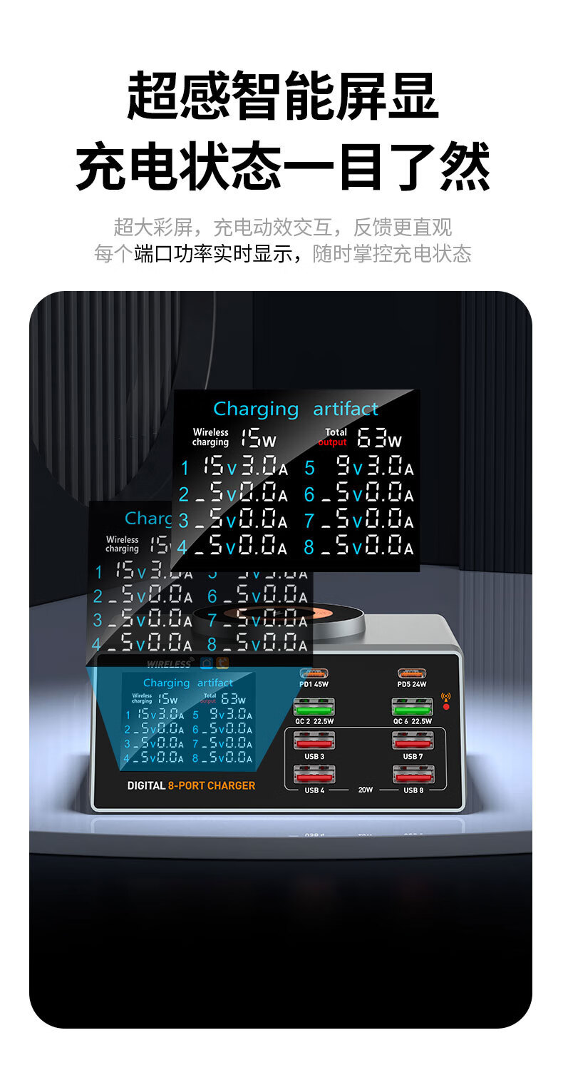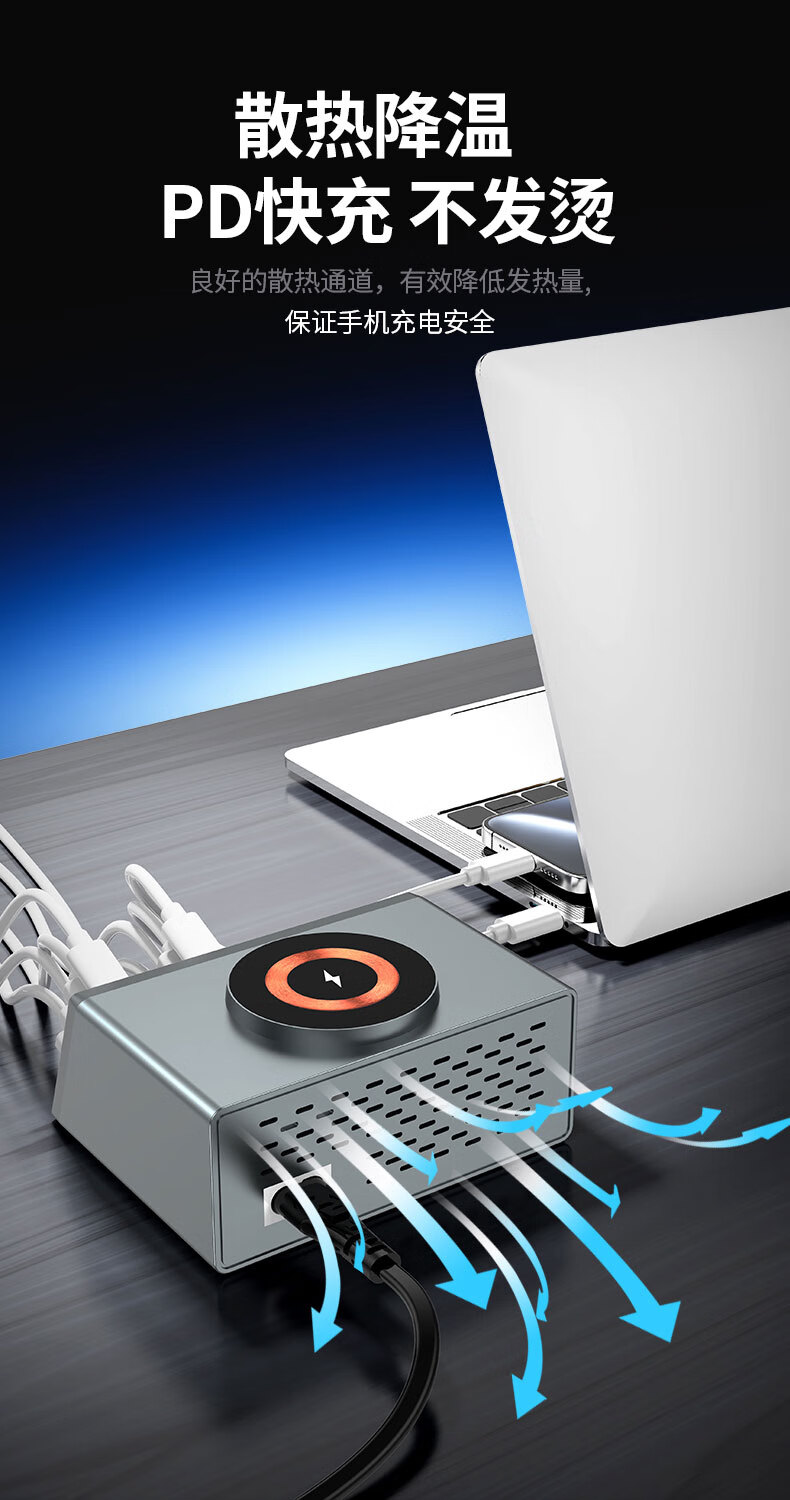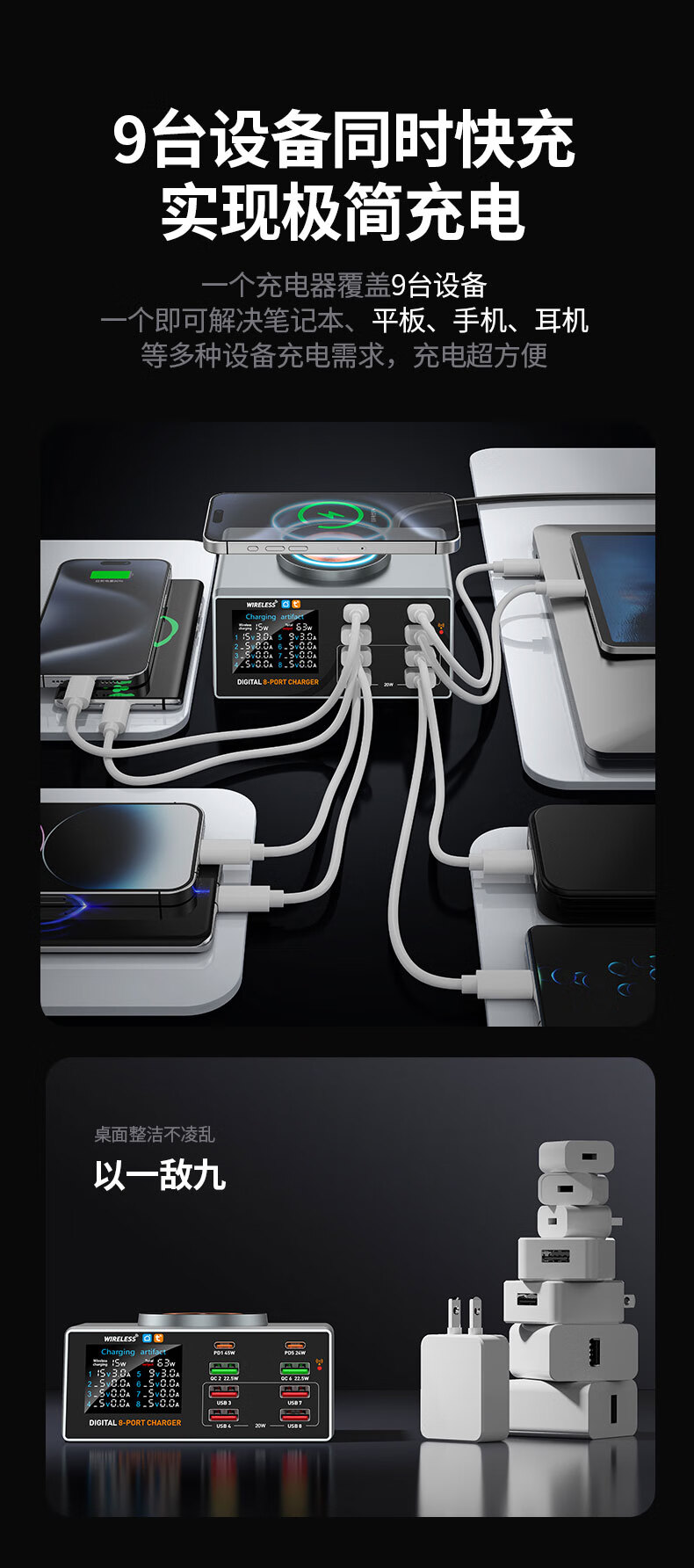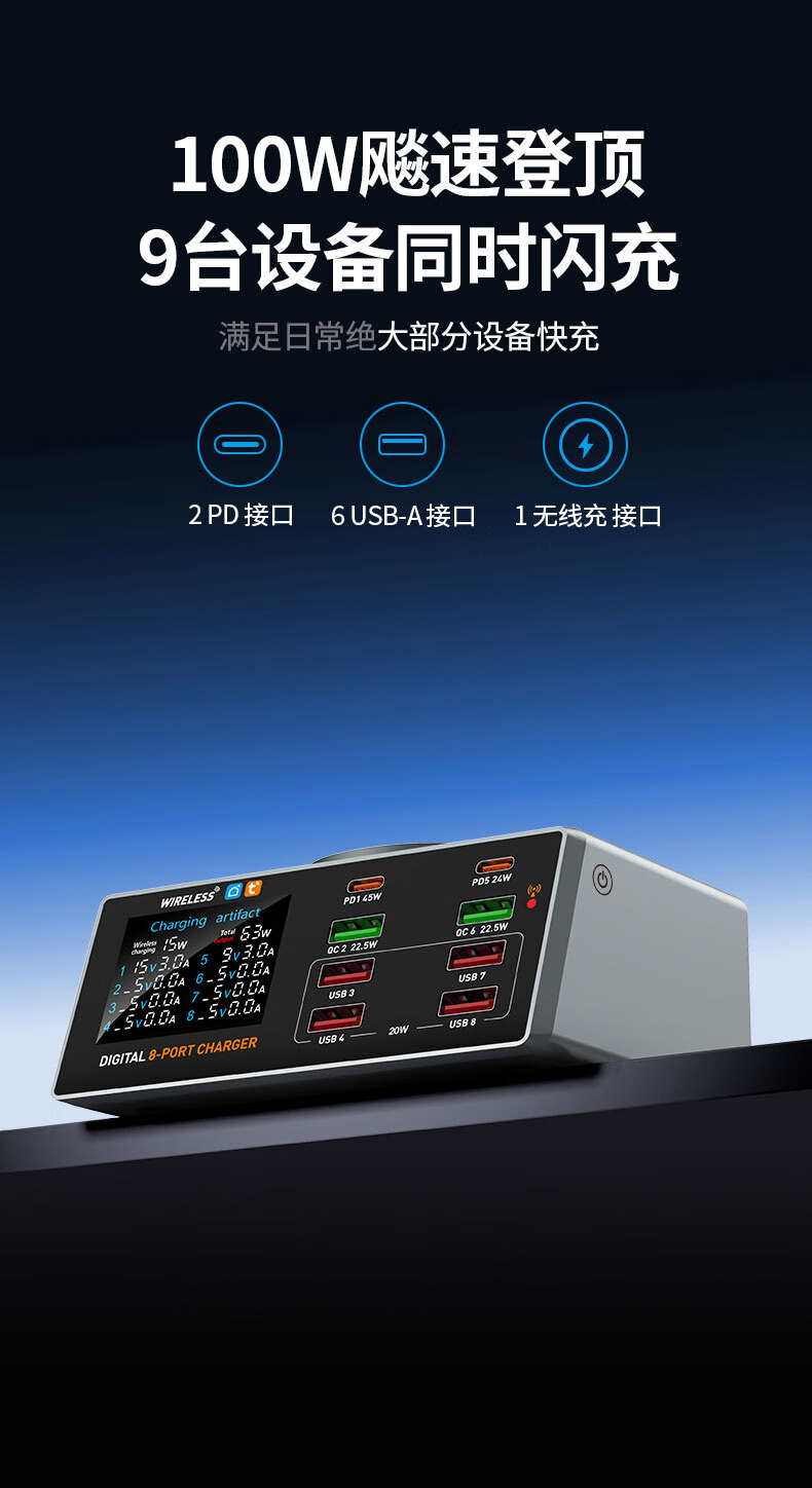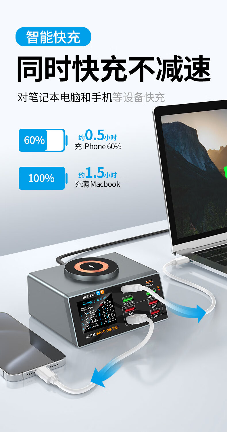 万隆欣桌面充电站多口usb快充PD100W大功率智能屏显闪充坞适用苹果华为手机笔记本通用插座 【APP控制款】充电器无线充磁吸定位【100W】