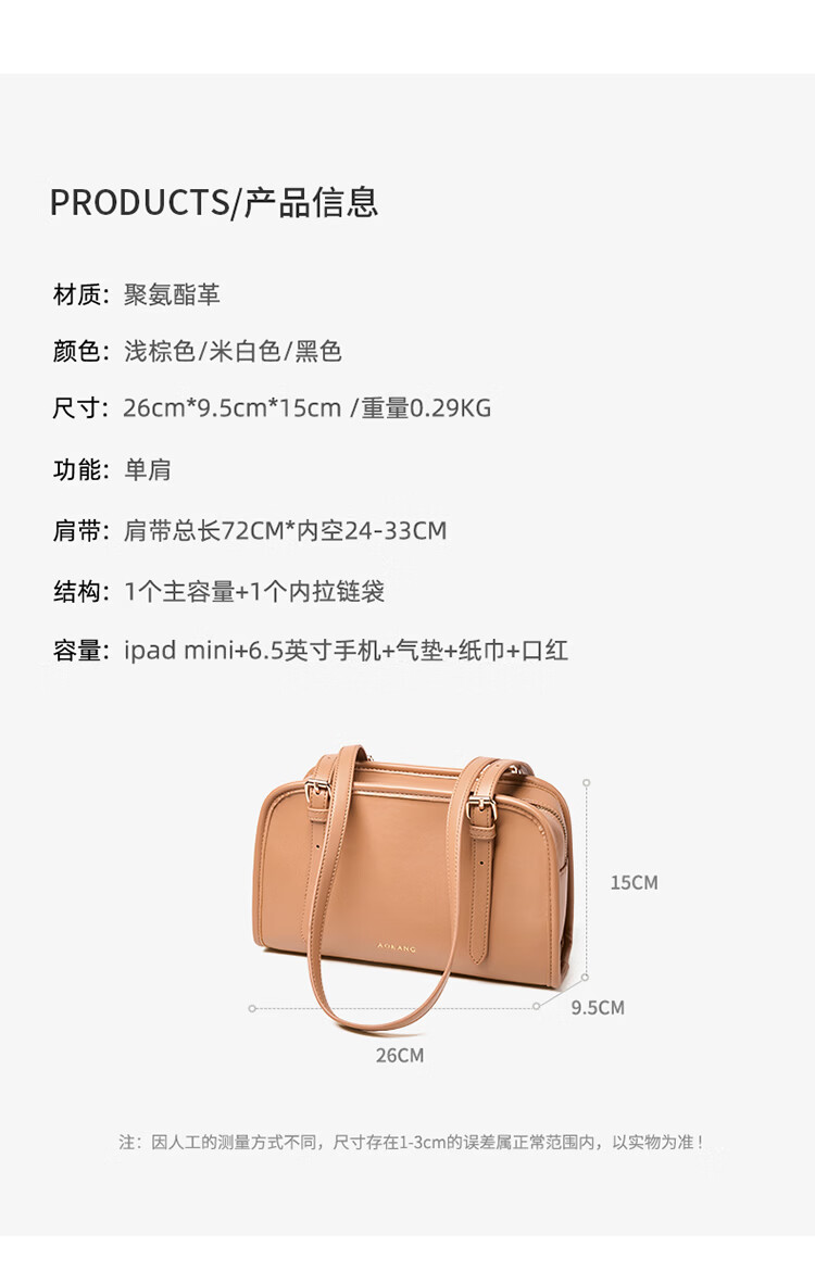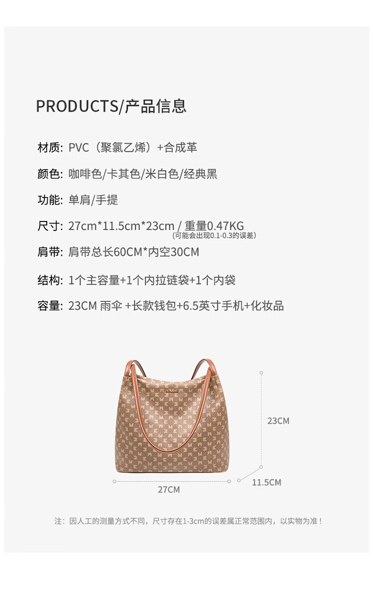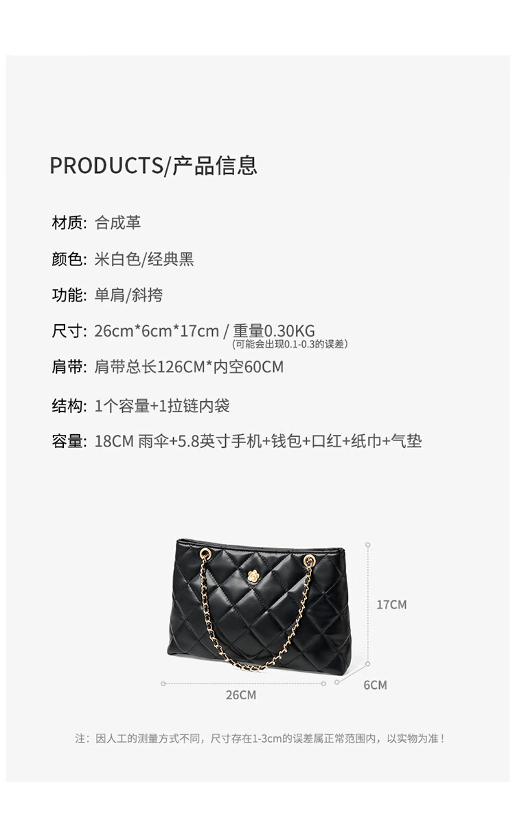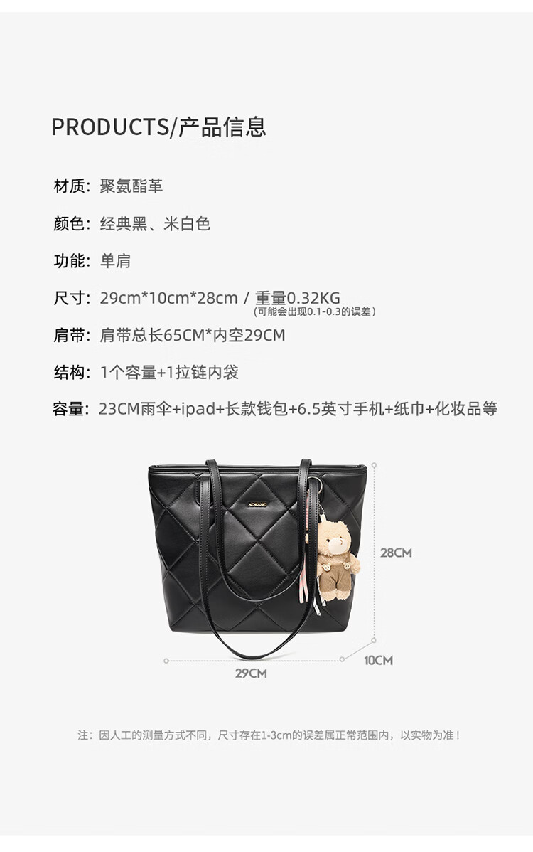 polene波灵恩[明星同款]Cyme荔枝牛皮大容量通勤托特包手提单肩包 黑色