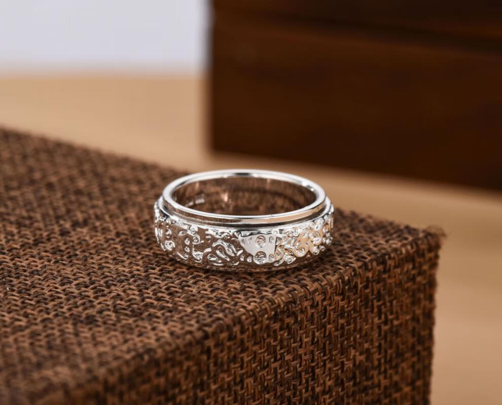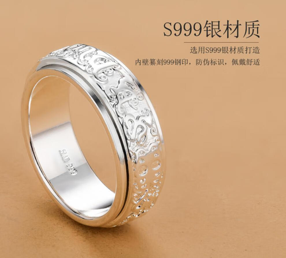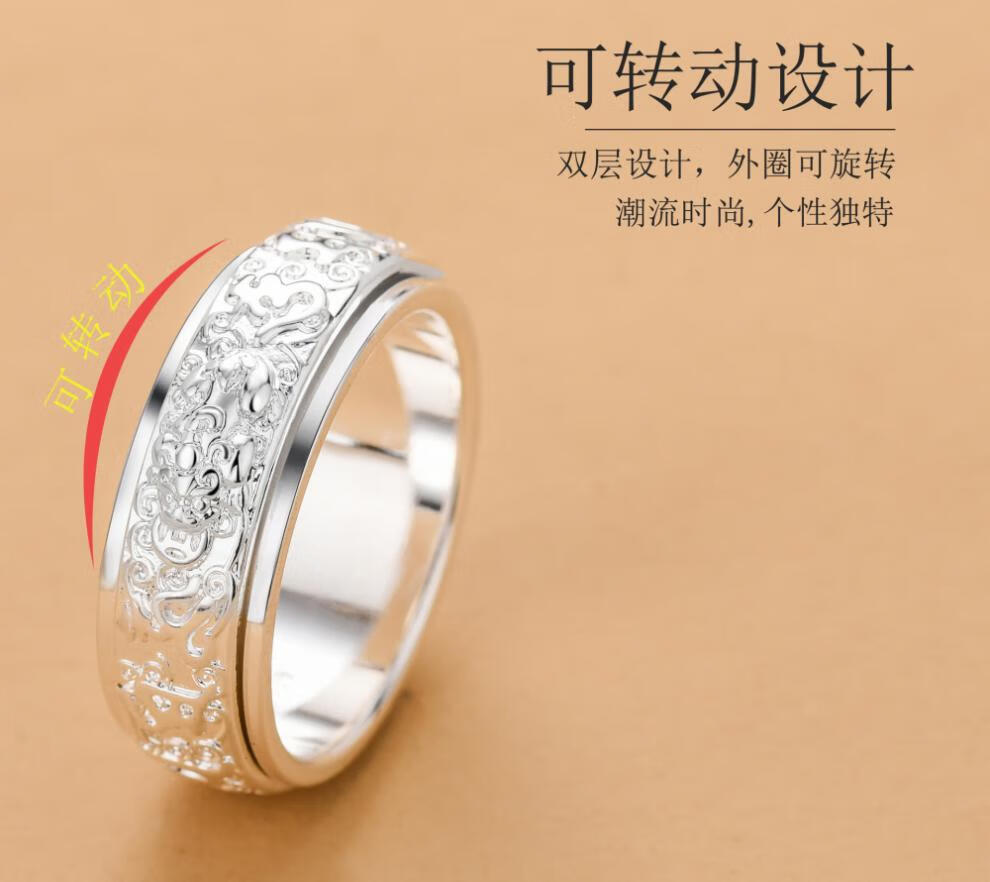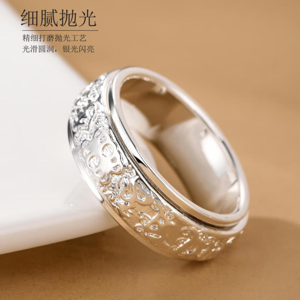 老银匠六字真言999纯银戒指男士国潮貔貅可转动单身旋转食指环网红尾戒 17号【手指周长约57MM】