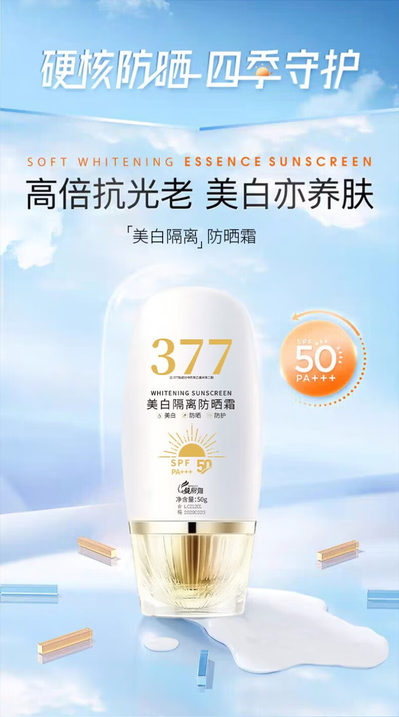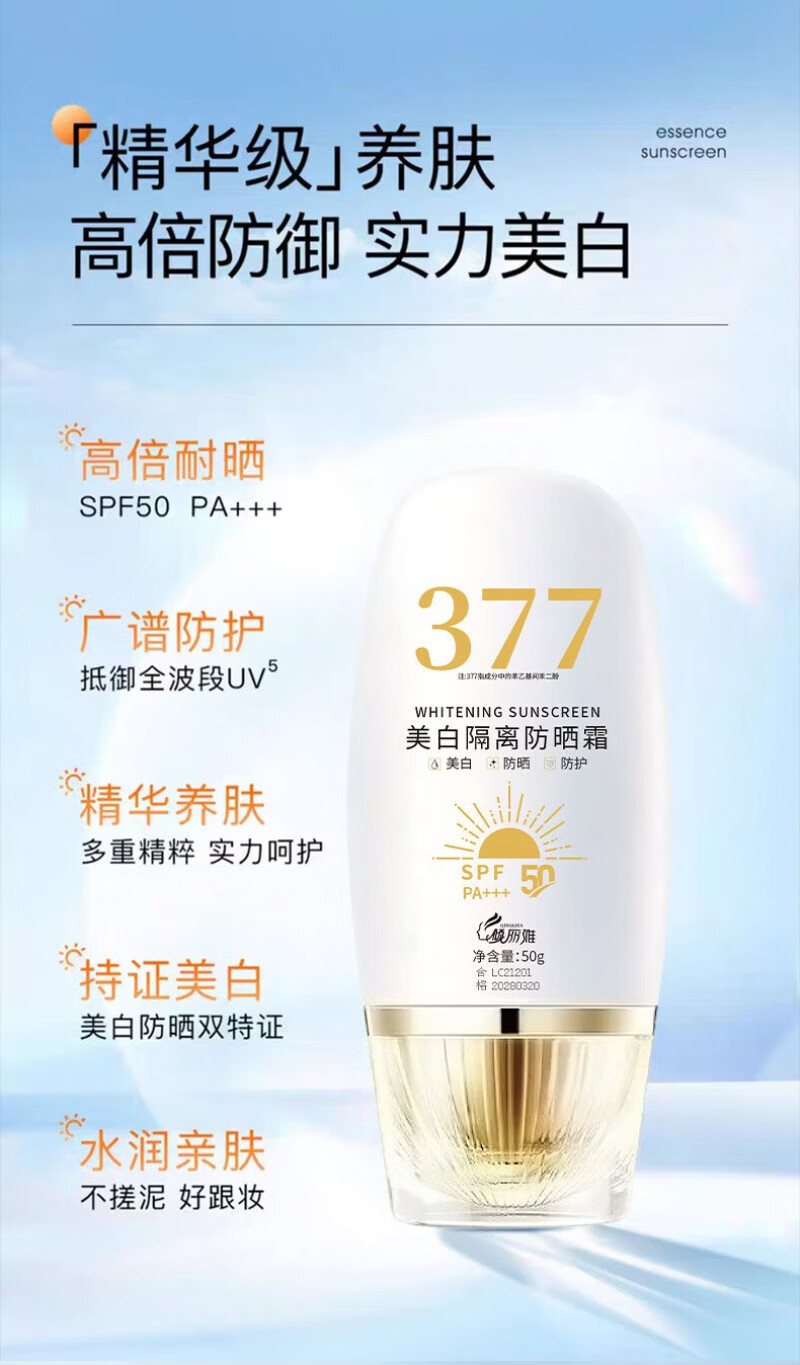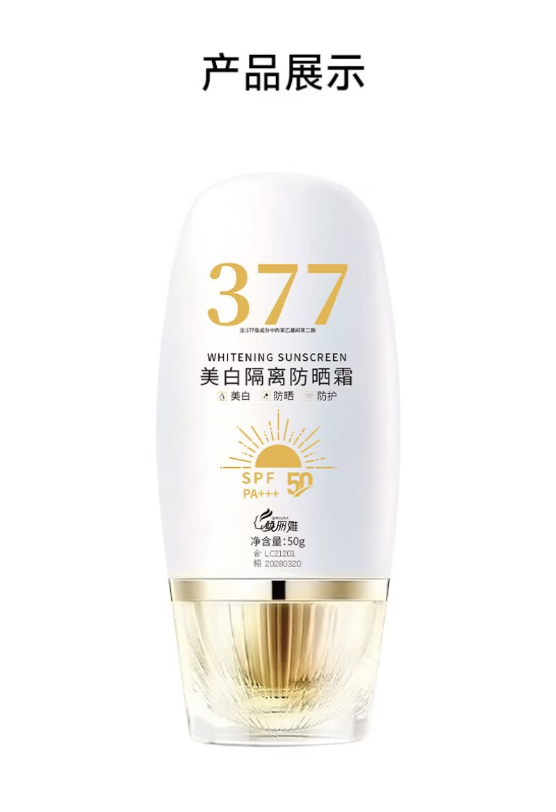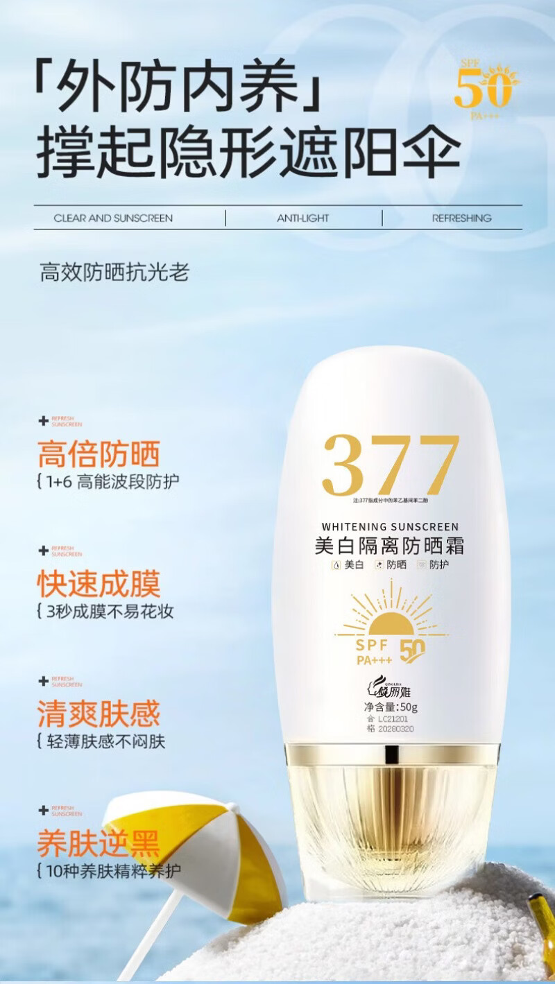 倾丽雅377美白防晒霜美白提亮防晒三合一隔离遮瑕清爽防紫外线防水防汗 1瓶50g【体验装】