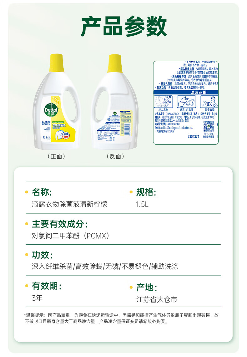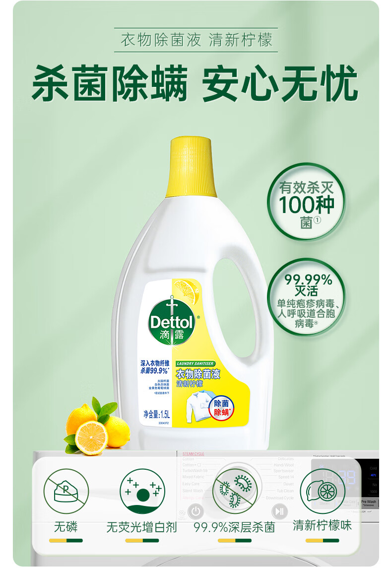 滴露(Dettol)衣物除菌液 柠檬1.5L 儿童可用衣物消毒液杀菌除螨可配洗衣液