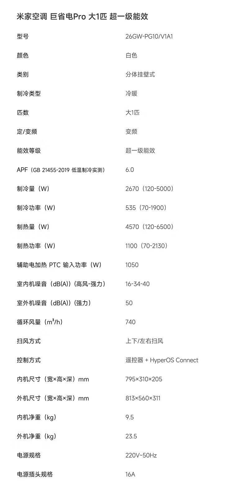 小米(MI)米家空调 巨省电Pro 大一匹 超一级能效 空调挂机 26GW-PG10/V1A1 整机十年质保