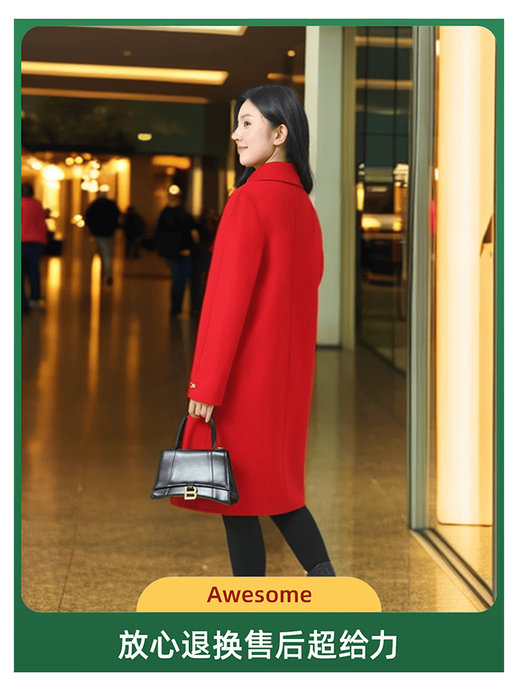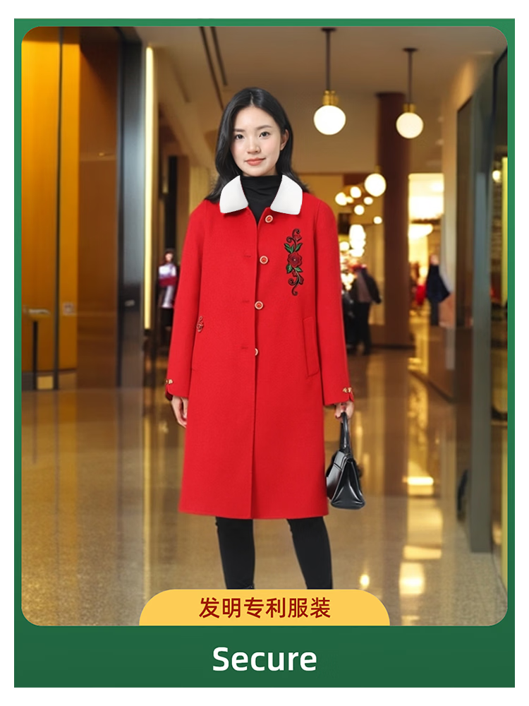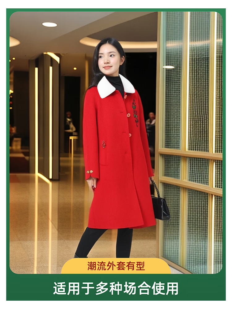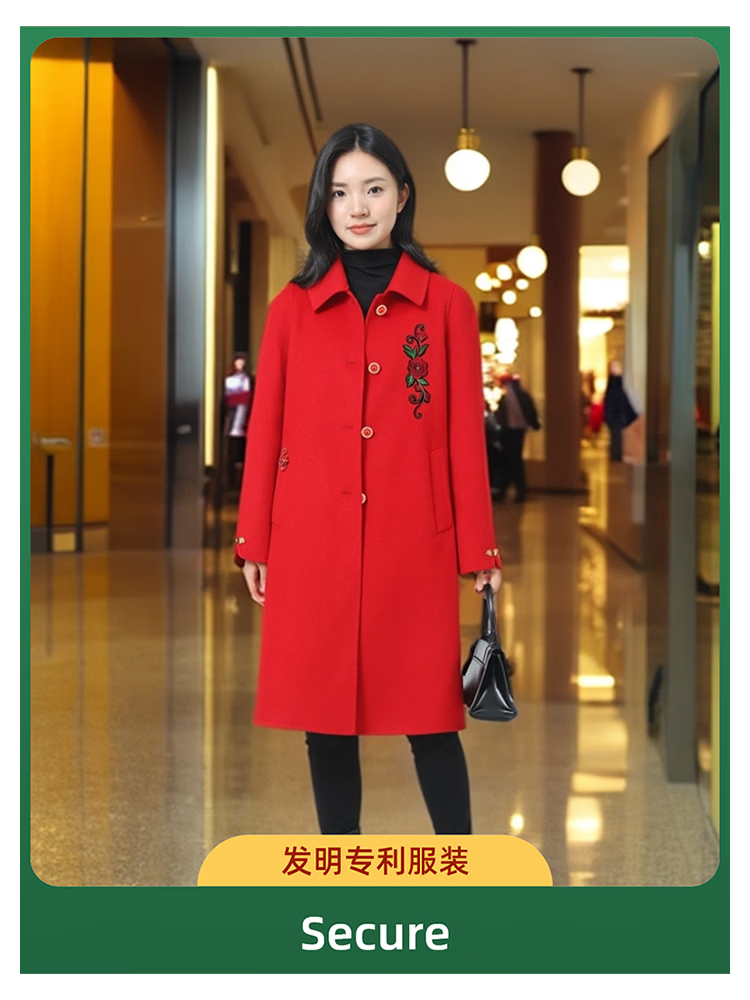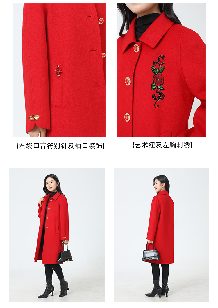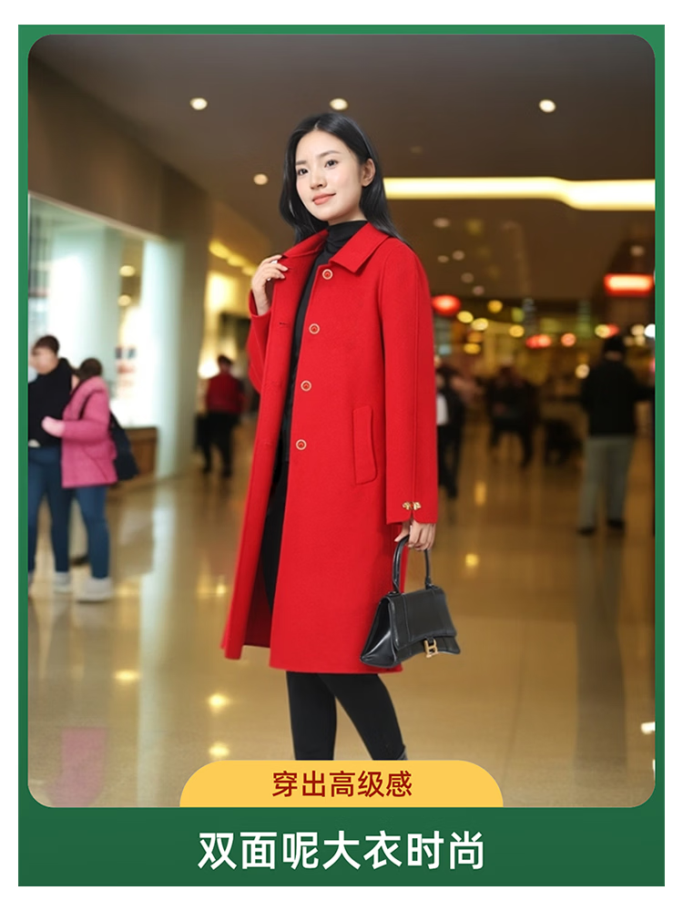 全毛双面呢中长女装大衣发明专利产品全品类春秋冬三季适用毛呢类 红色2, 厚款, 喜欢胸花下单请备注 2XL 165-170 建议净胸围96CM在毛衣外穿
