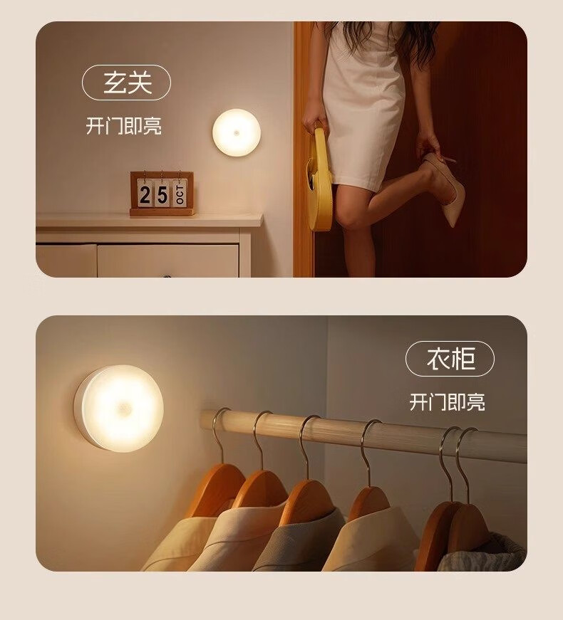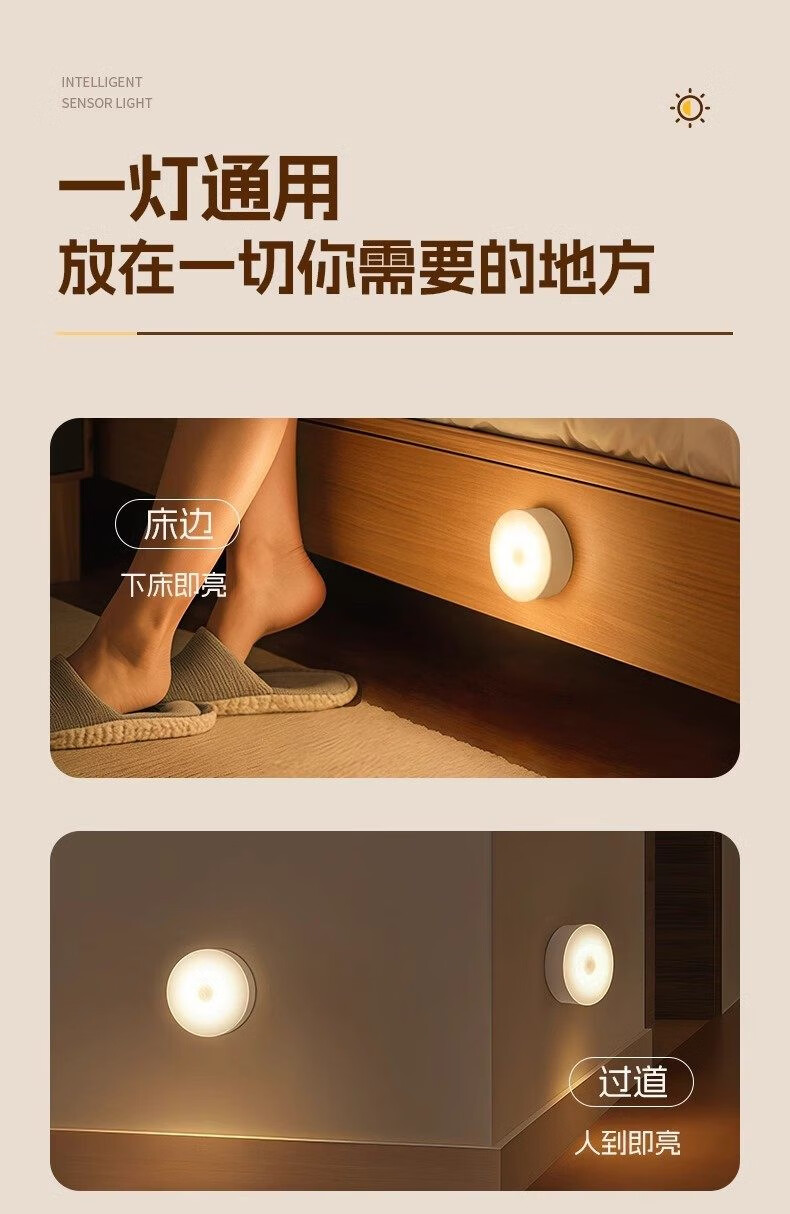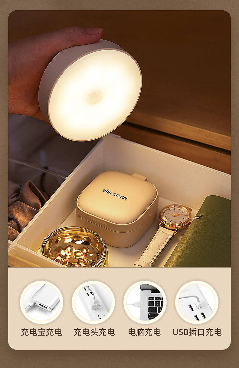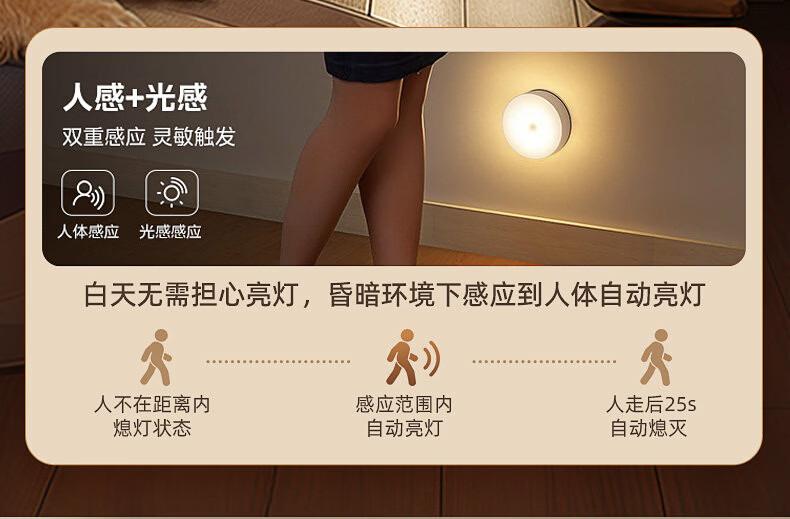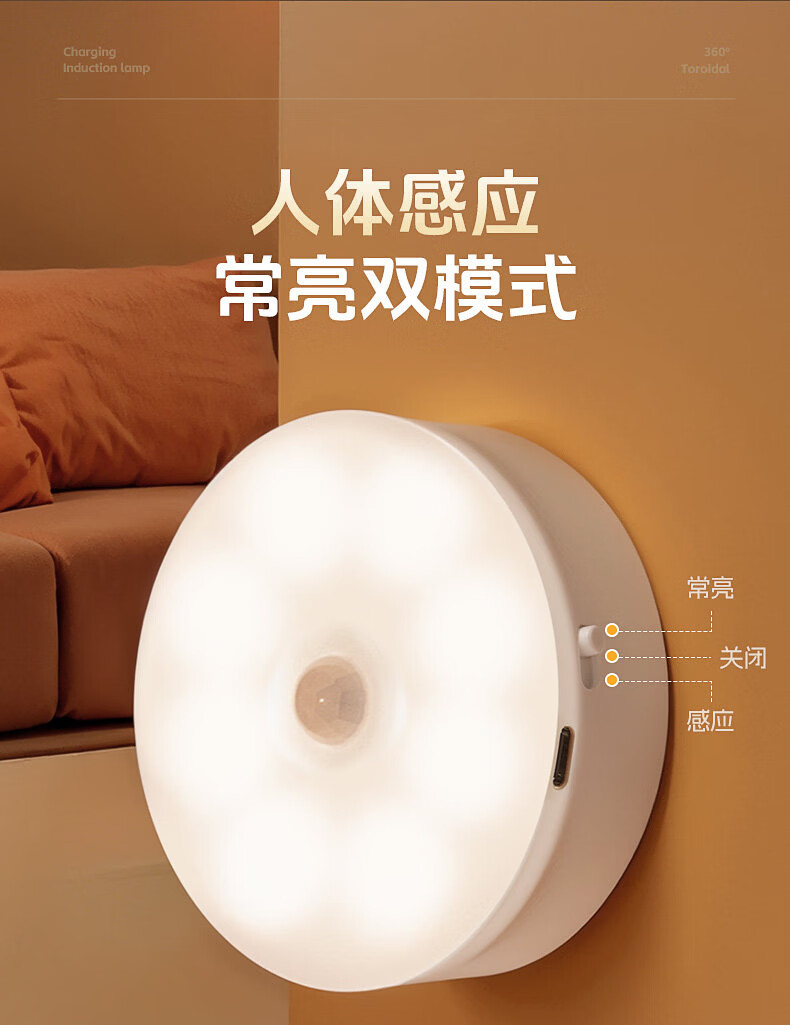 GERTHRON德国智能人体自动感应小夜灯充电入户楼道走廊即亮夜间起过道磁吸 【单只装】人体感应-常亮-暖白光