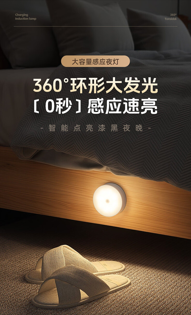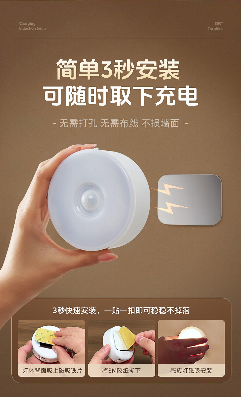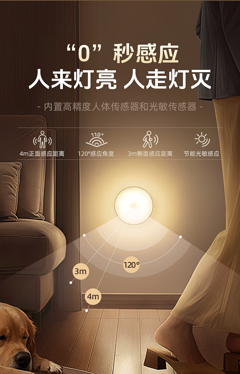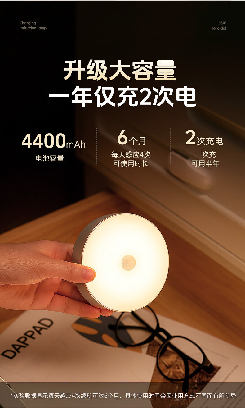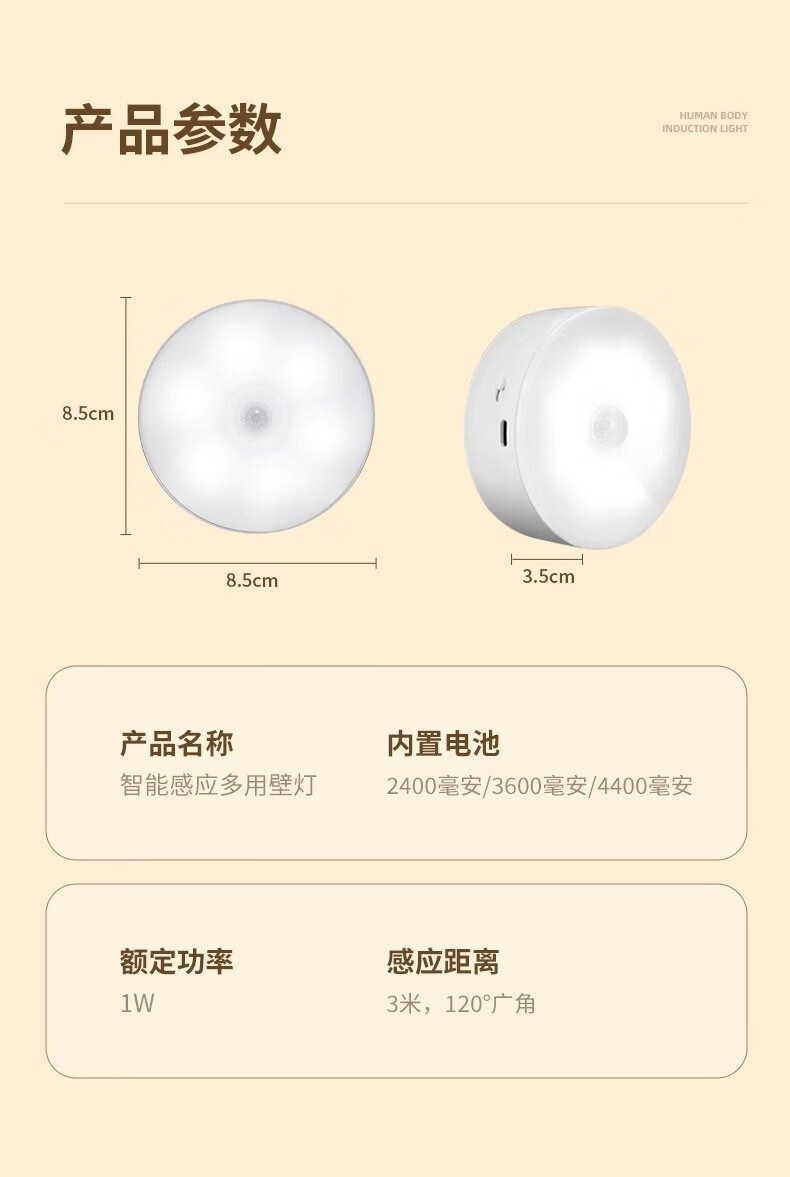 GERTHRON德国智能人体自动感应小夜灯充电入户楼道走廊即亮夜间起过道磁吸 【单只装】人体感应-常亮-暖白光