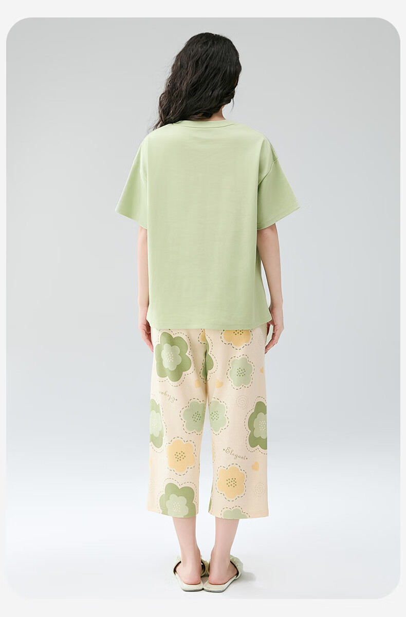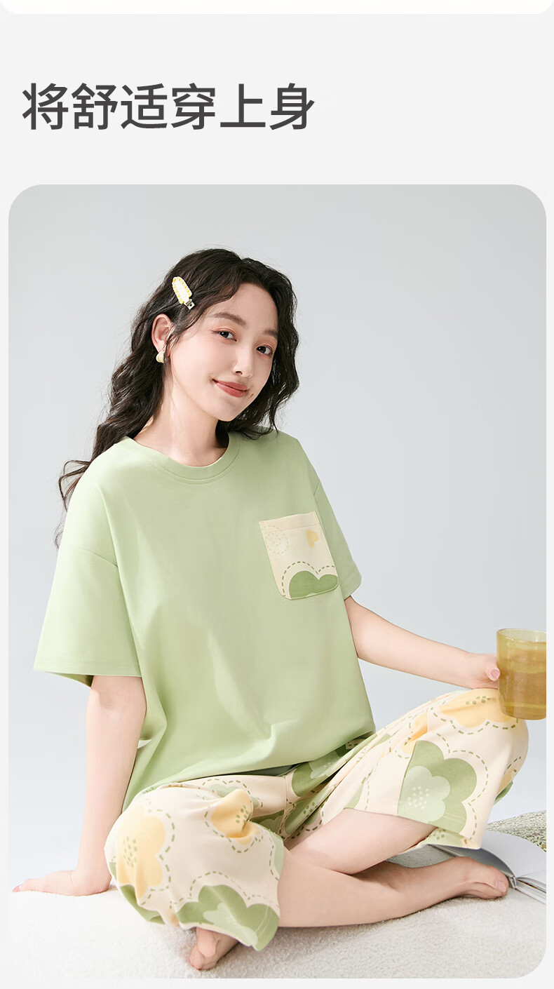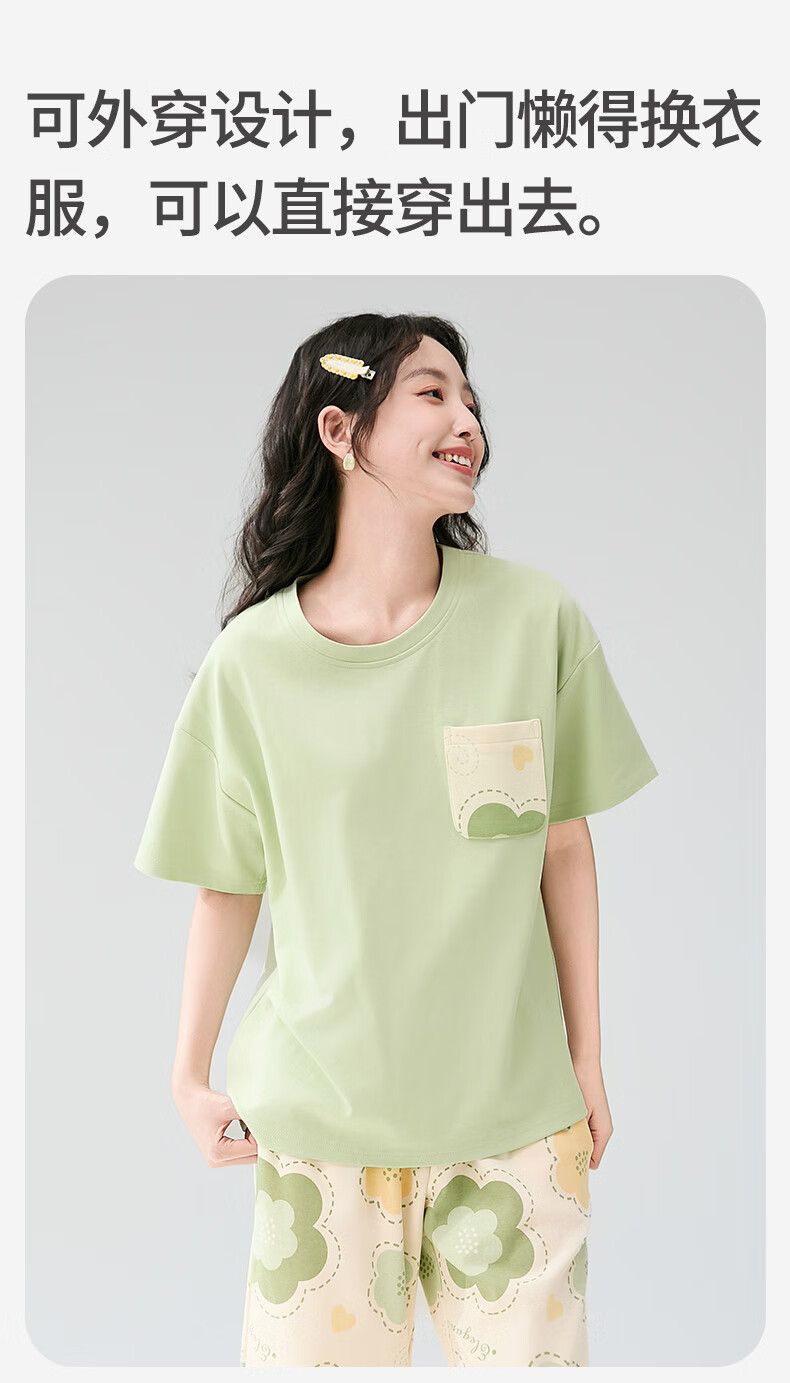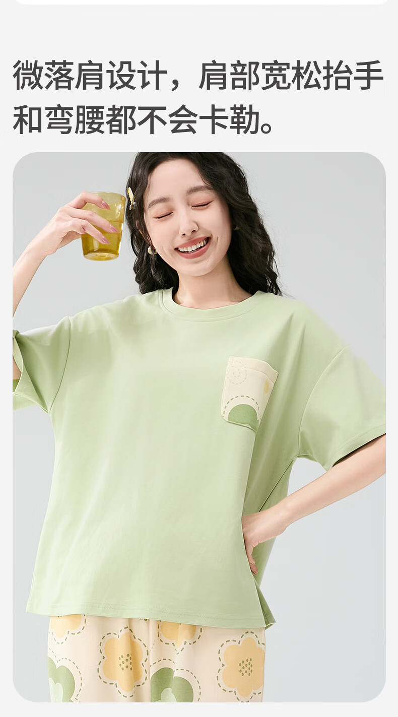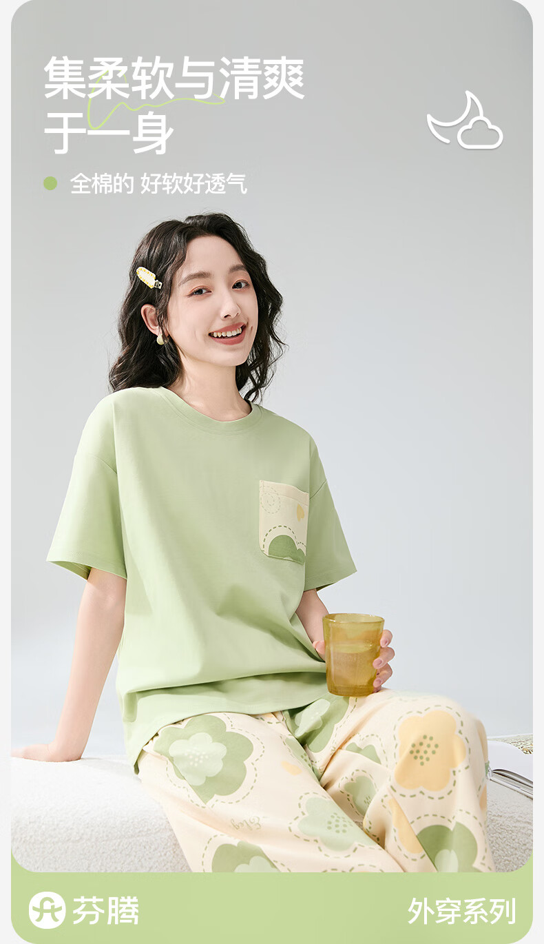 芬腾睡衣女【100%纯棉】薄款圆领可外穿新品家居服套装高级感 浅绿 L