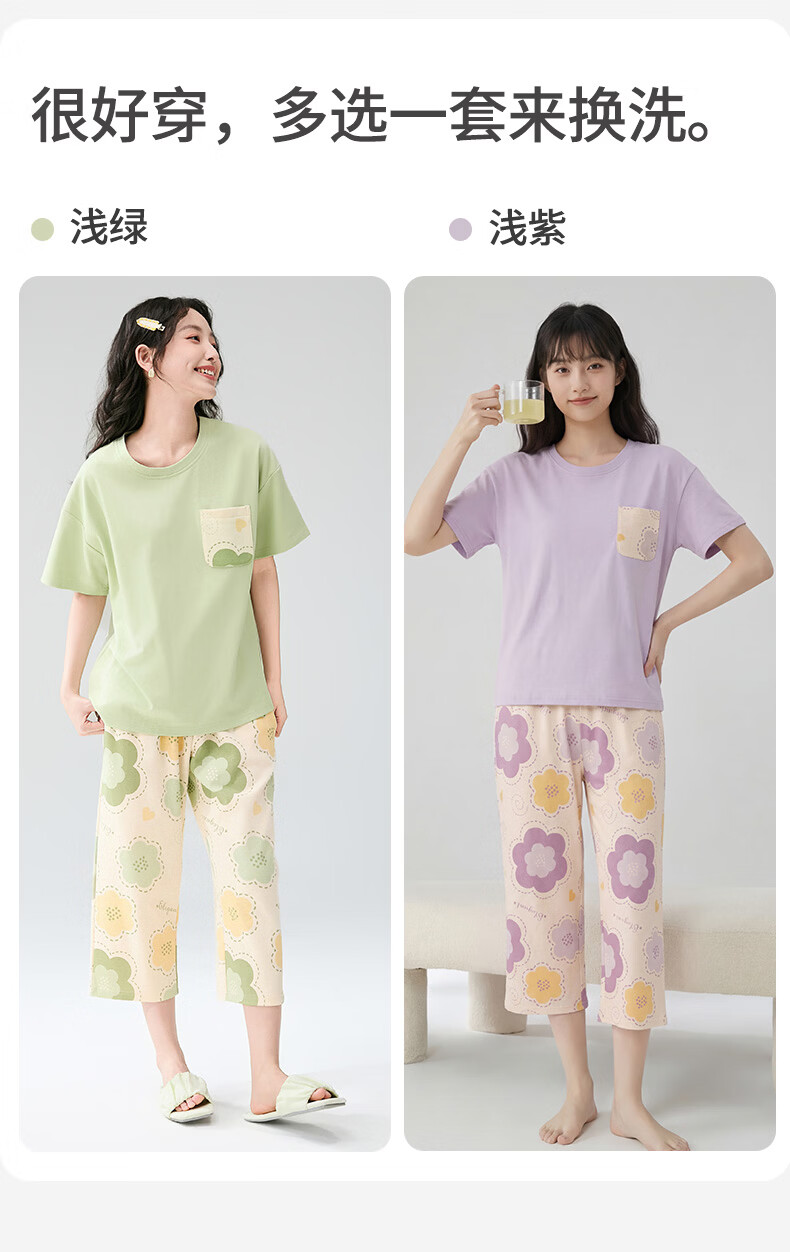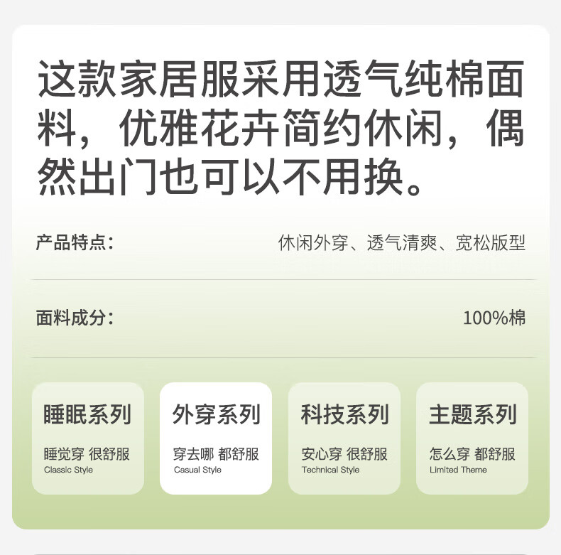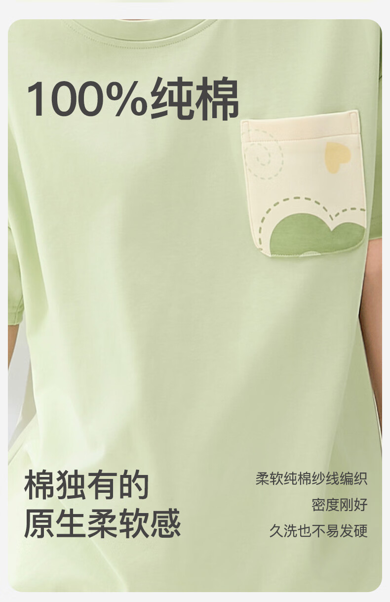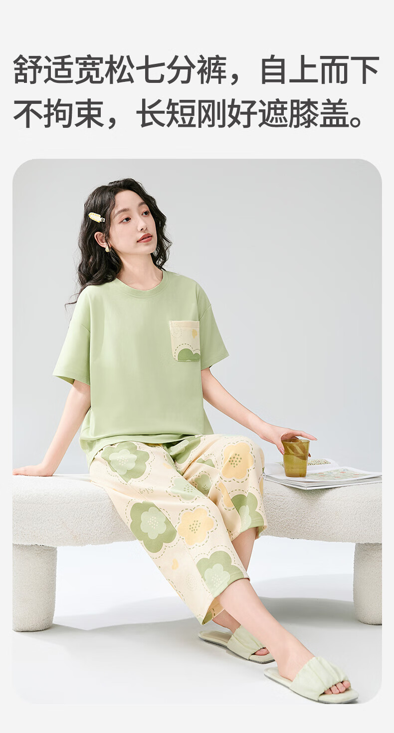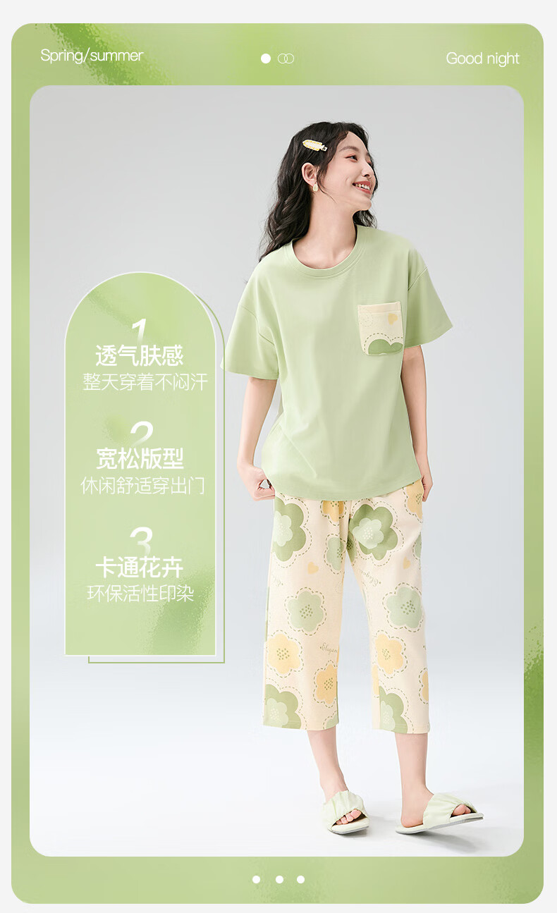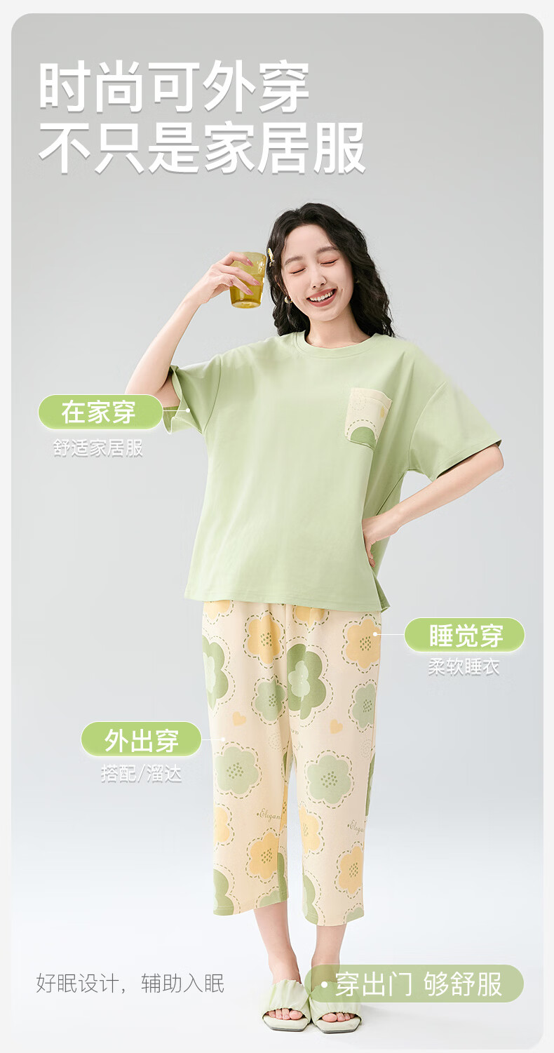 芬腾睡衣女【100%纯棉】薄款圆领可外穿新品家居服套装高级感 浅绿 L