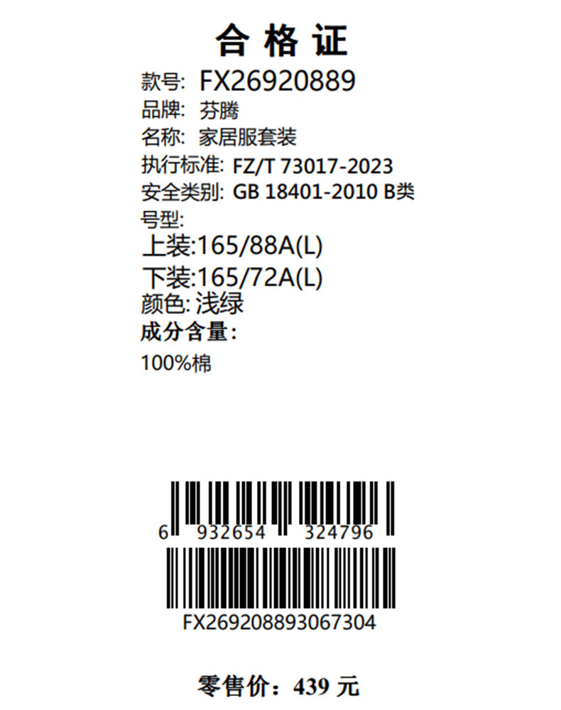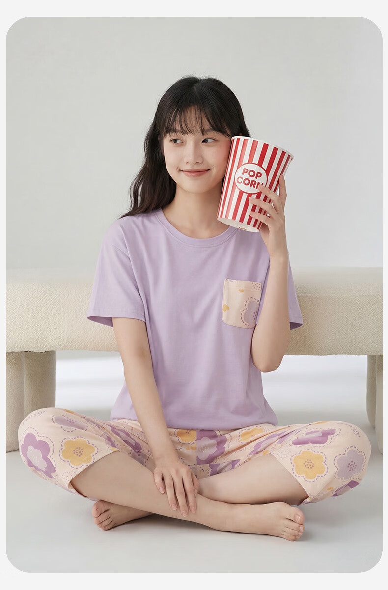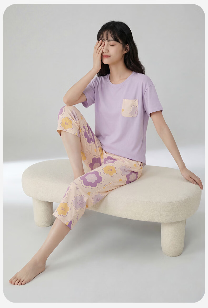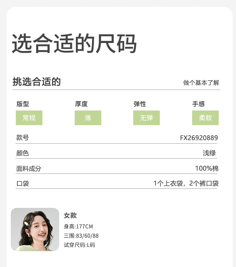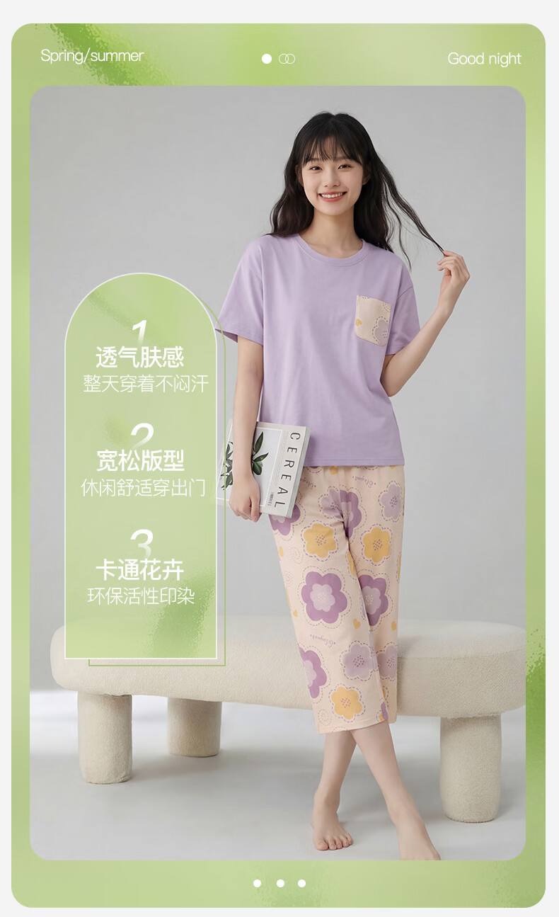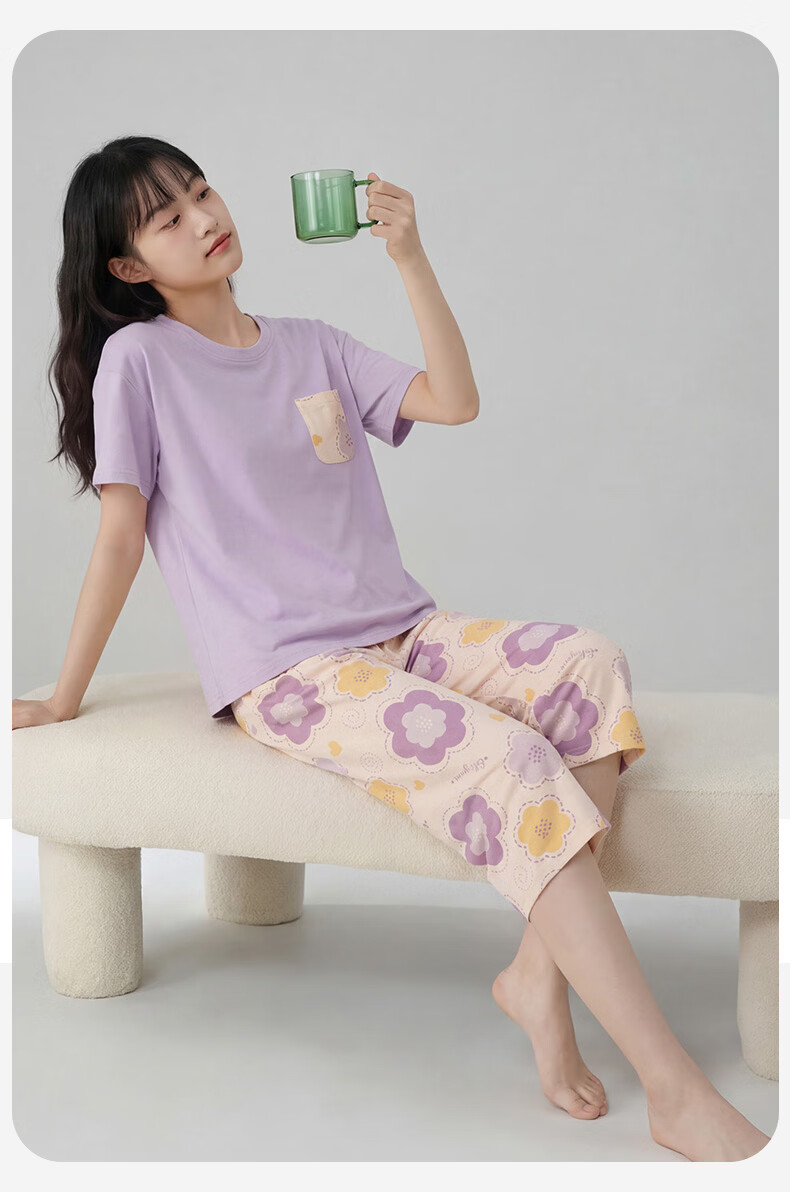 芬腾睡衣女【100%纯棉】薄款圆领可外穿新品家居服套装高级感 浅绿 L