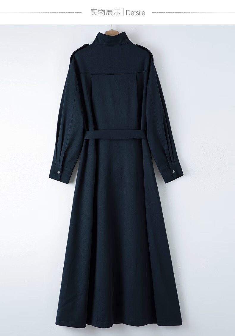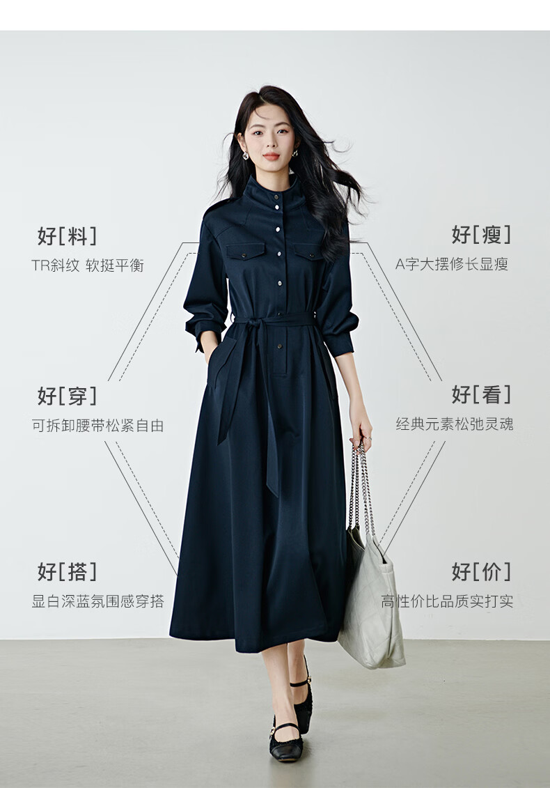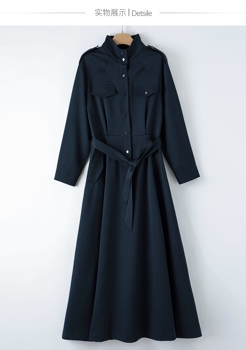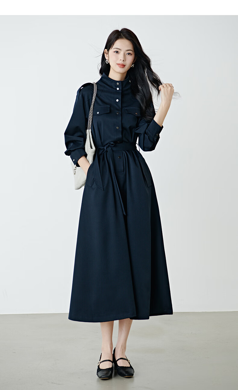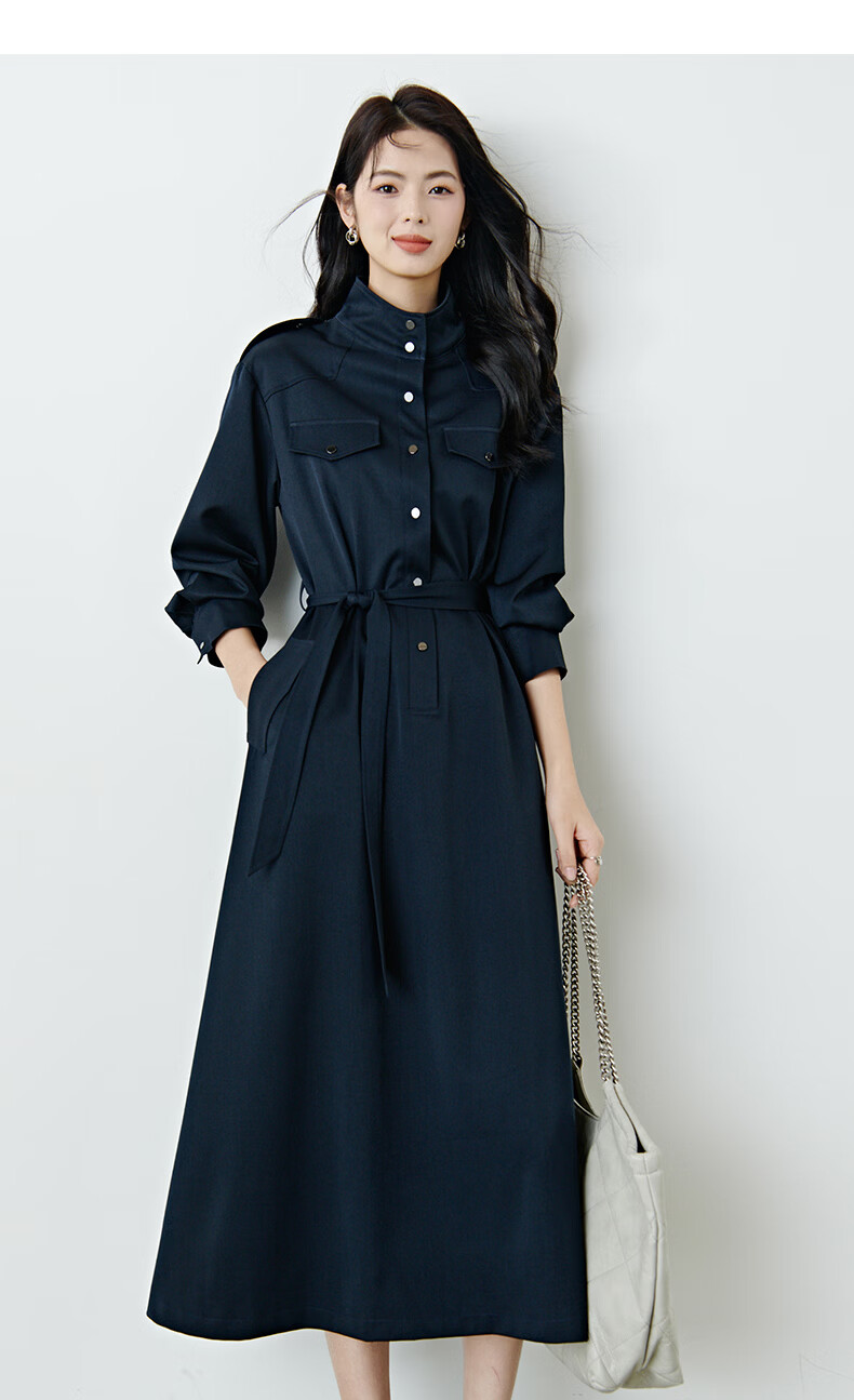 晚白2026春款经典立领港风时髦高级感风衣版裙子系带收腰大码连衣裙 深蓝色 M