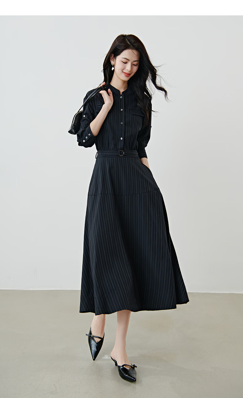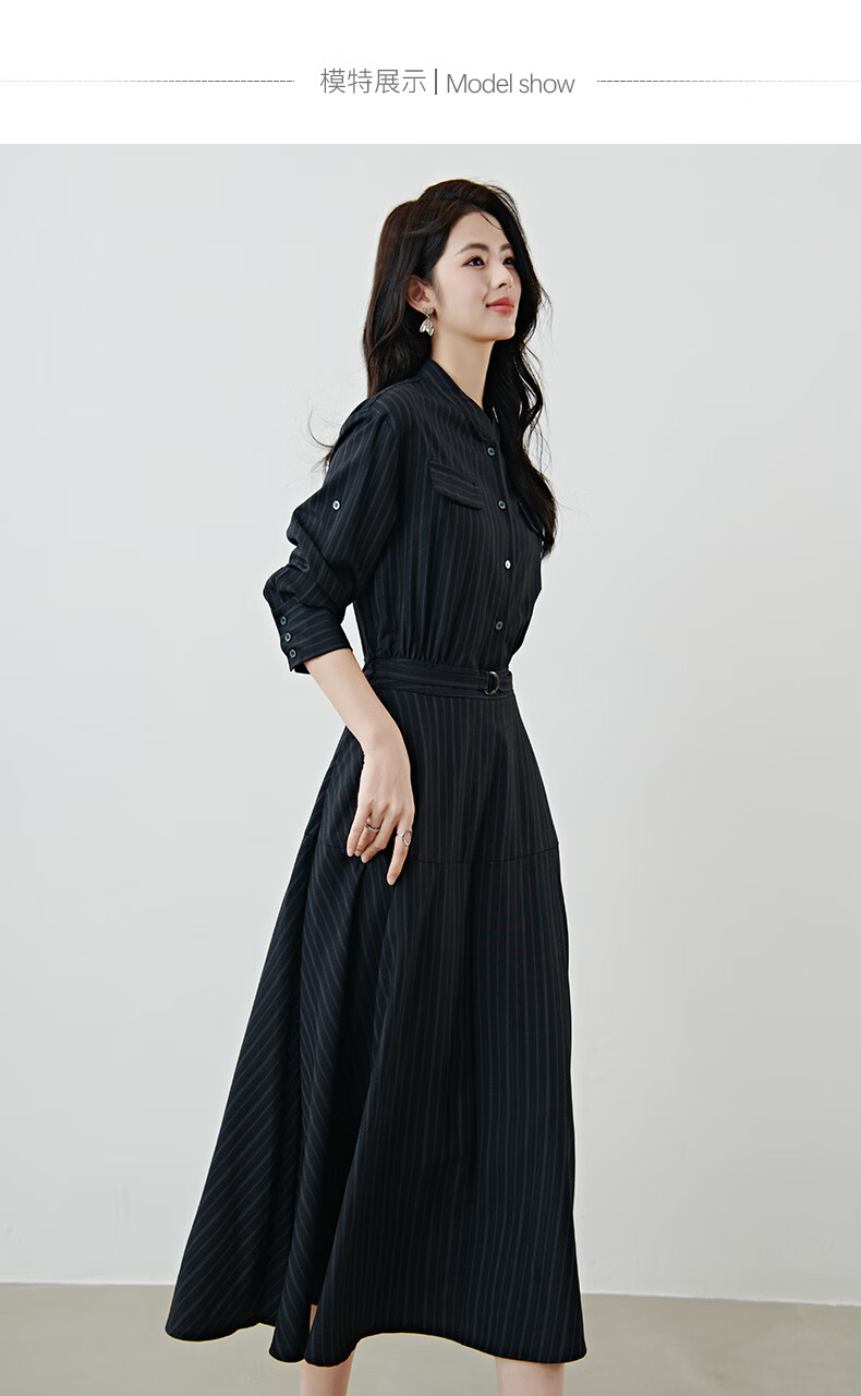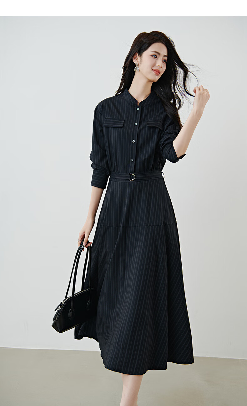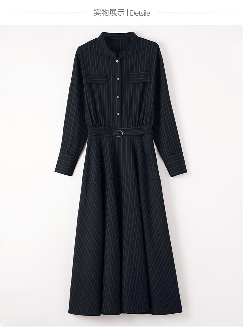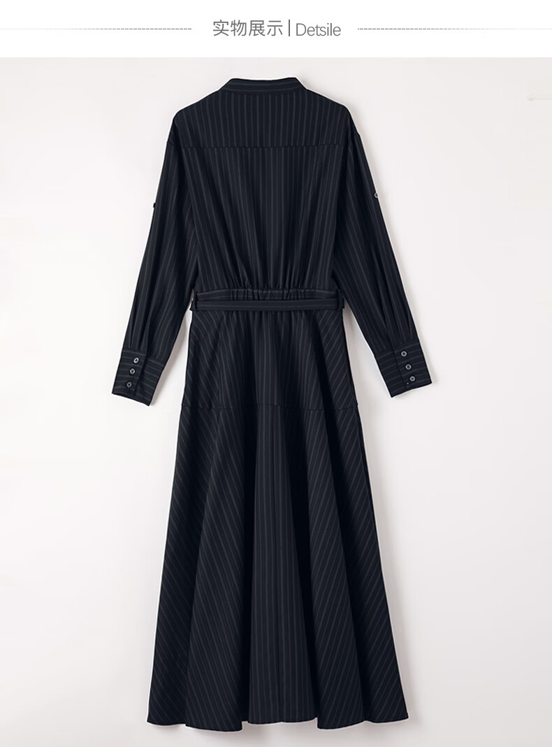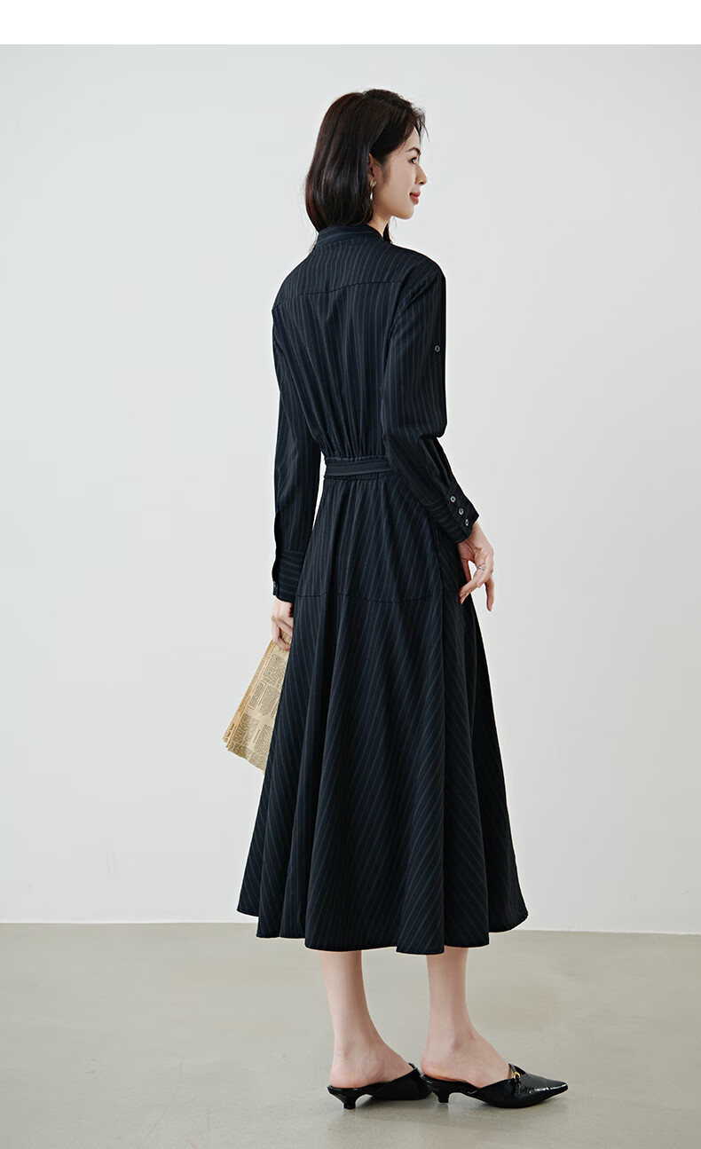 晚白2026年春款气质行政蓝高智感竖条纹衬衫裙系带收腰显瘦通勤连衣裙 条纹 XL