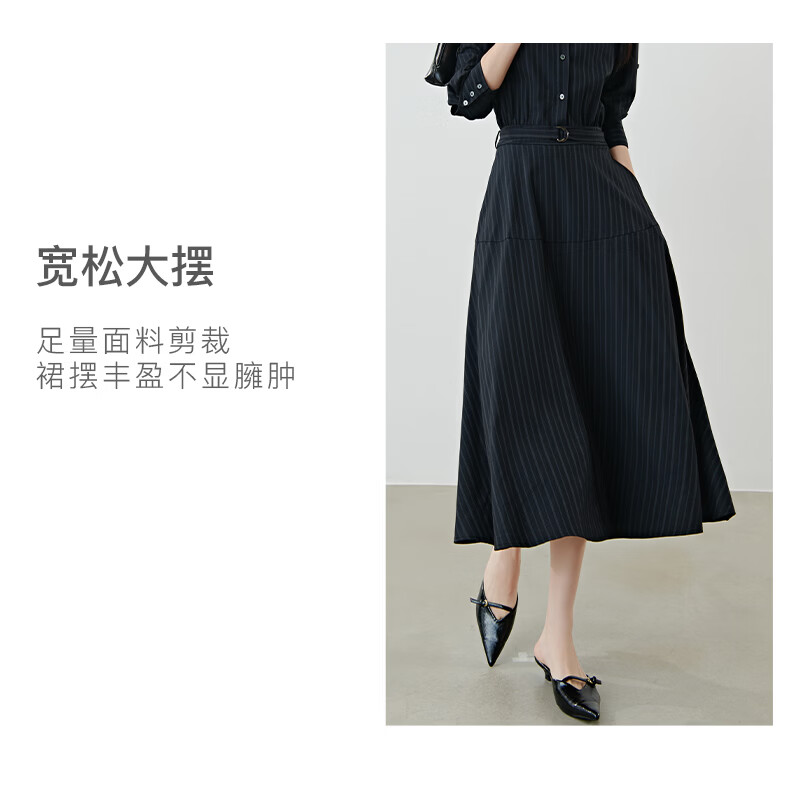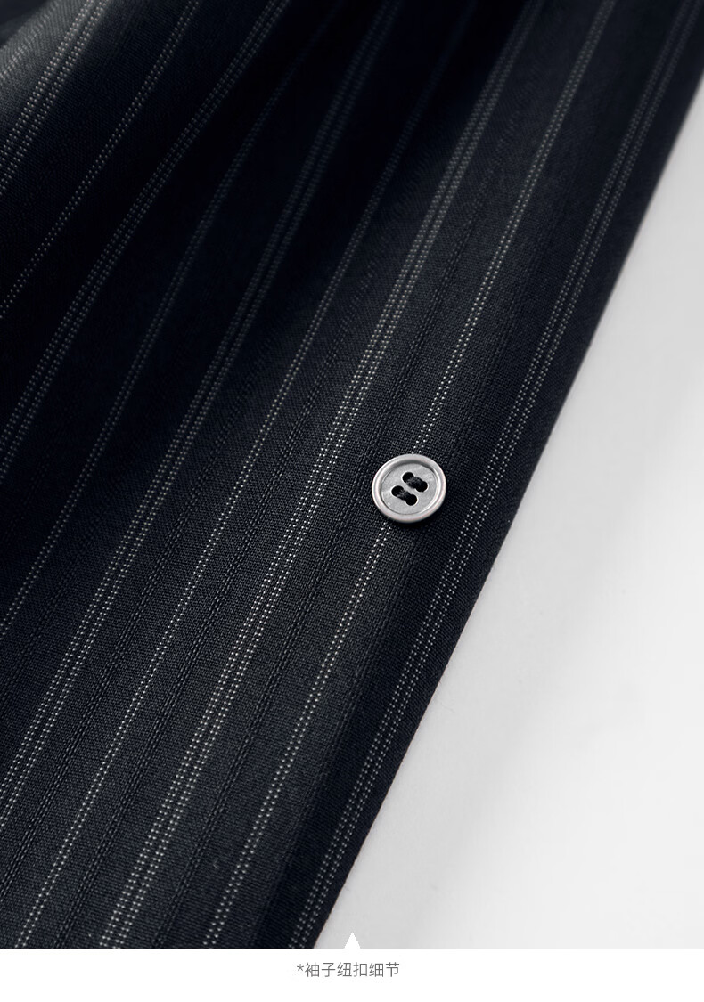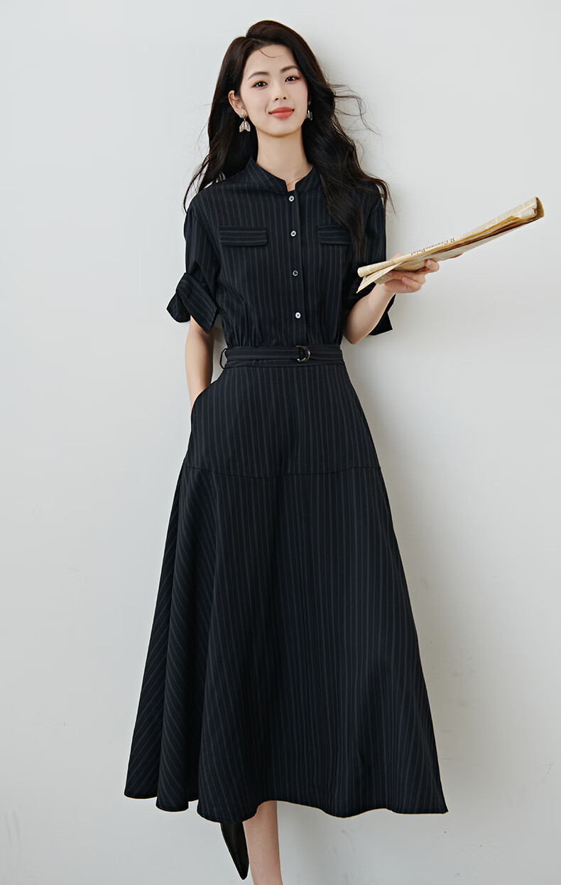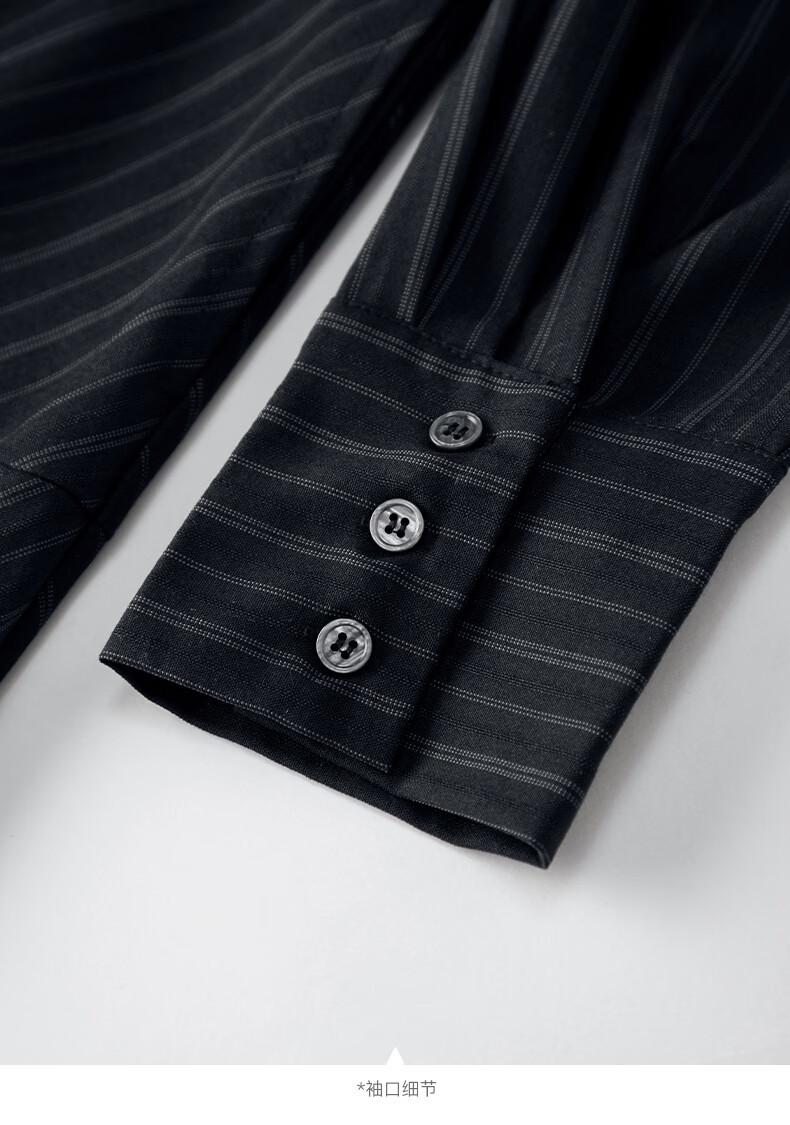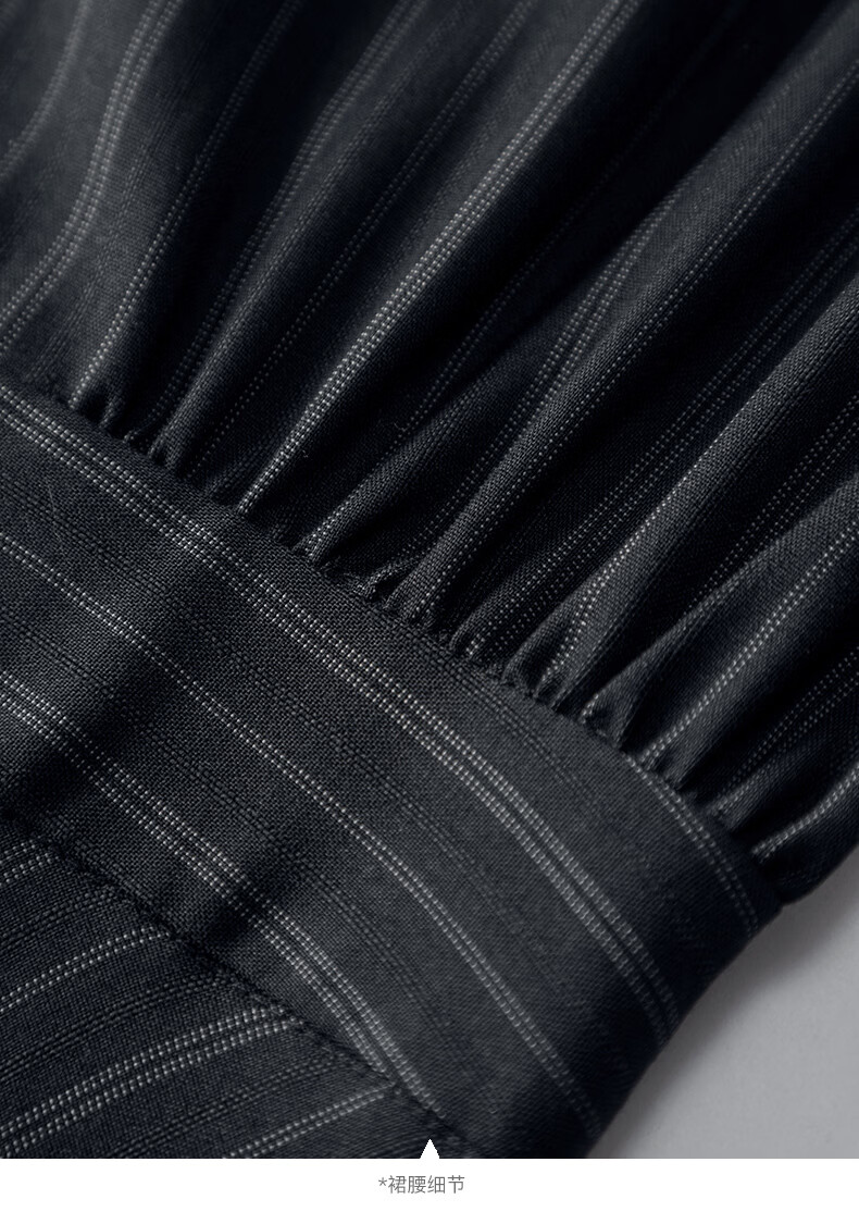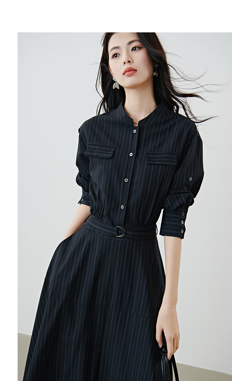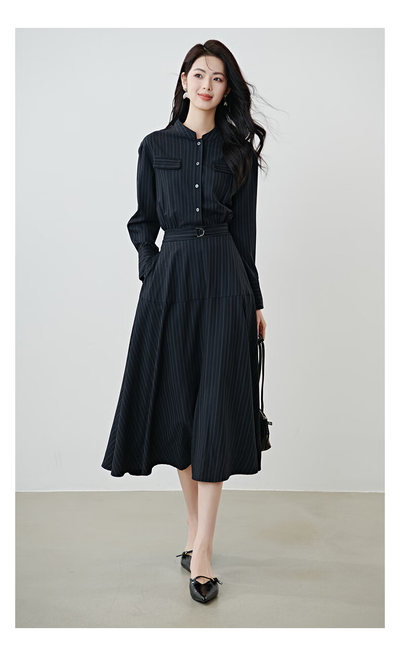 晚白2026年春款气质行政蓝高智感竖条纹衬衫裙系带收腰显瘦通勤连衣裙 条纹 XL