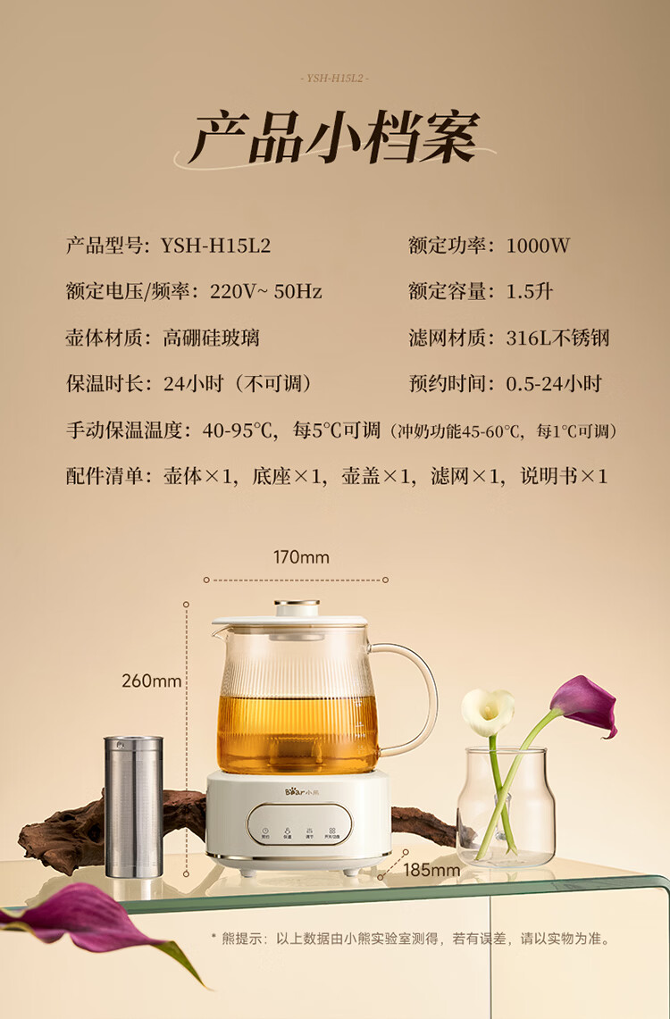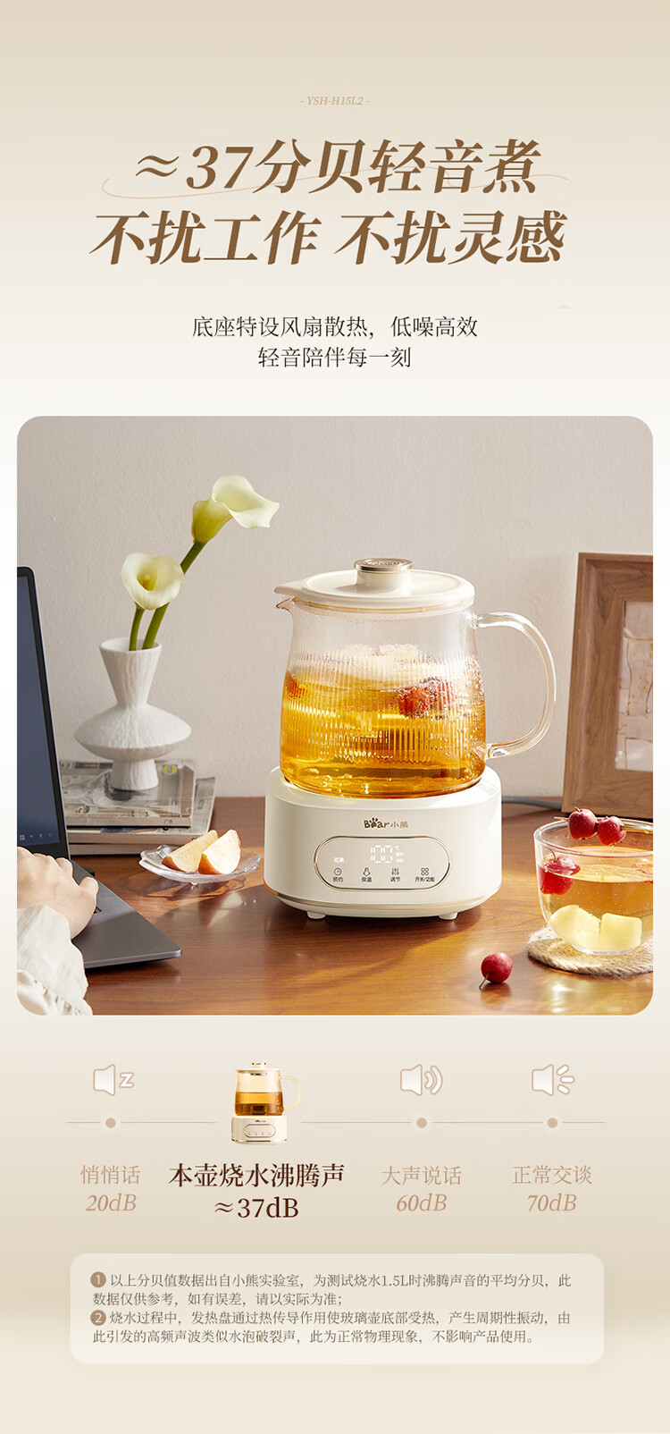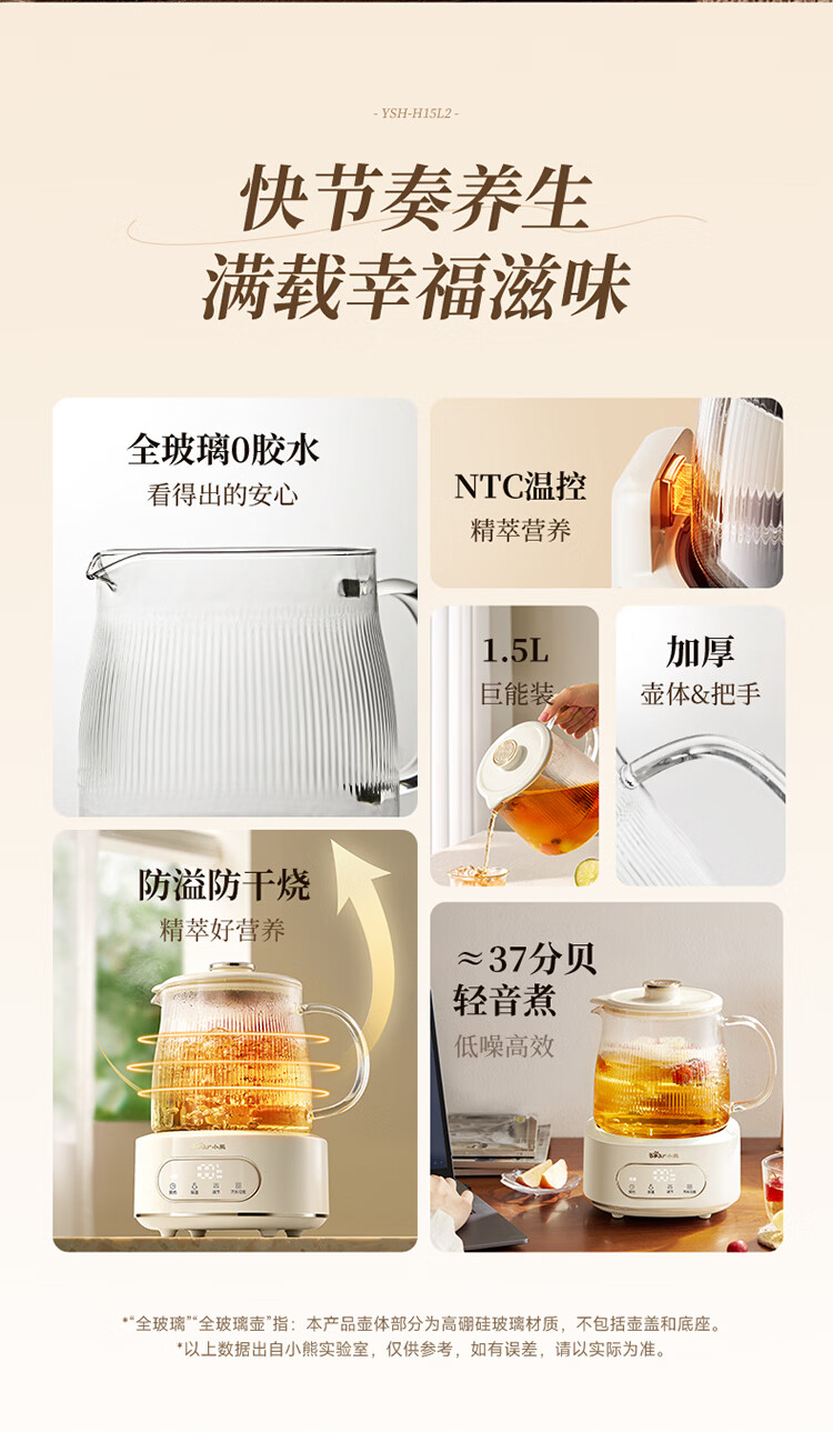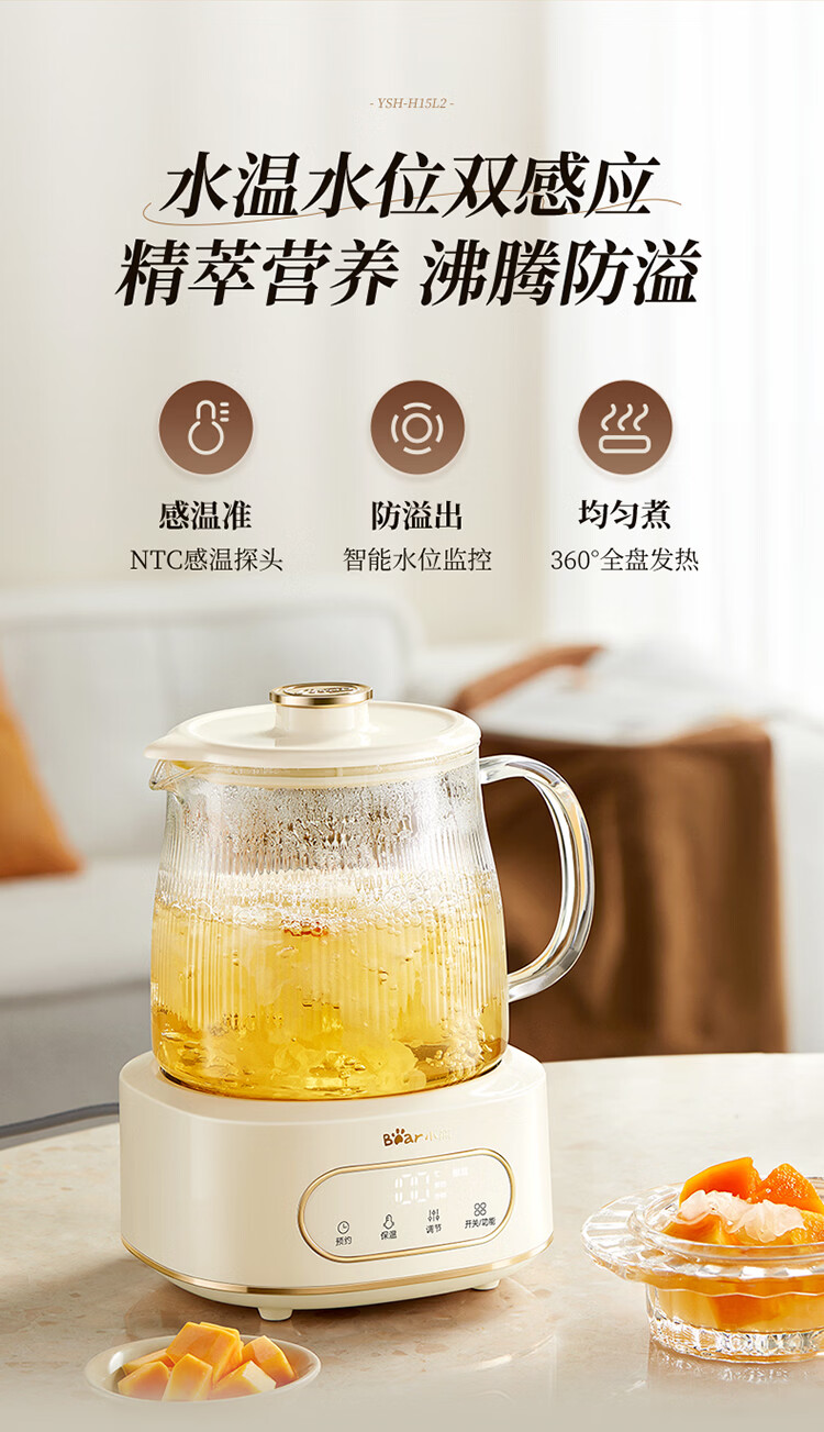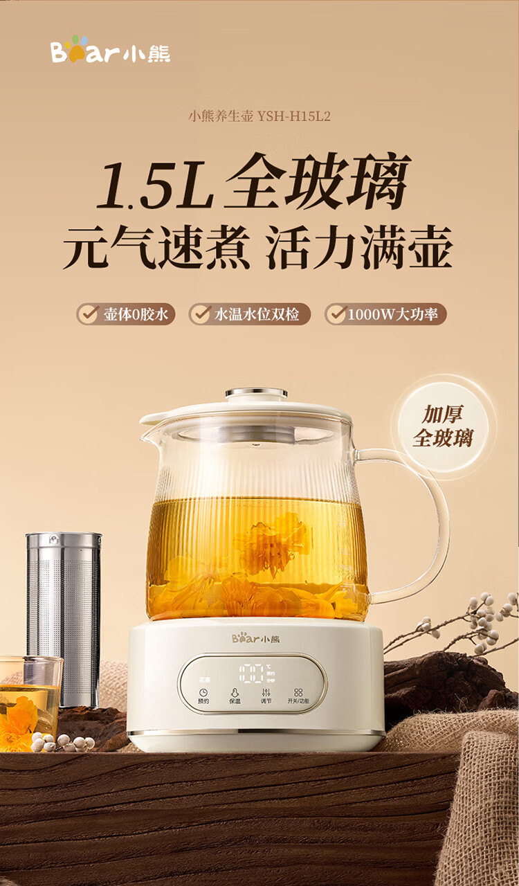 小熊(Bear)全玻璃壶养生壶恒温壶 办公室多功能煮茶壶花茶壶 0金属养生杯 24h保温 1.5L YSH-H15L2