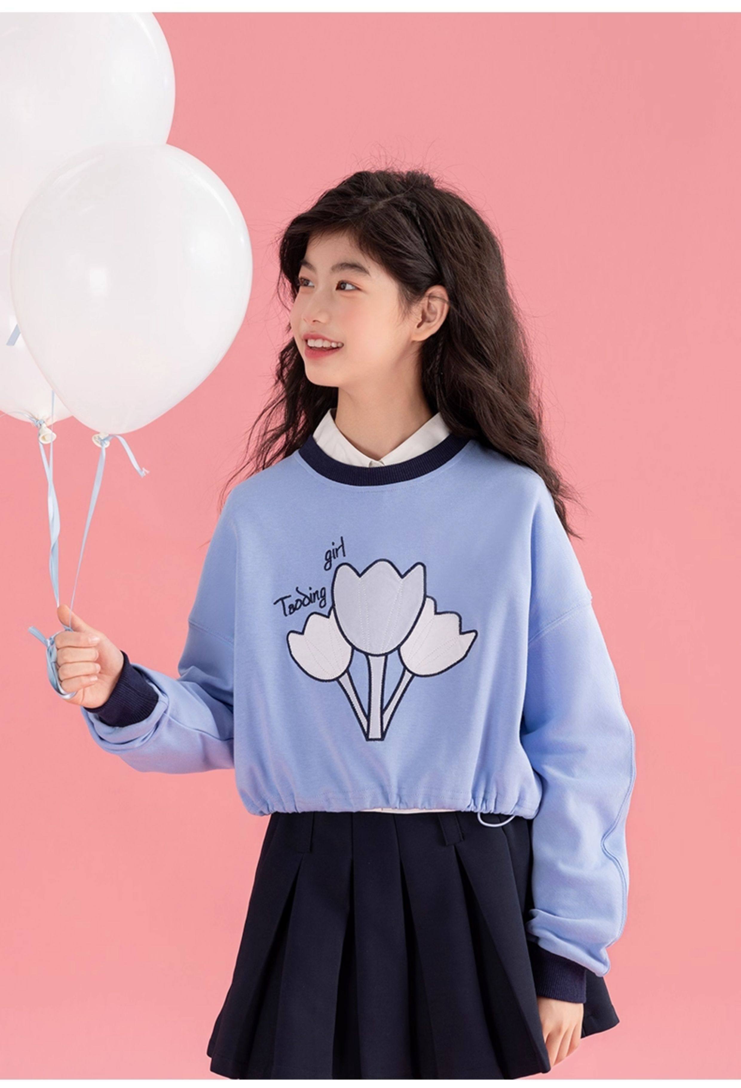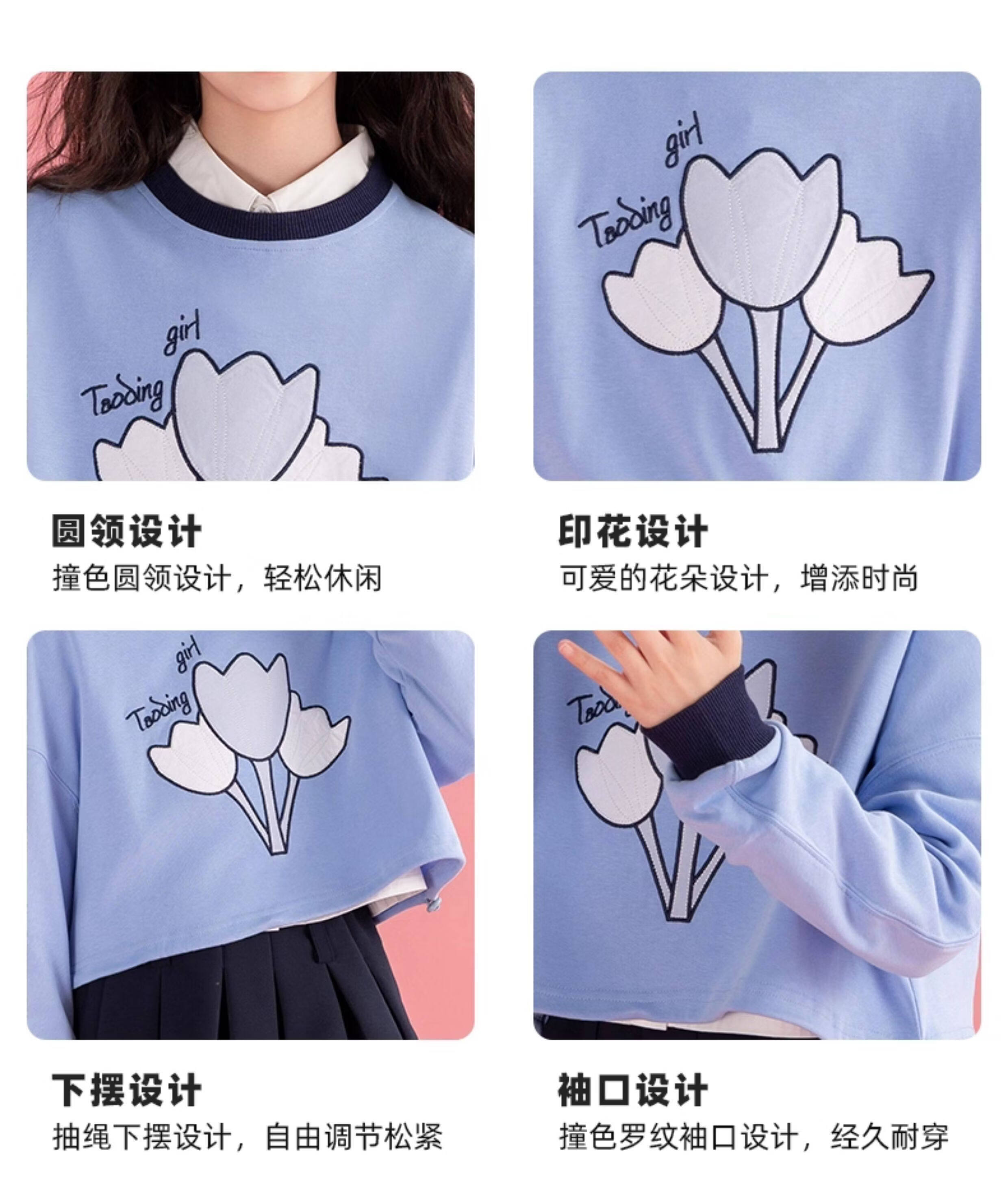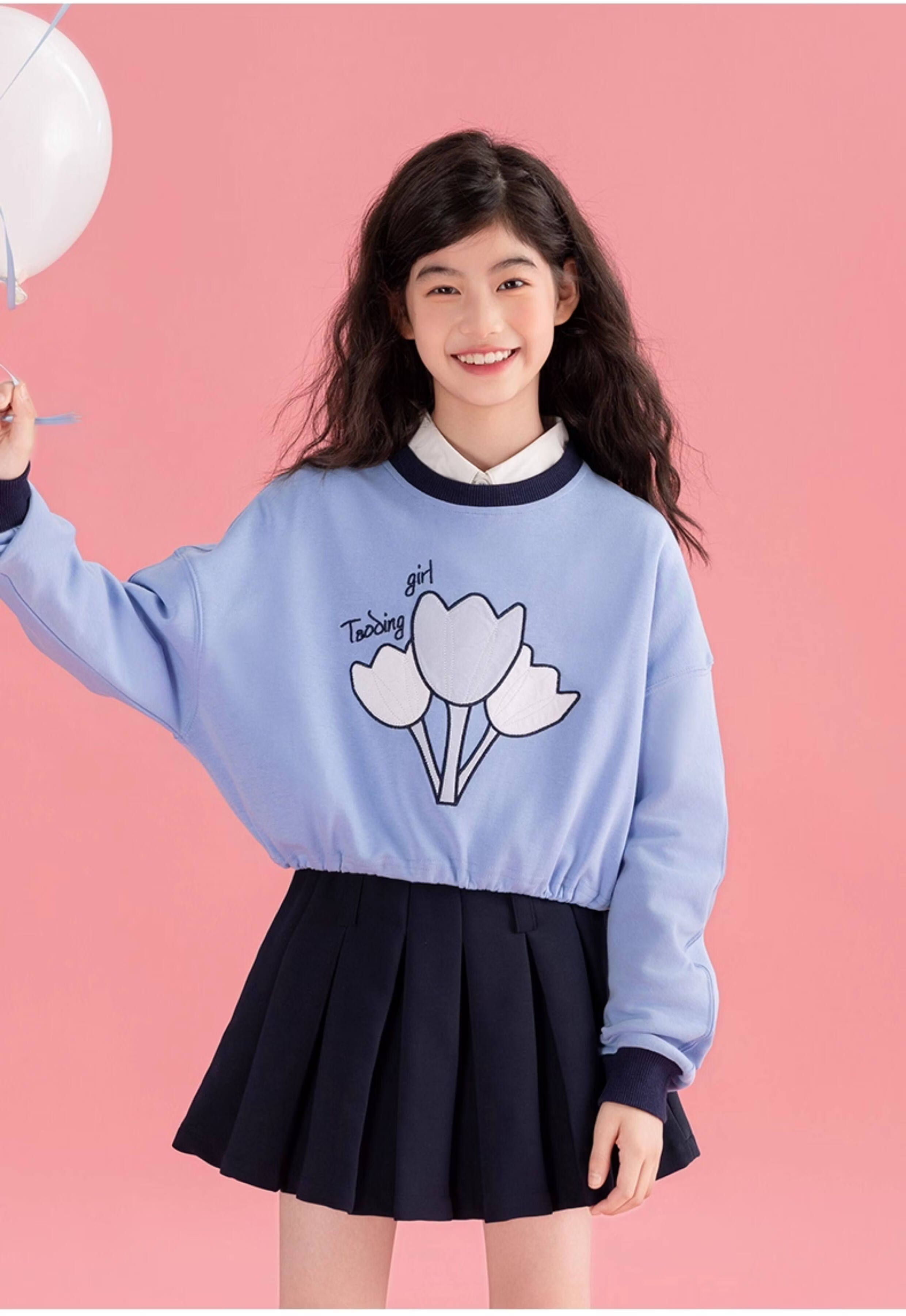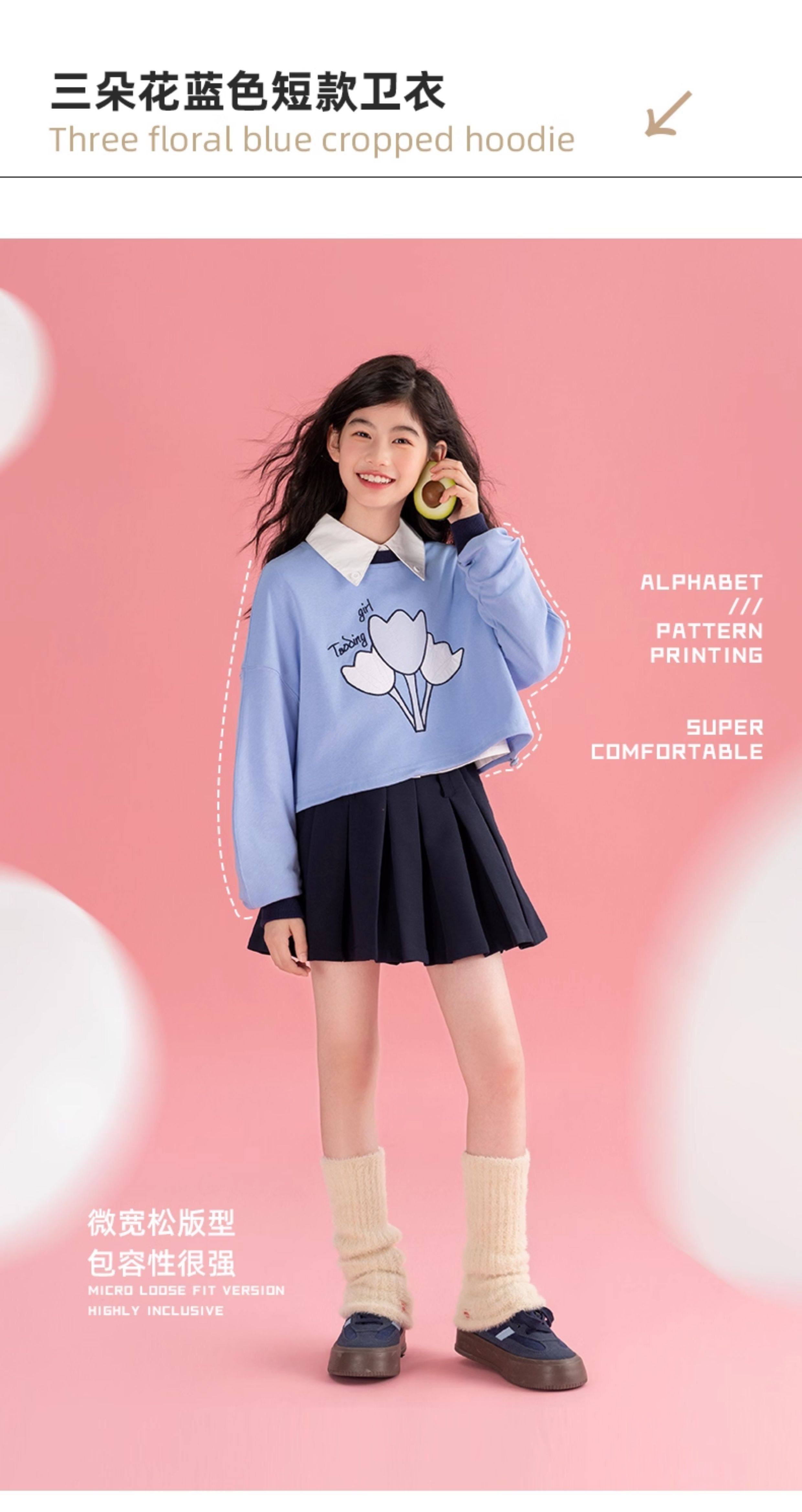 淘町女童卫衣短款气质春秋中大童小清新贴布绣收腰打底百搭韩版 浅蓝色 120
