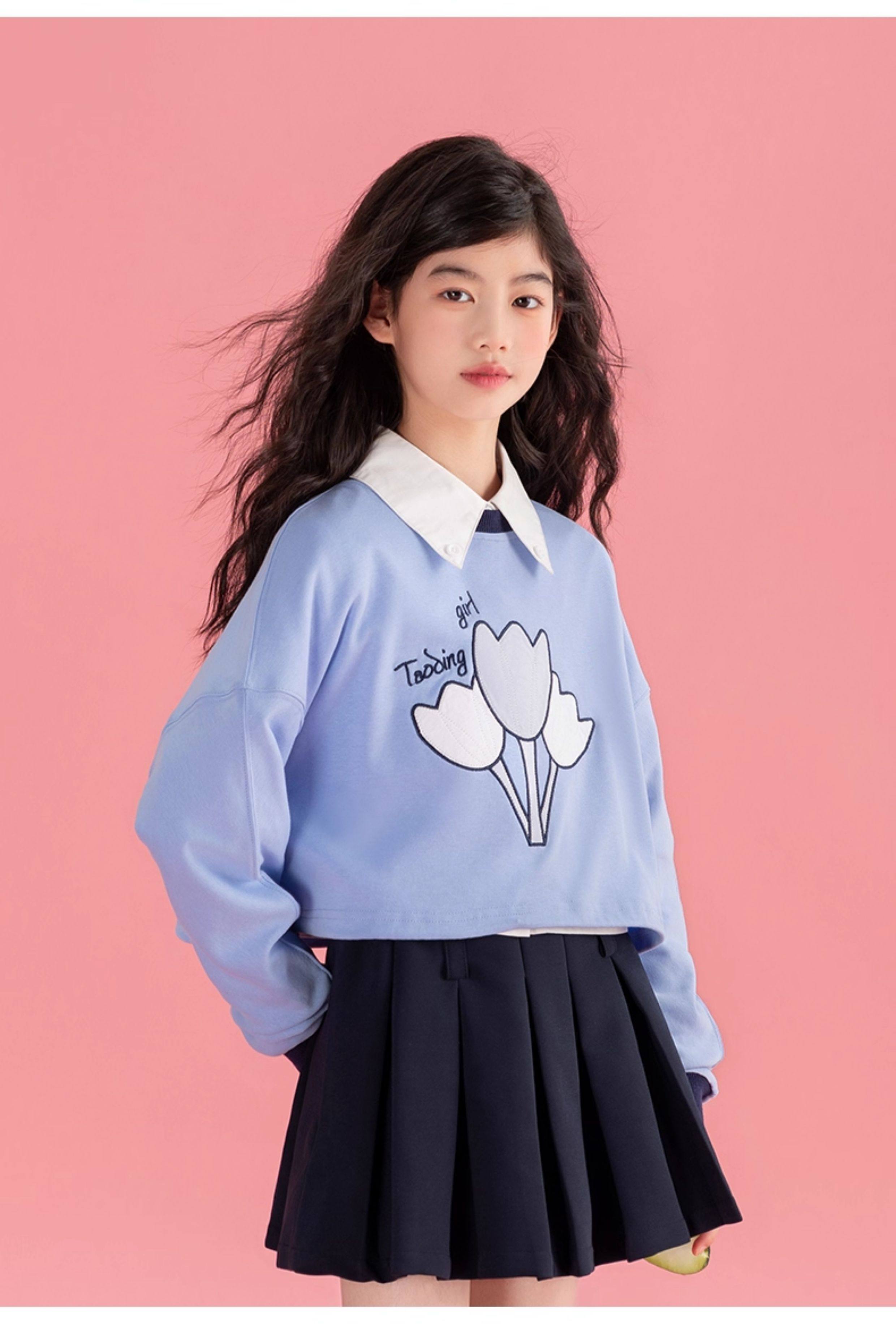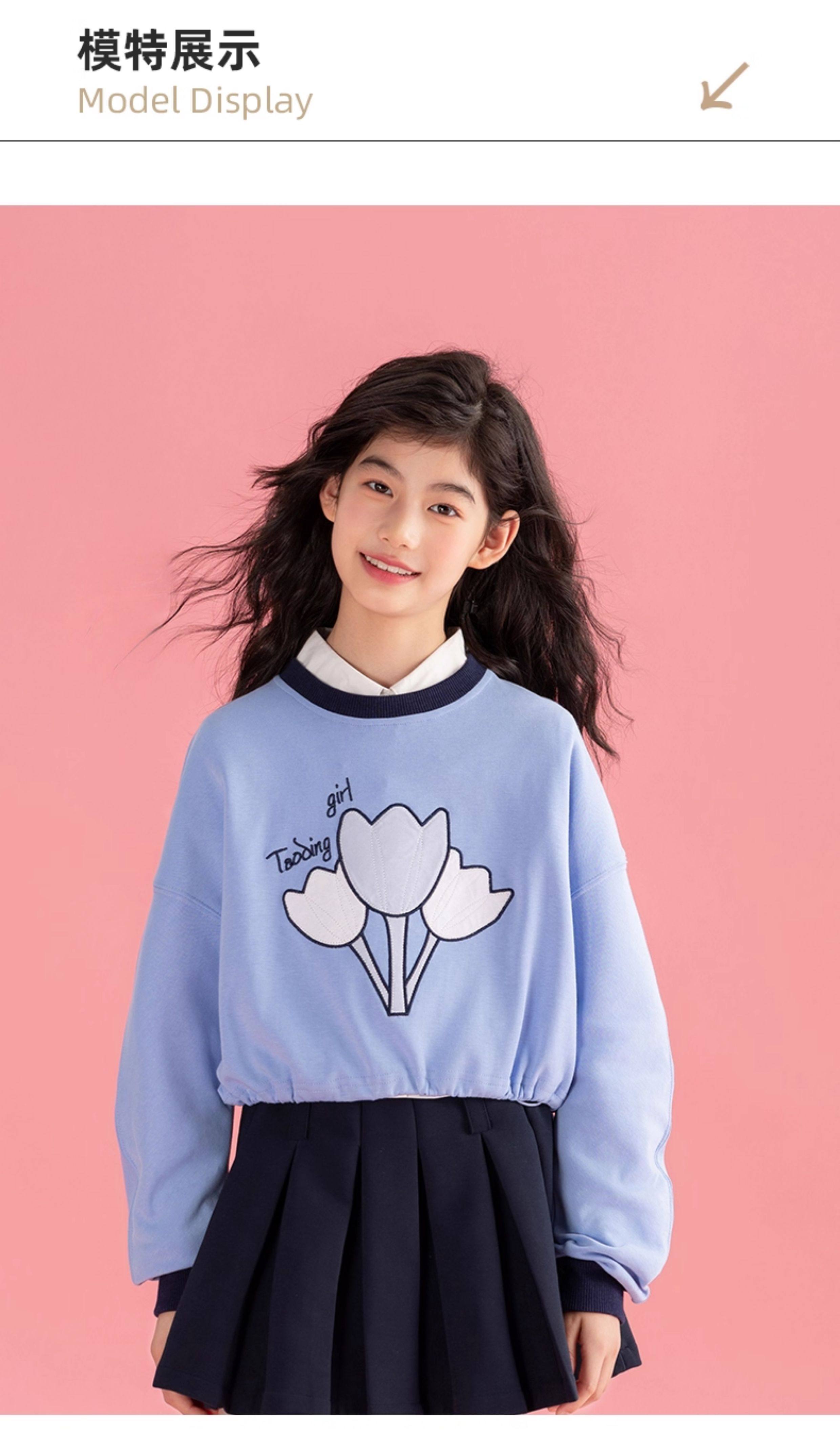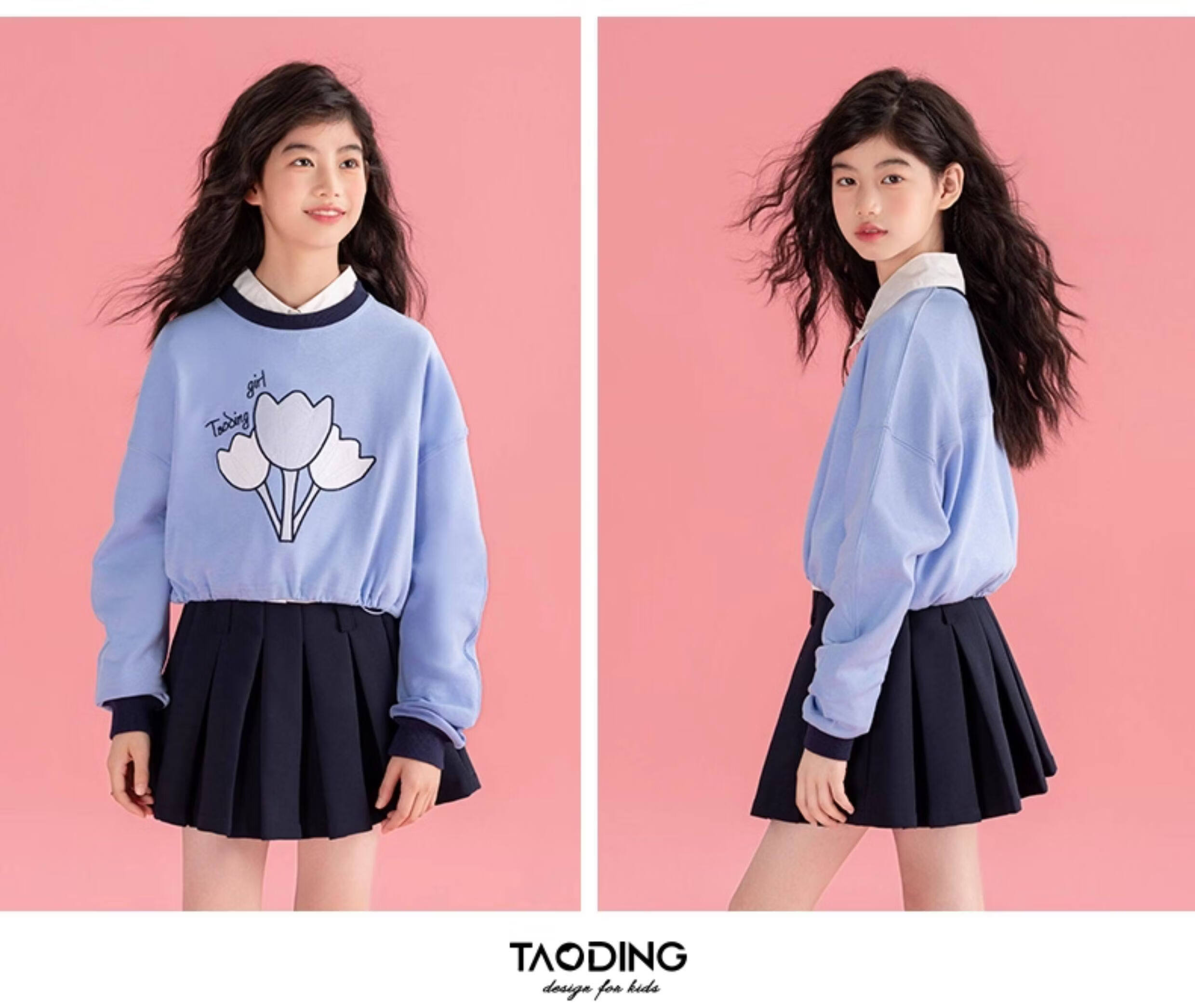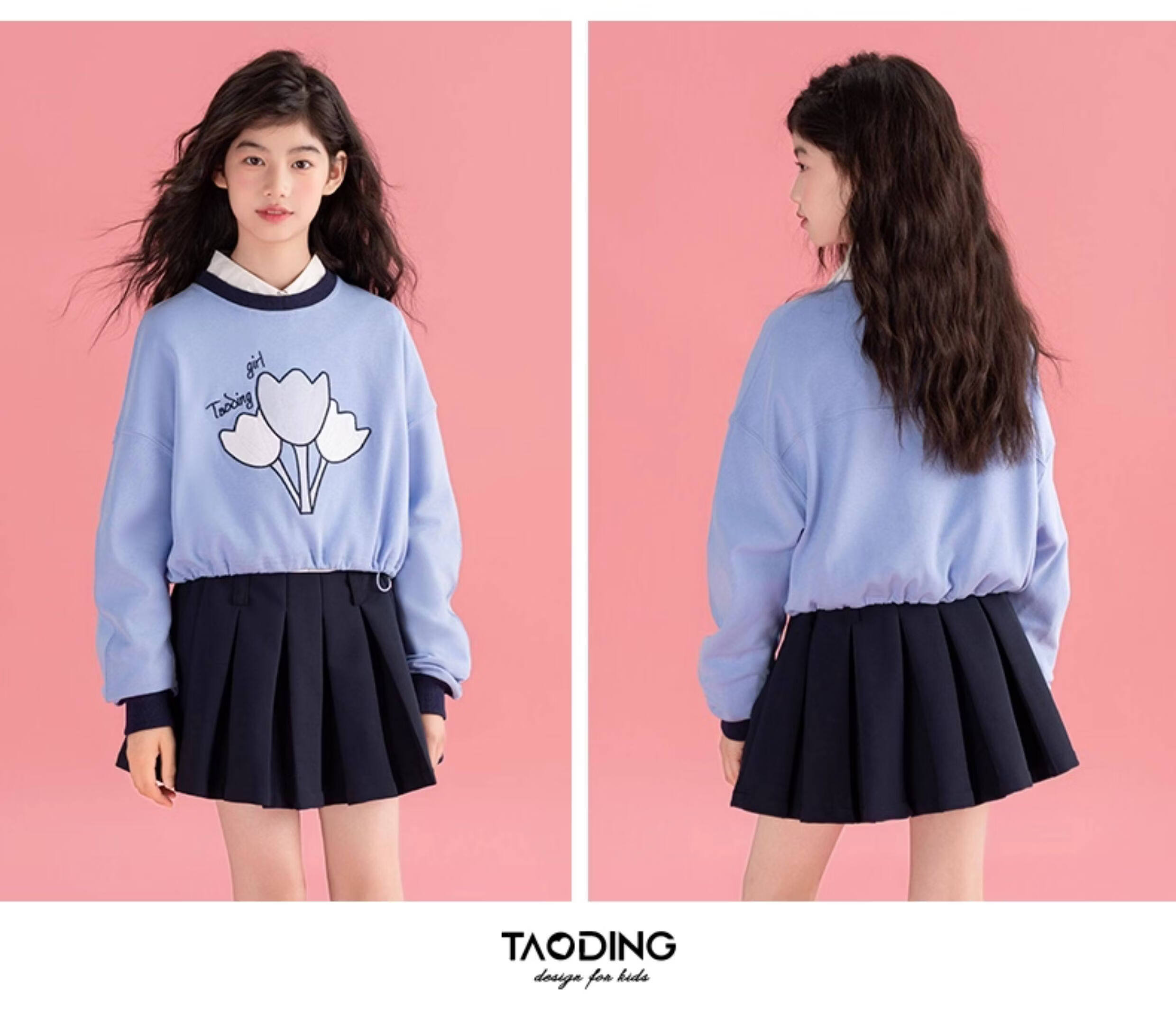 淘町女童卫衣短款气质春秋中大童小清新贴布绣收腰打底百搭韩版 浅蓝色 120