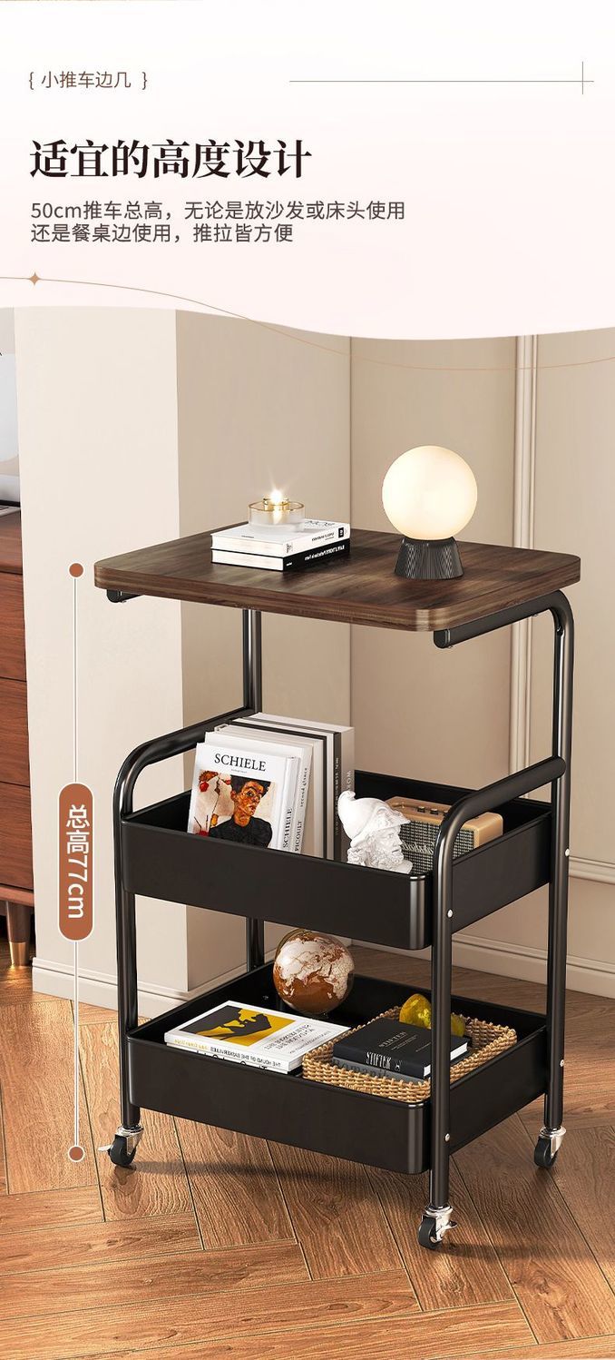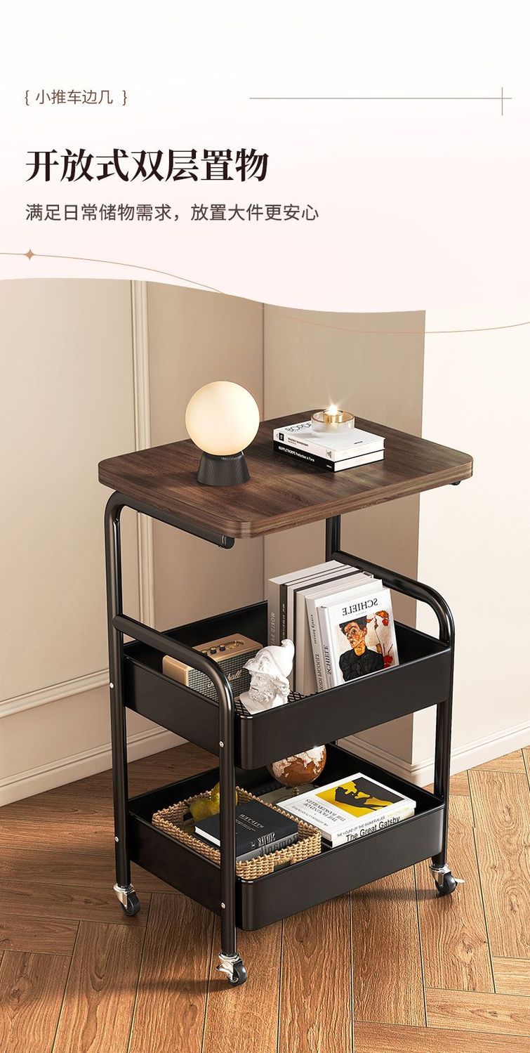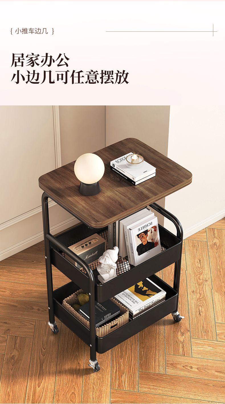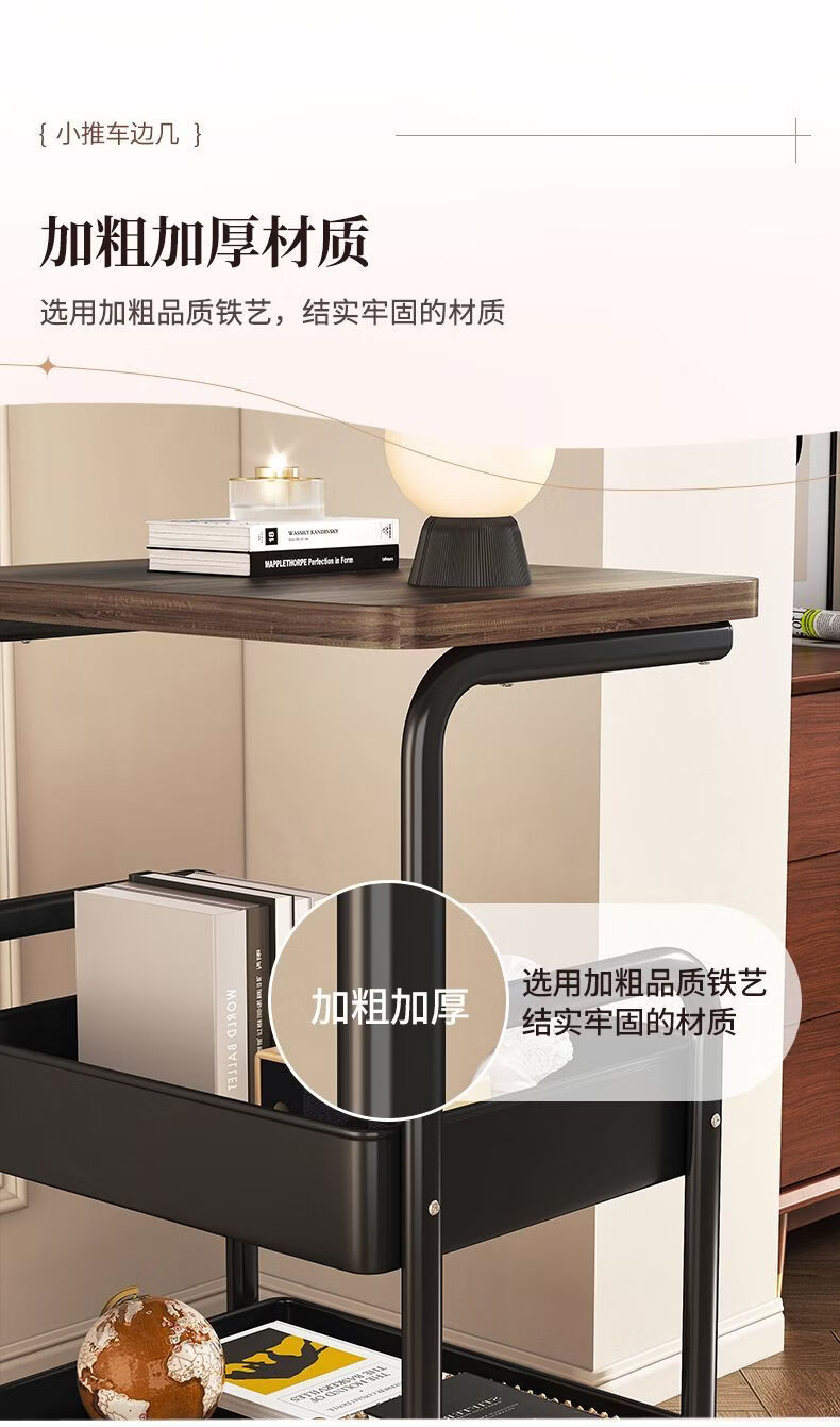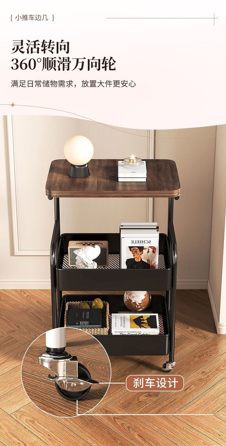 简友探小推车床头柜可移动边几零食收纳置物架家用落地床边茶几桌子客厅 经典黑 三层碳钢加粗加厚【送万向轮】