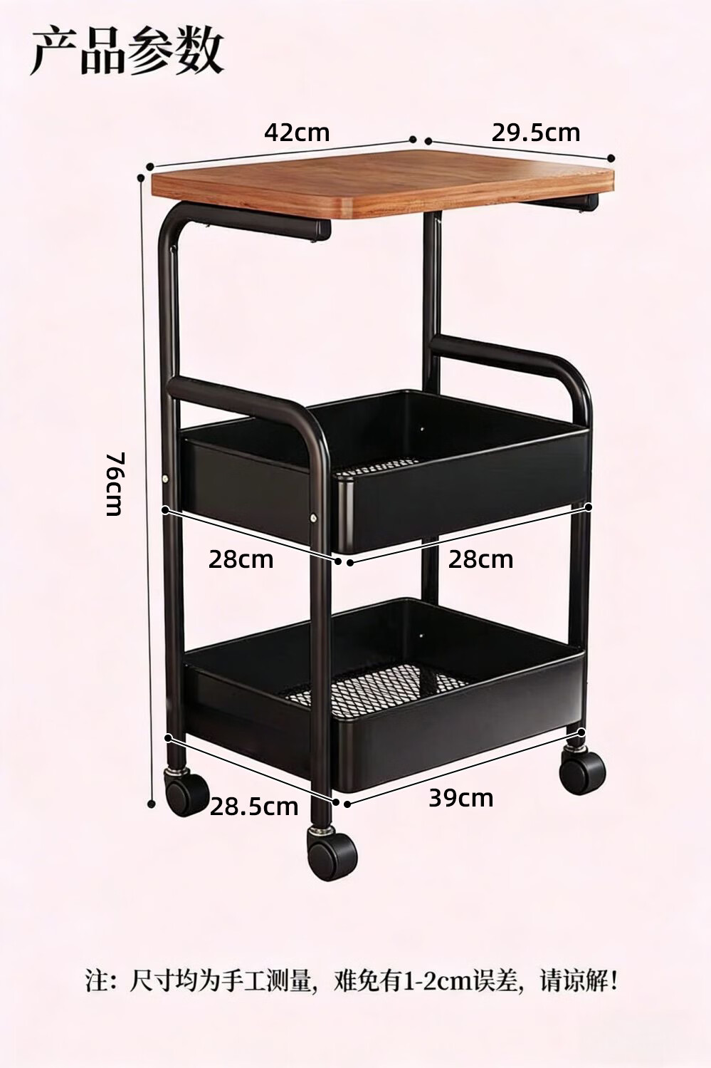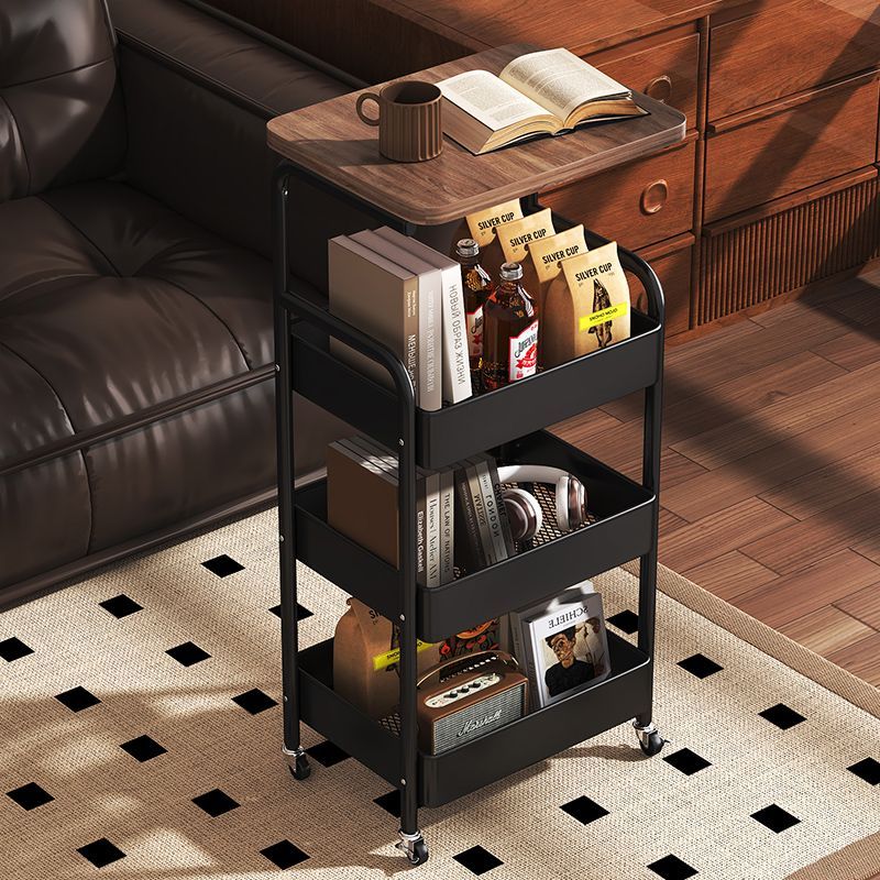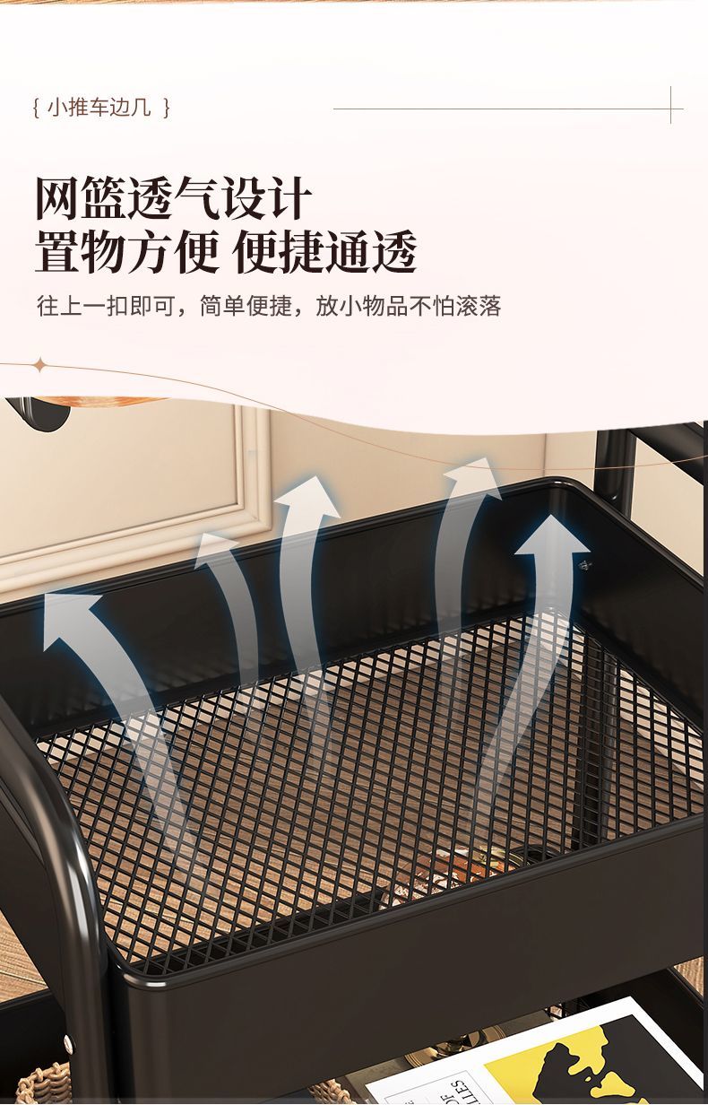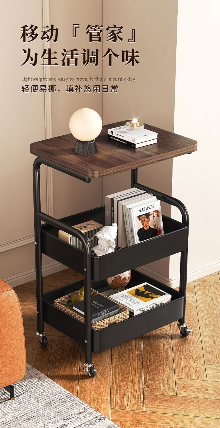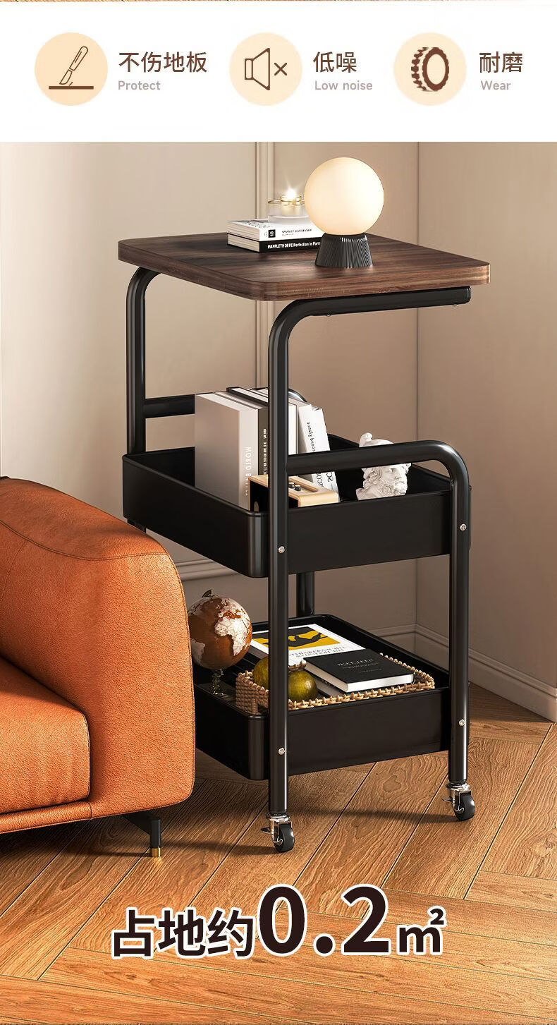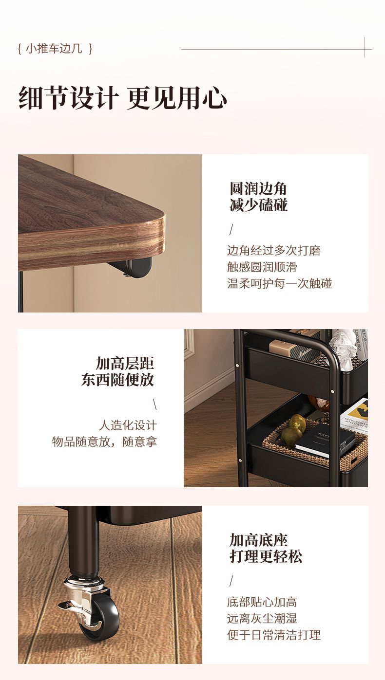 简友探小推车床头柜可移动边几零食收纳置物架家用落地床边茶几桌子客厅 经典黑 三层碳钢加粗加厚【送万向轮】
