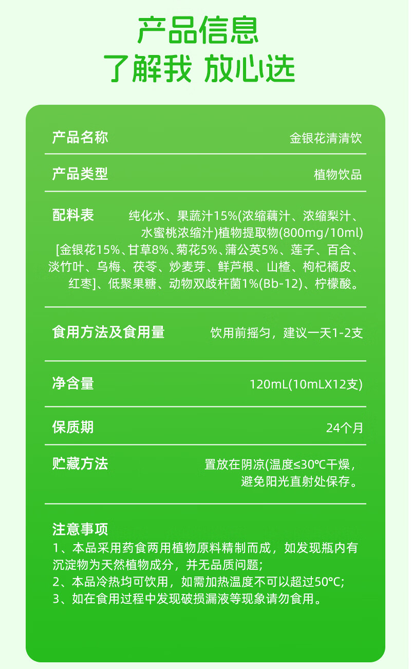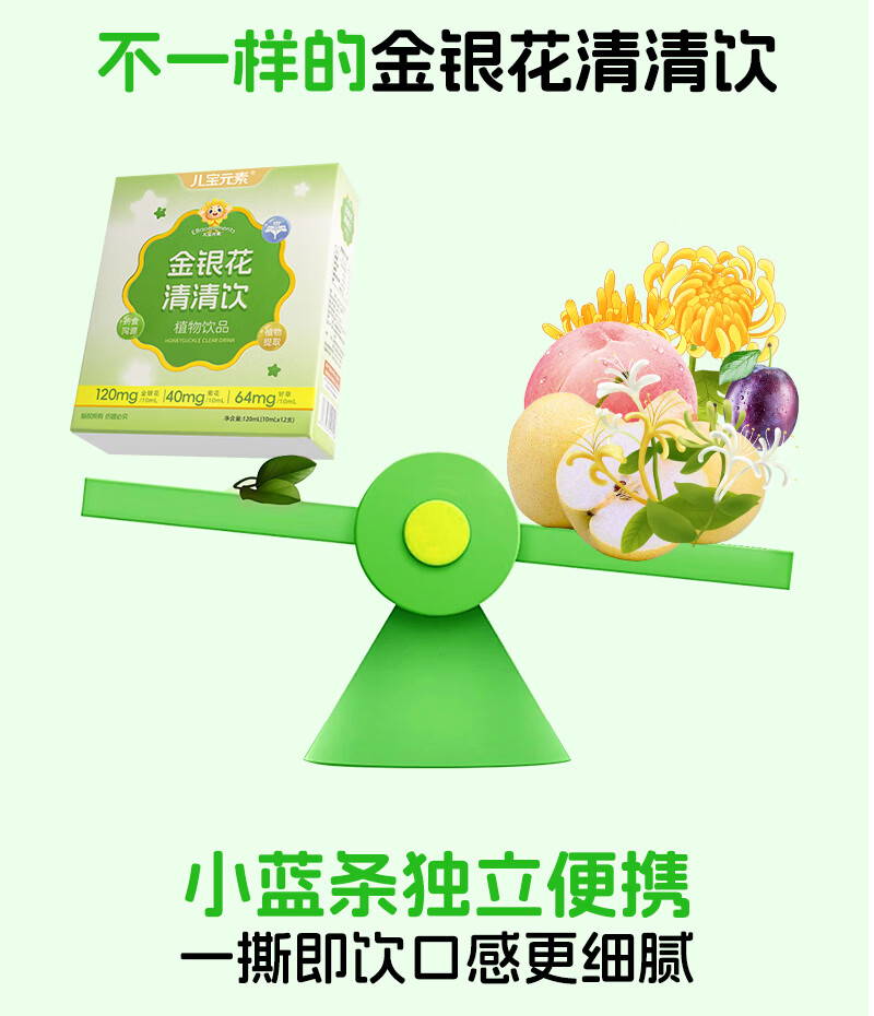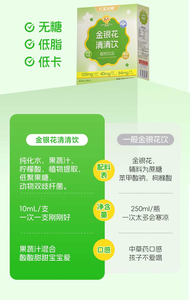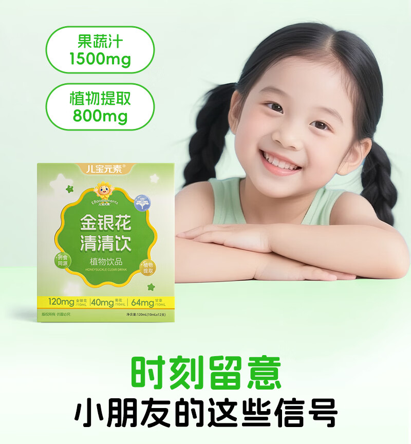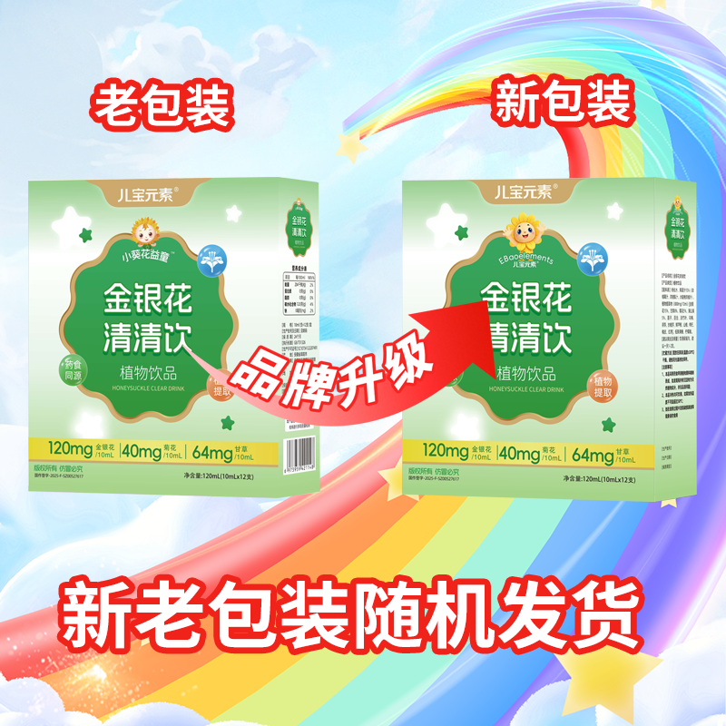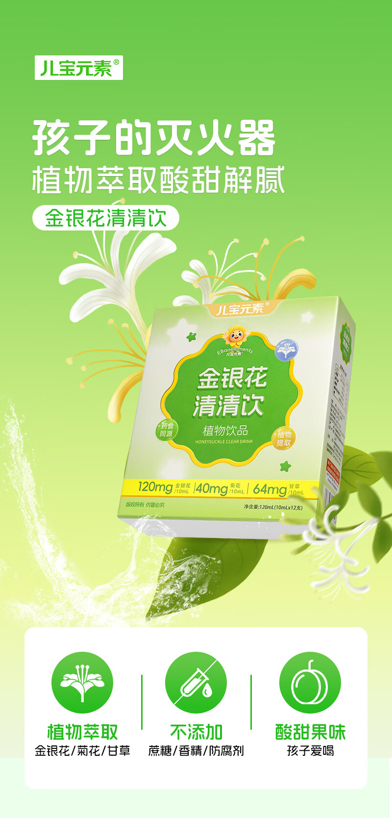 儿宝元素(EBAO ELEMENT)金银花清清饮儿童草本植物饮料益生元益生菌清凉果蔬汁水果汁饮品 12支*6盒 【赠1盒金银花】