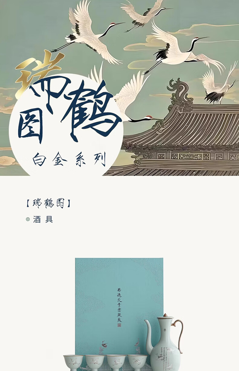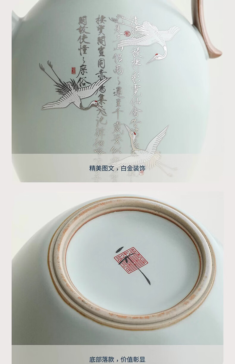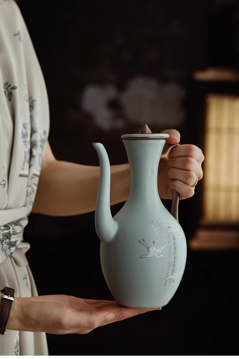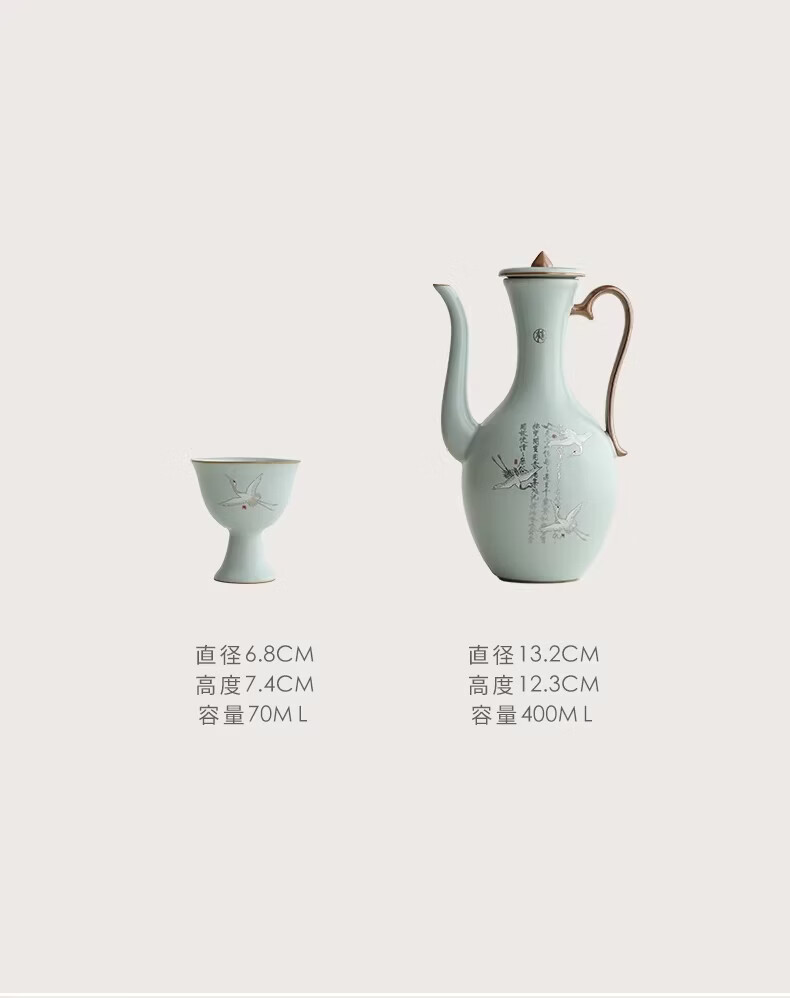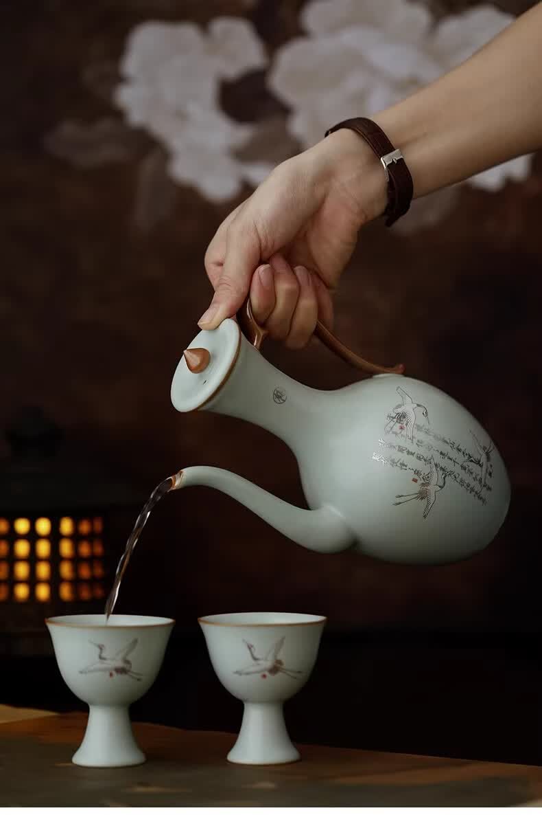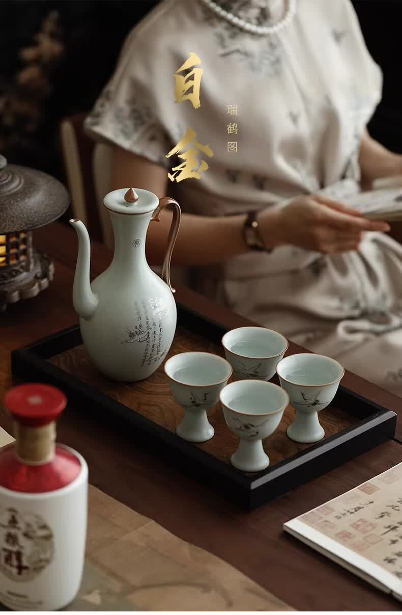 BOSSY故宫风仿宋瑞鹤呈祥汝窑酒壶酒具白酒清酒黄酒分酒器酒杯套装送礼 (仙鹤图)天青汝窑一壶四杯酒具套装