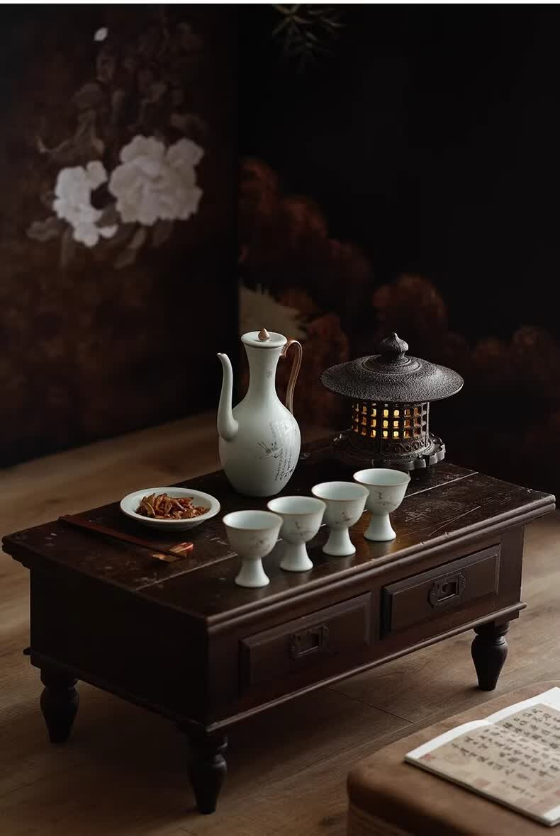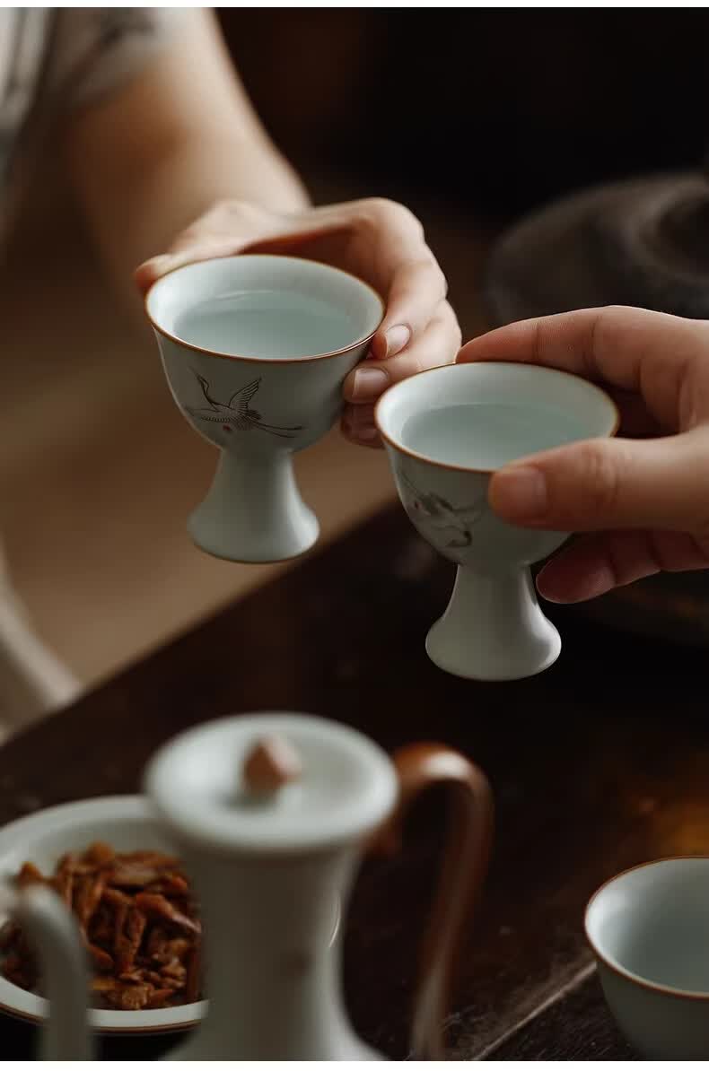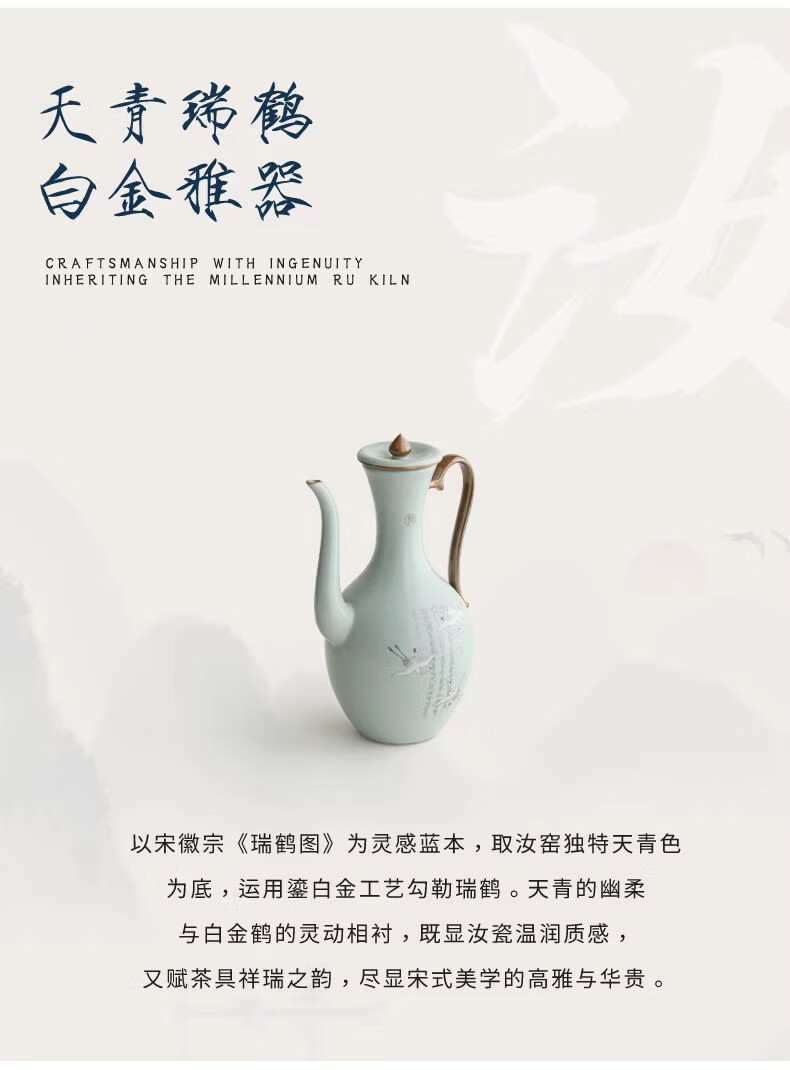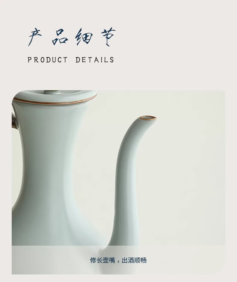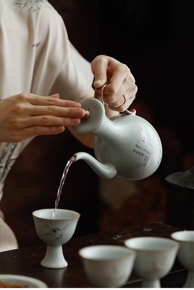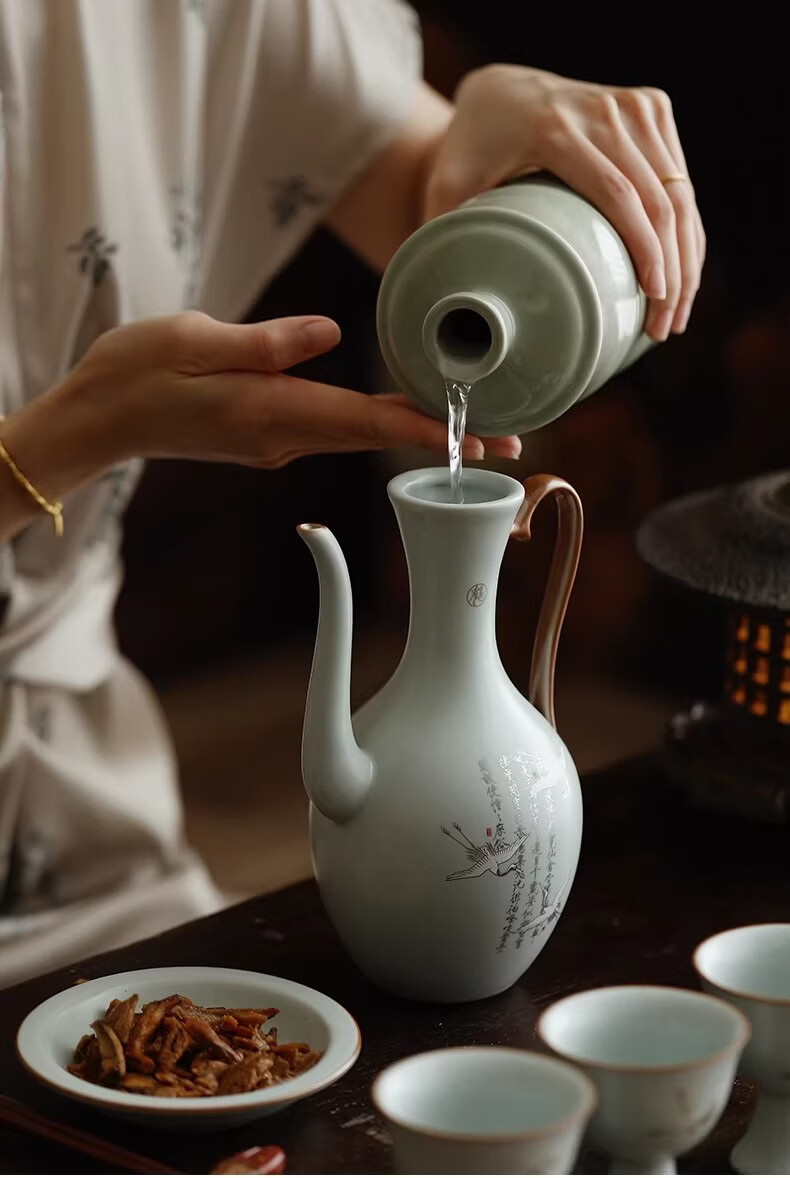 BOSSY故宫风仿宋瑞鹤呈祥汝窑酒壶酒具白酒清酒黄酒分酒器酒杯套装送礼 (仙鹤图)天青汝窑一壶四杯酒具套装