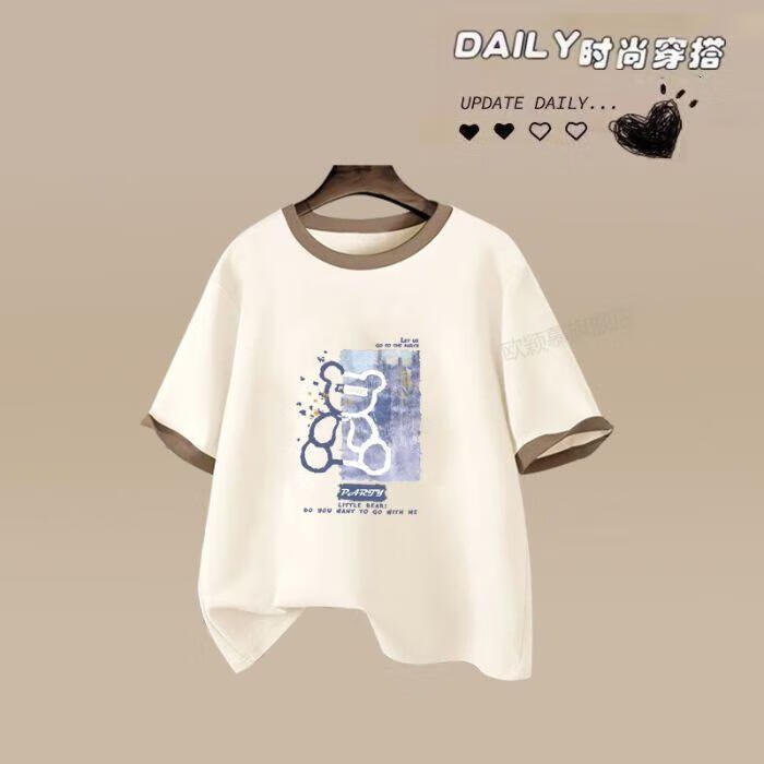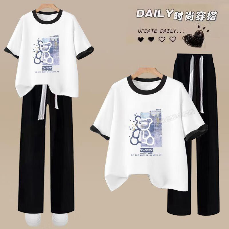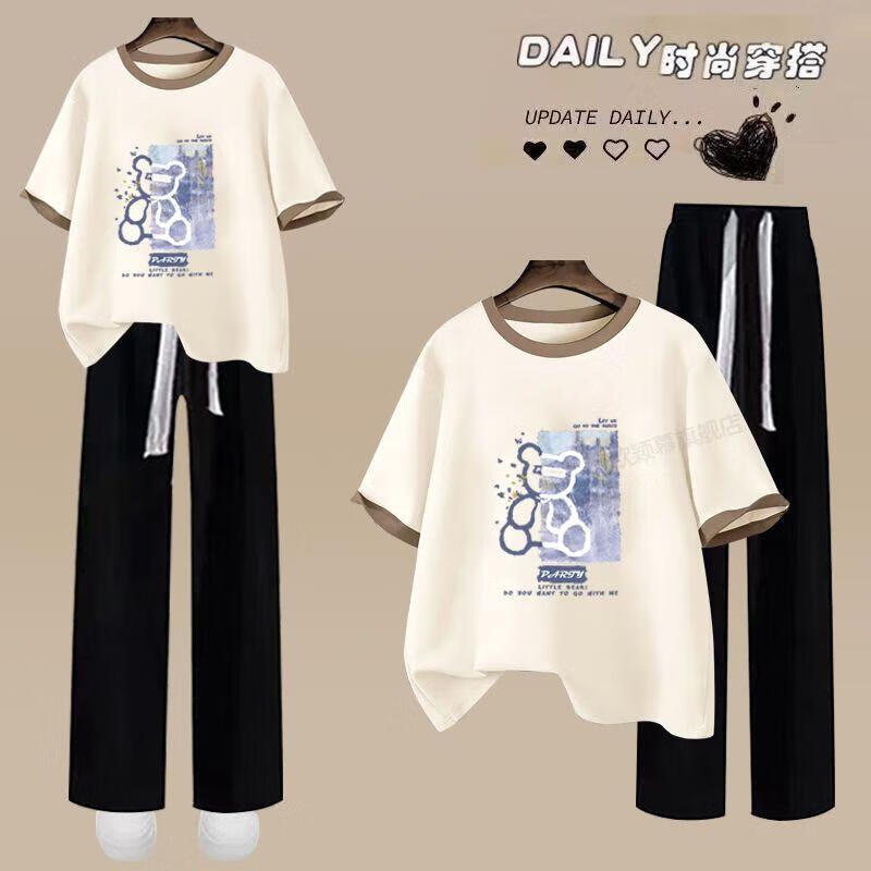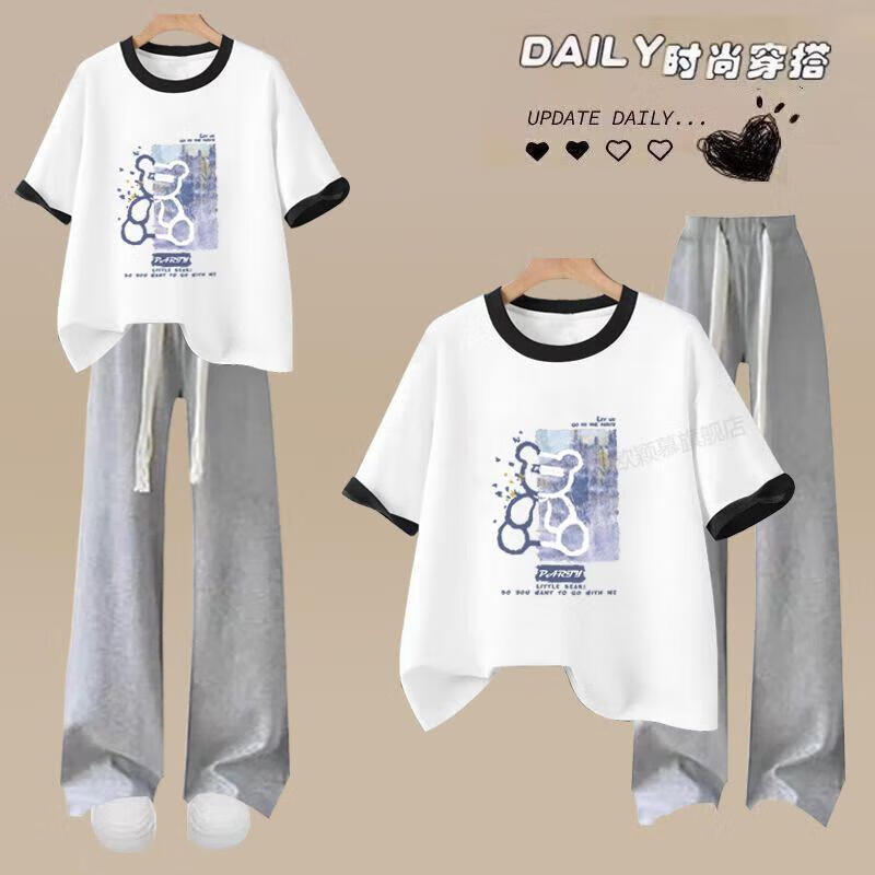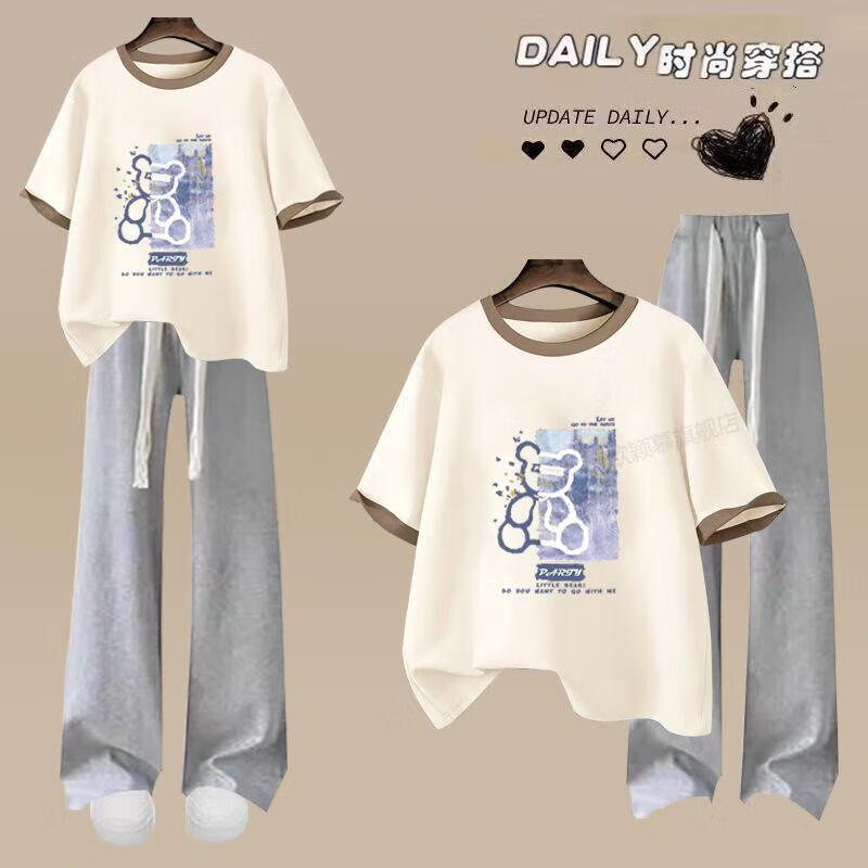 欧颖慕女童夏季套装新款洋气初中女生短袖t恤休闲裤薄款女大童运动夏装 2411-3杏色上衣+灰长裤套装 160 码 【建议90-105斤】