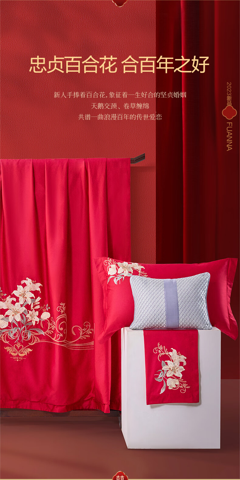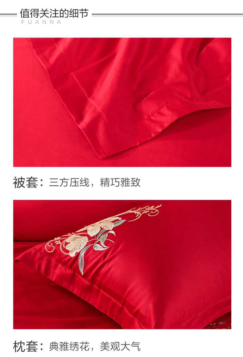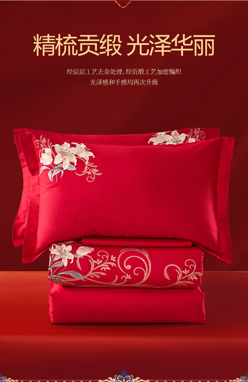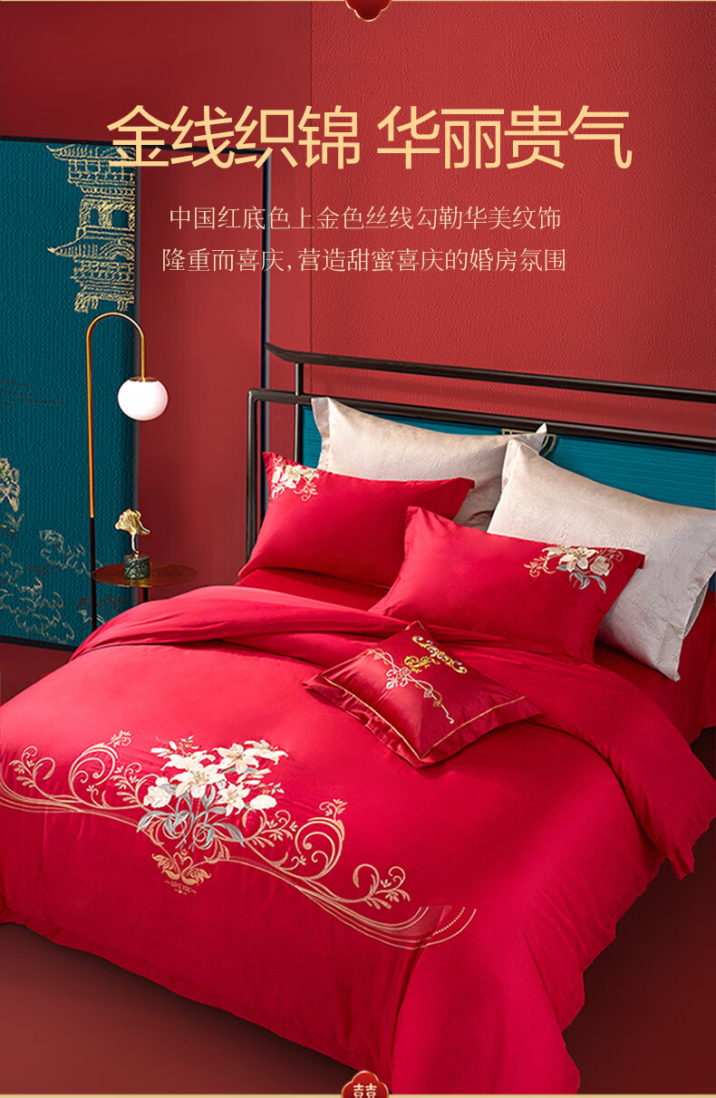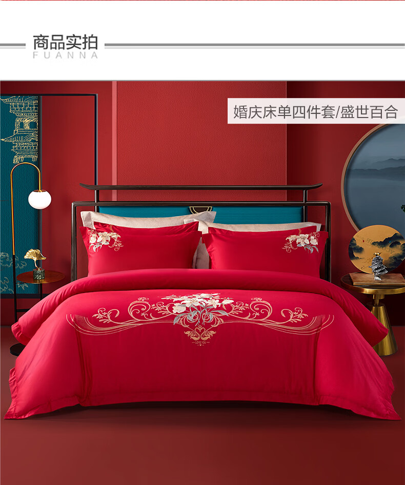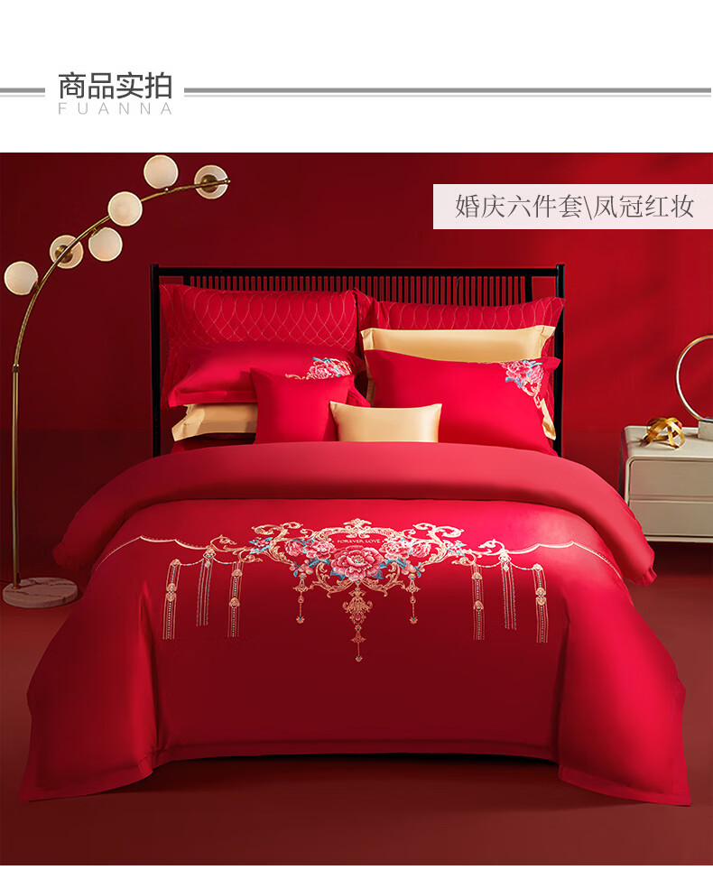 富安娜家纺 长绒棉刺绣婚庆组套 高级感结婚床品套装婚房陪嫁全套 凤冠红妆-【八件套】蚕丝二合一被 1.8米/2米床(230*229cm)