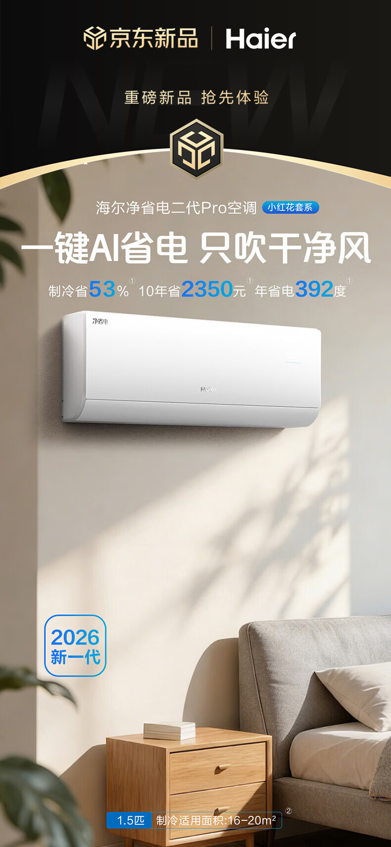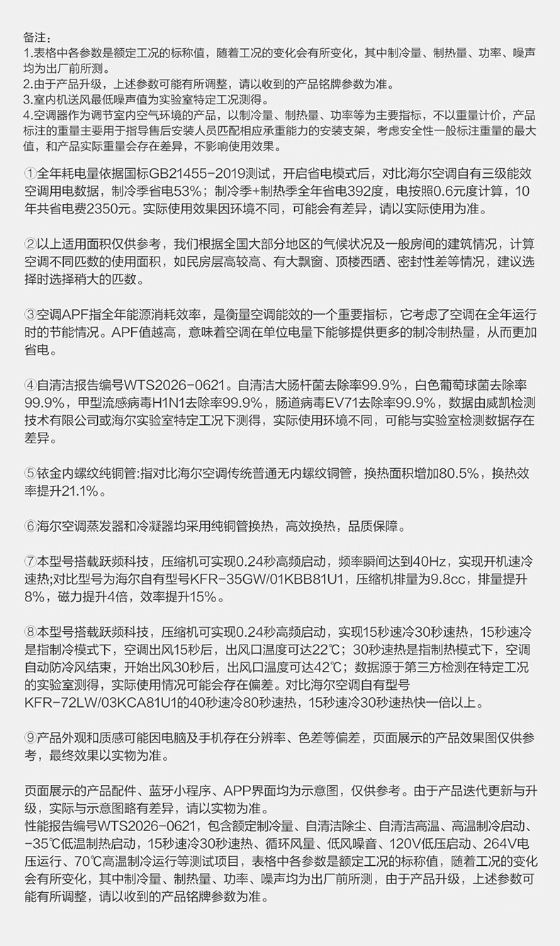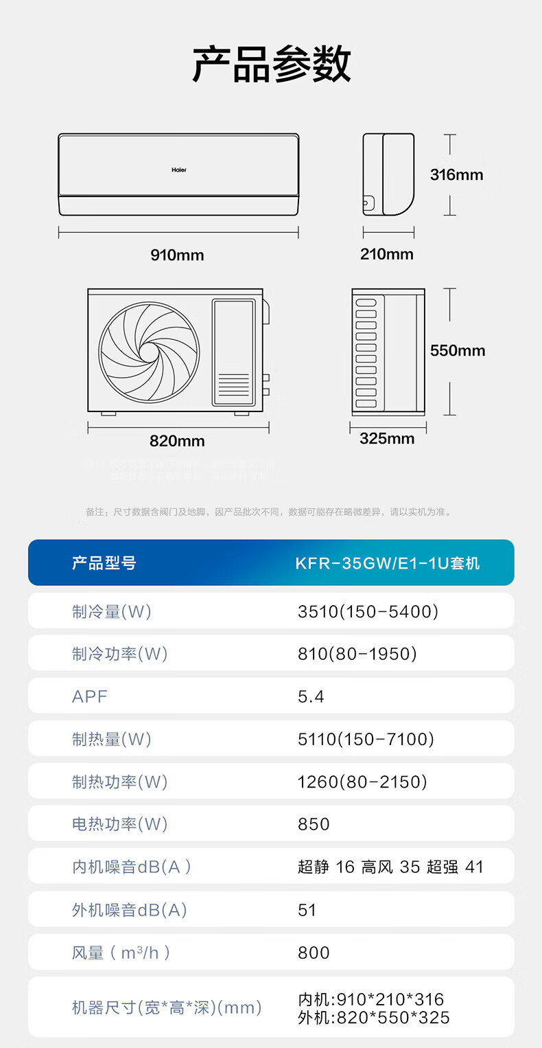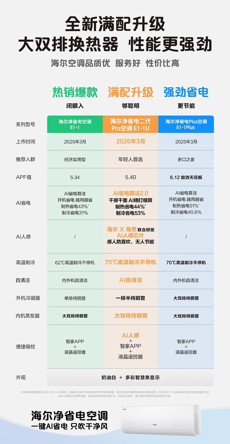 海尔空调 净省电二代Pro大1.5匹挂机 新一级能效变频 升级大双排纯铜管蒸发器 国家补贴KFR-35GW/E1-1U
