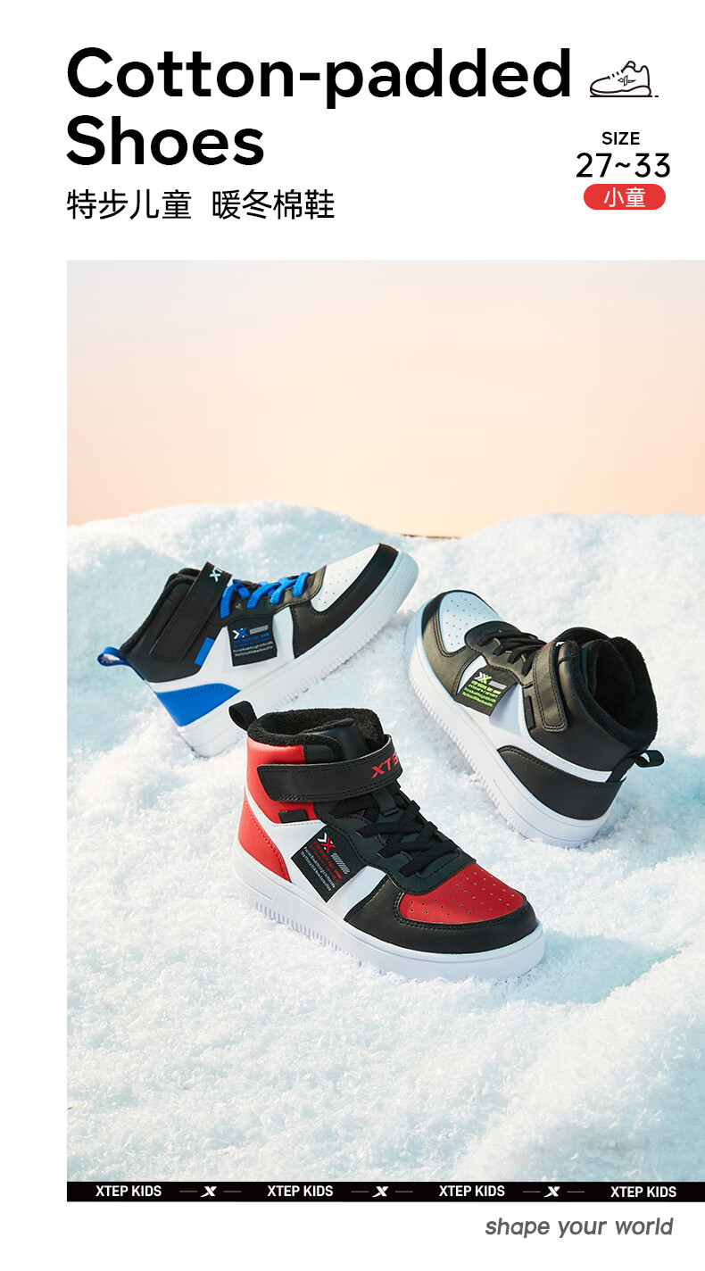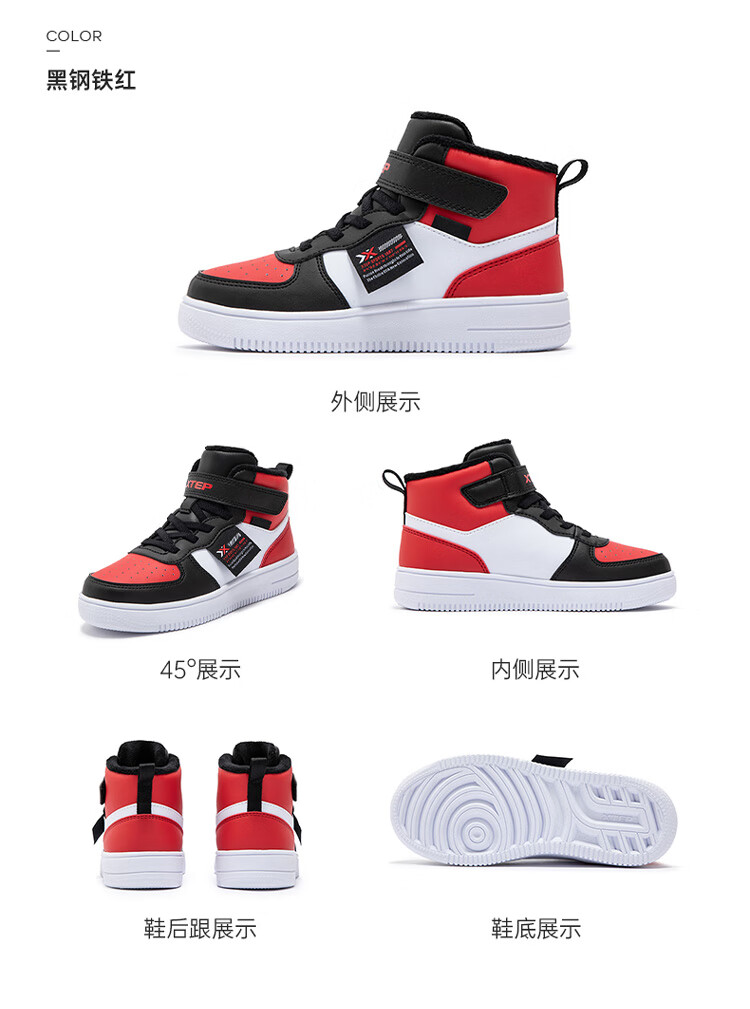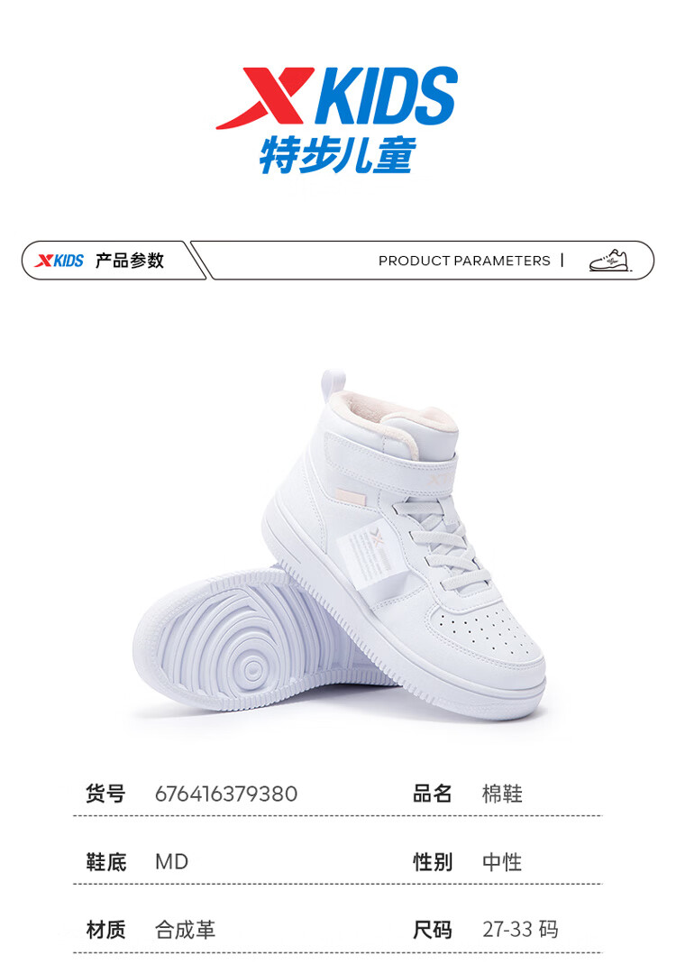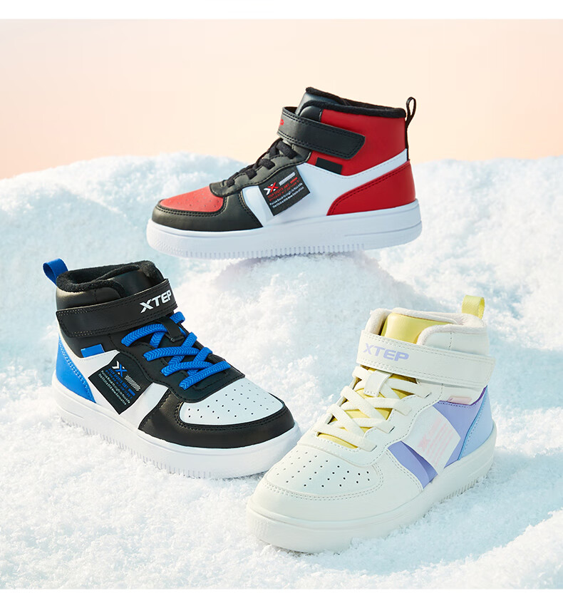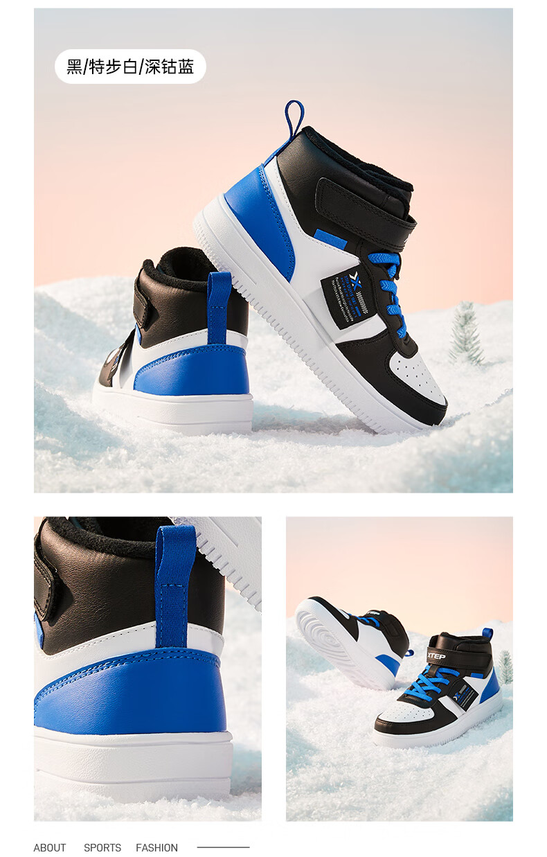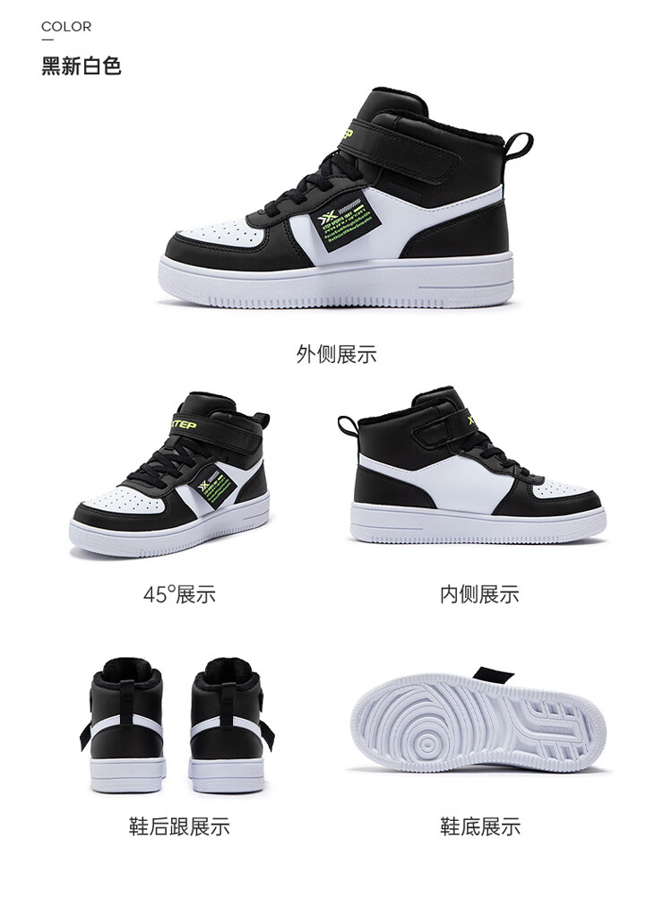 特步(XTEP)儿童童鞋男女童小童革面魔术贴搭带高帮棉鞋 黑/新白色 32码