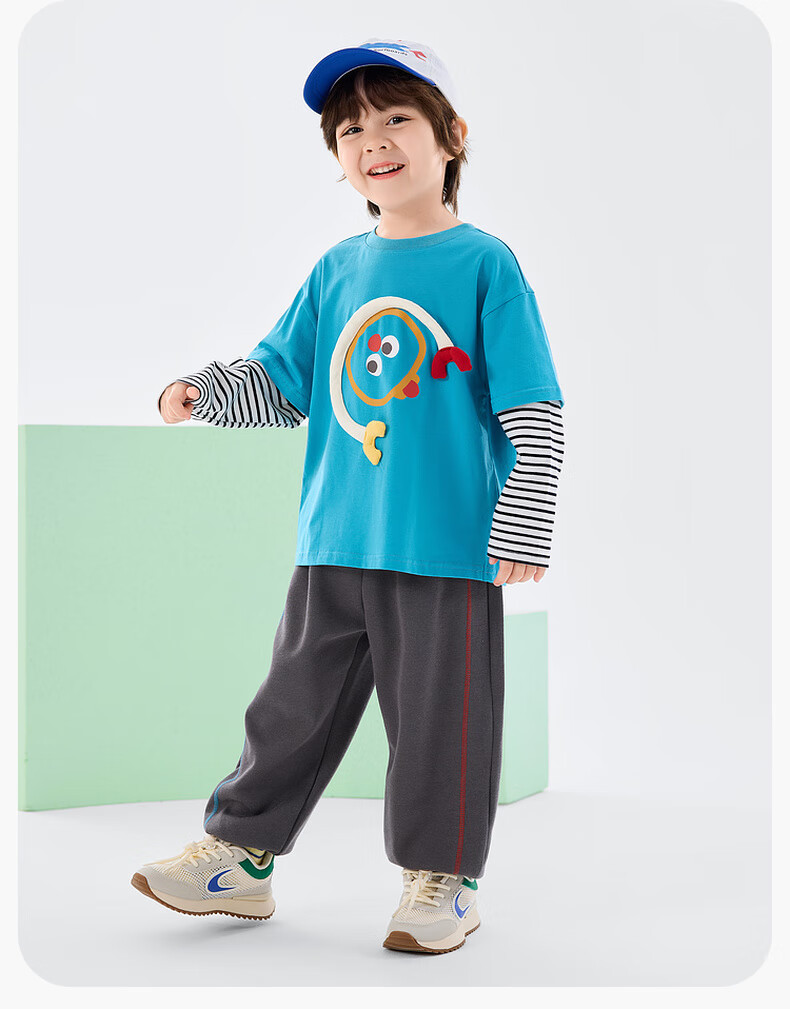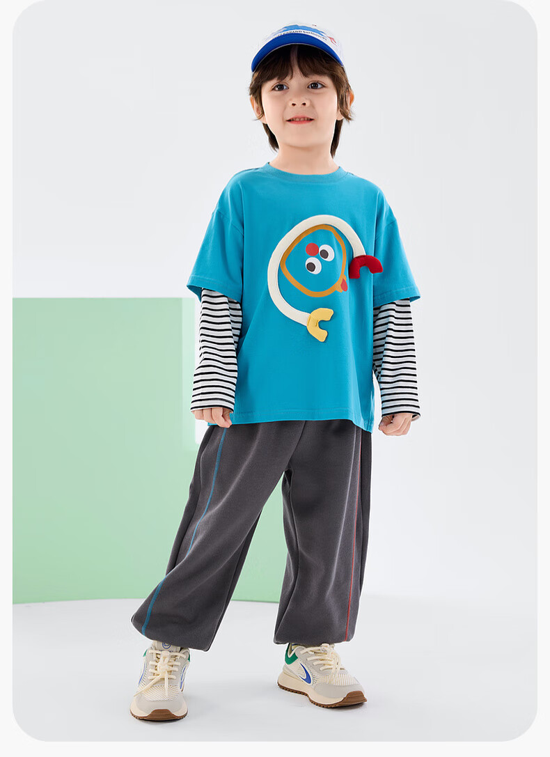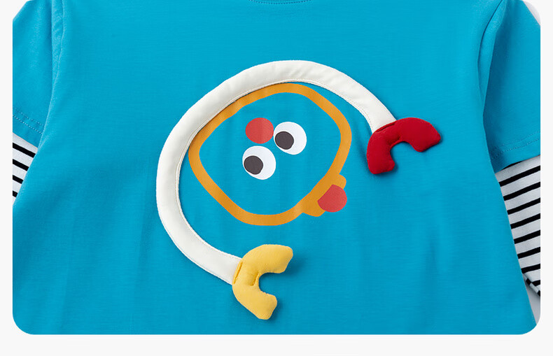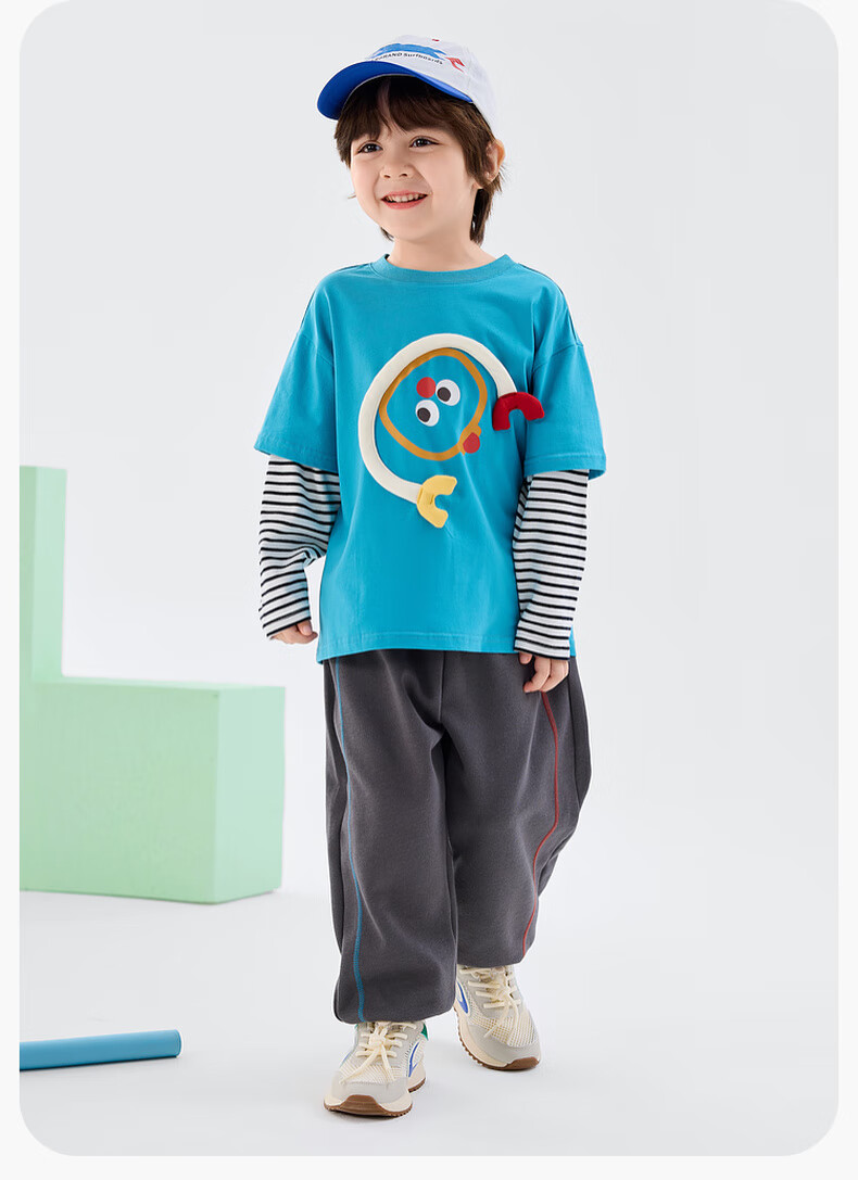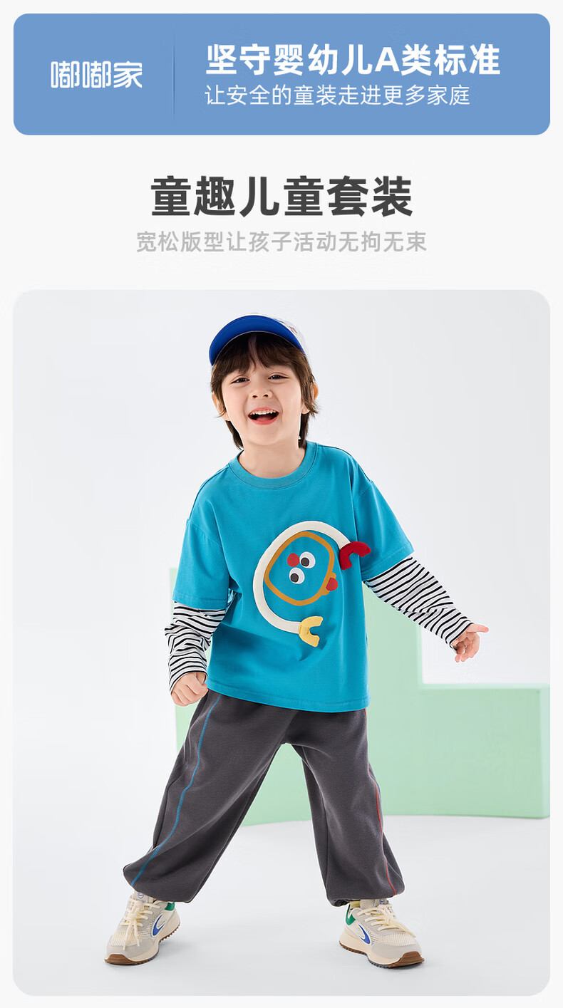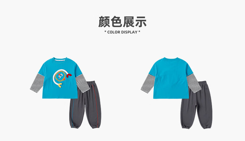 嘟嘟家男童春季卡通套装儿童透气假两件长袖T恤女童休闲针织裤子童装潮 比斯开蓝 100