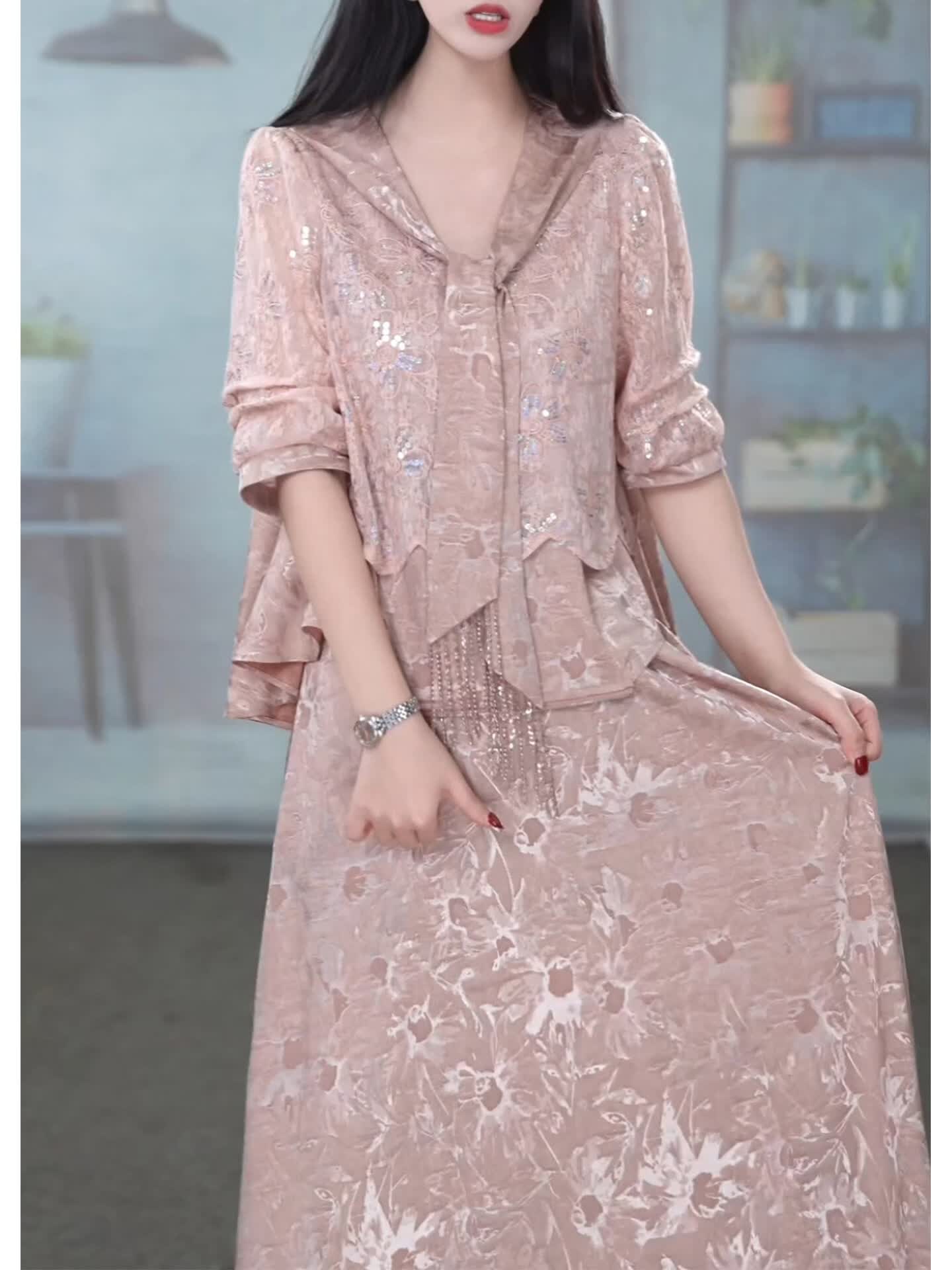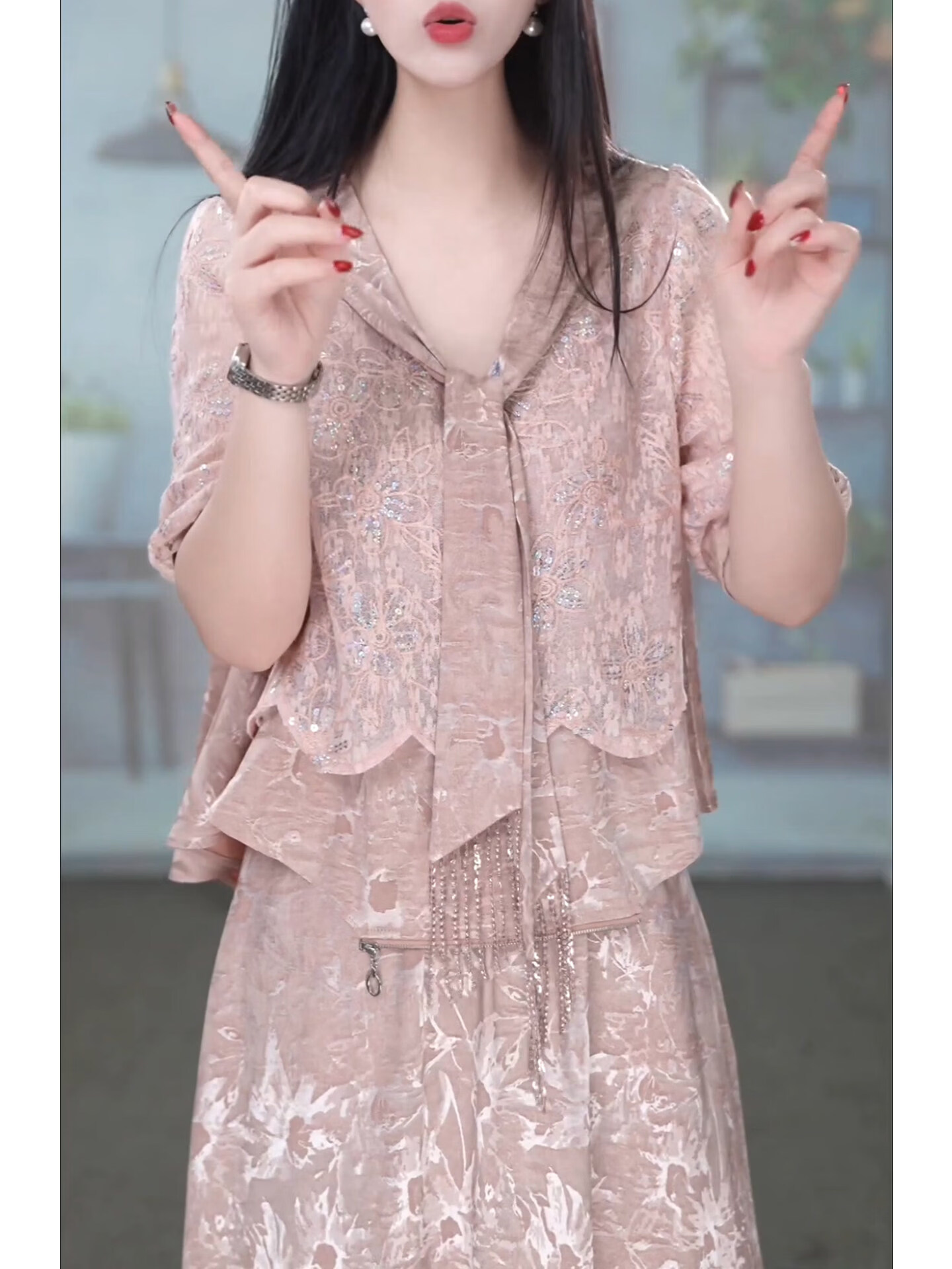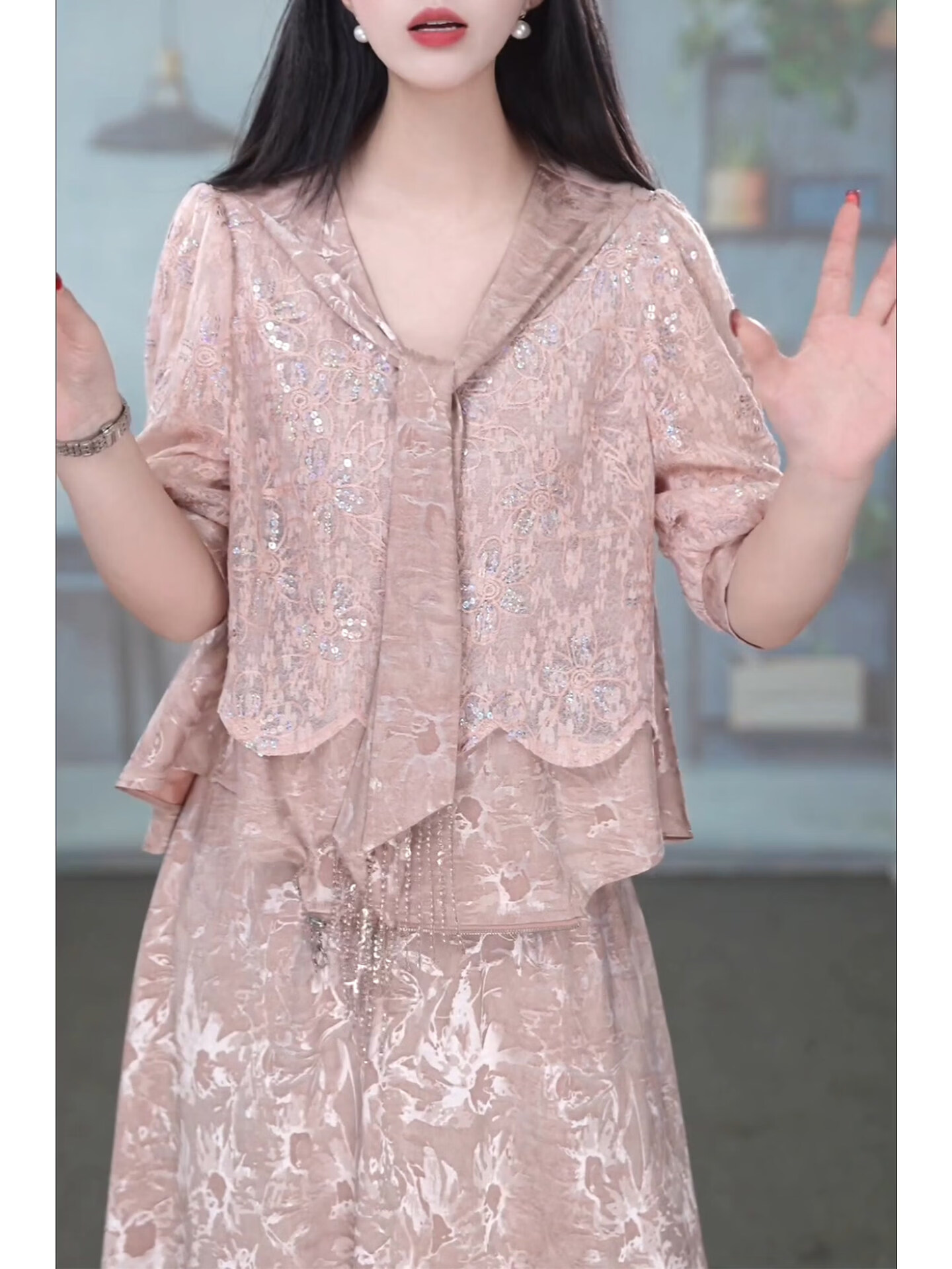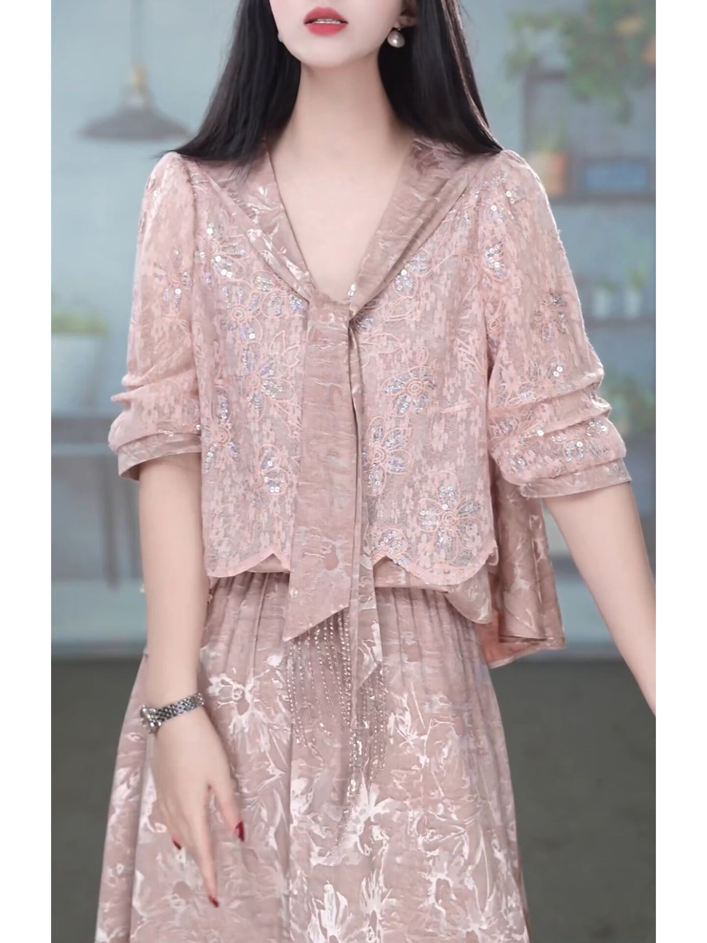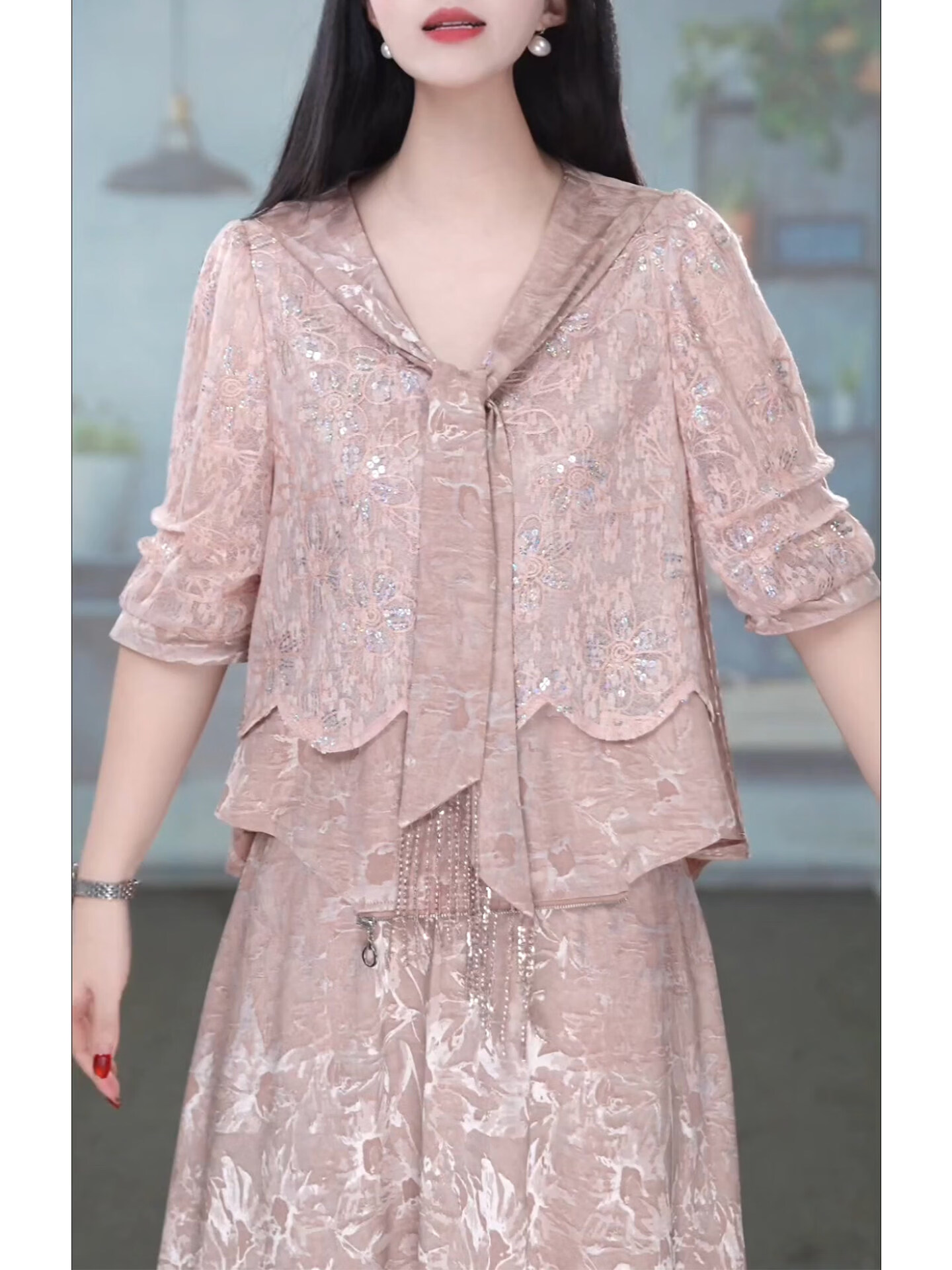 香影芬洋气V领五分袖两件套连衣裙女2026年春夏新款妈妈提花半身裙套装 图片色 4XL (建议141-155斤)