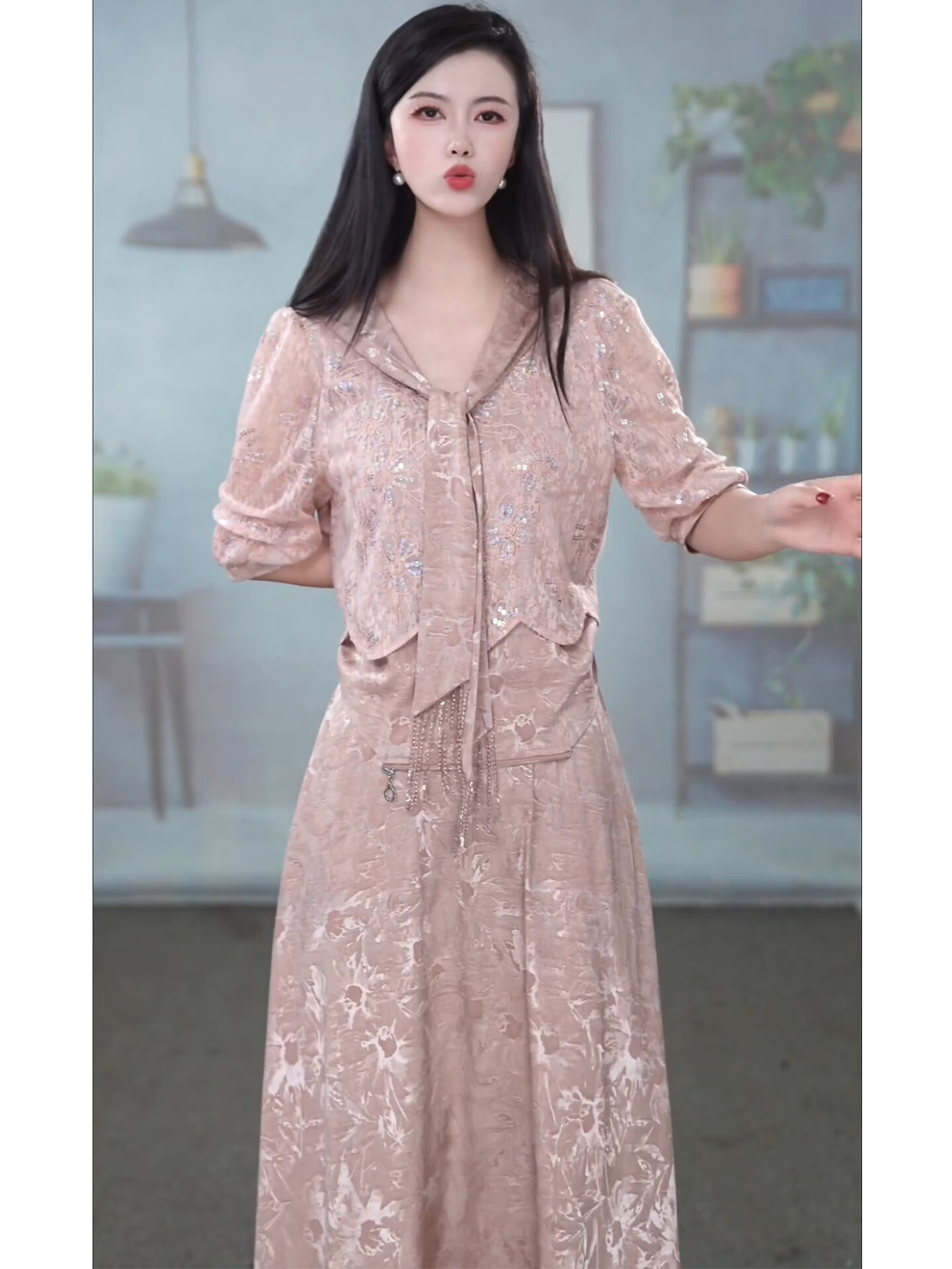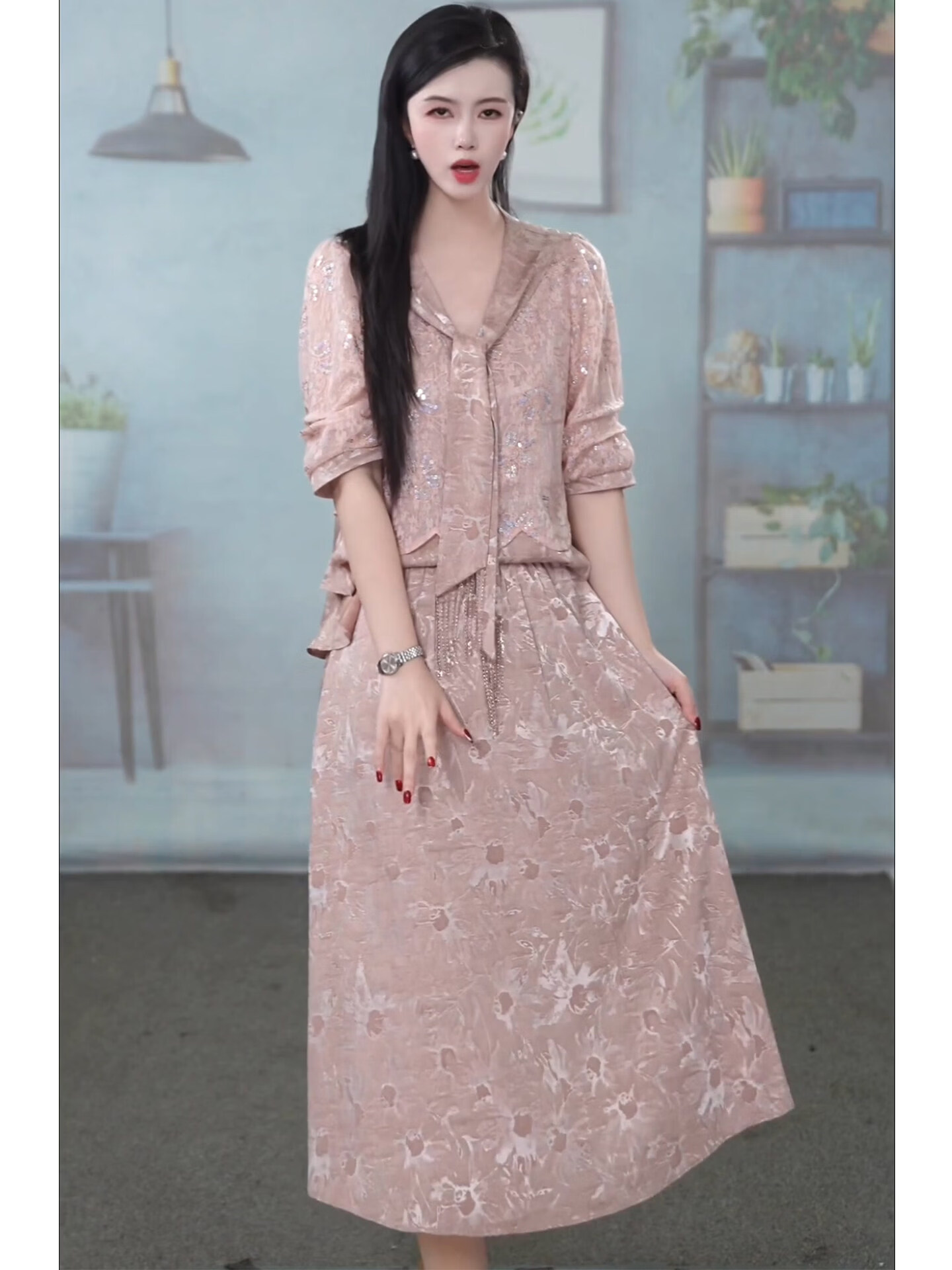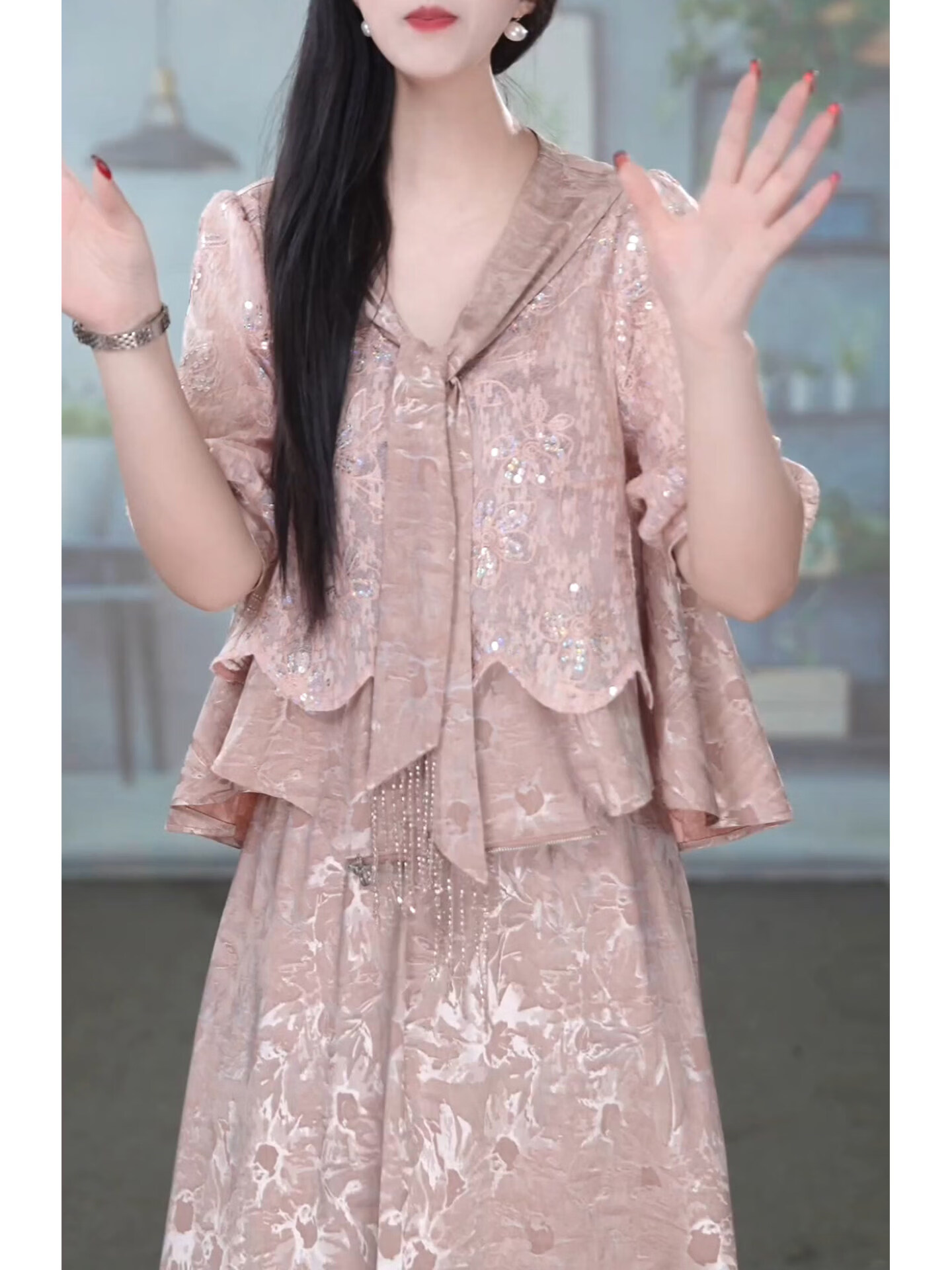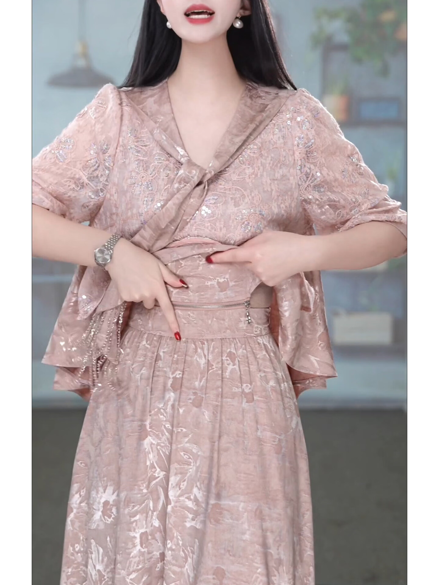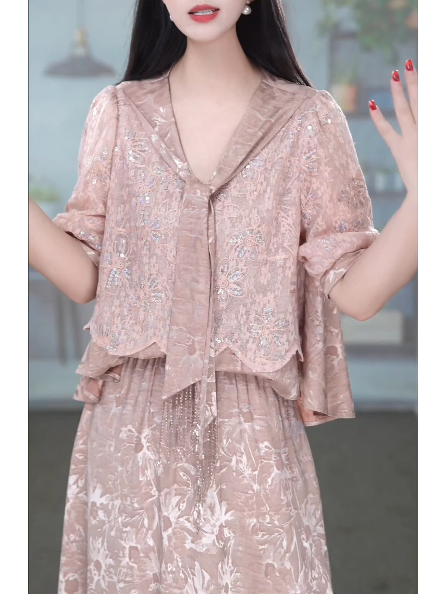 香影芬洋气V领五分袖两件套连衣裙女2026年春夏新款妈妈提花半身裙套装 图片色 4XL (建议141-155斤)