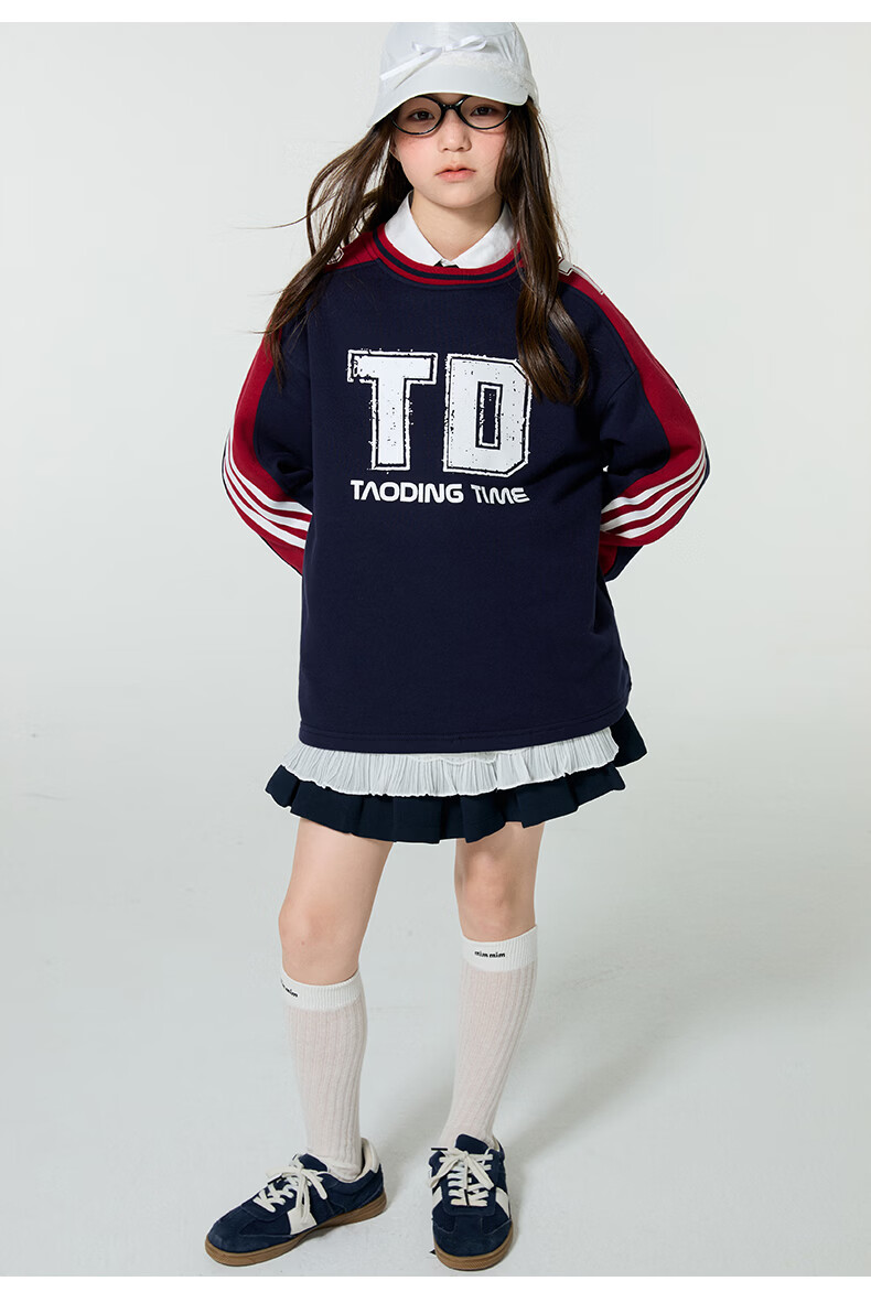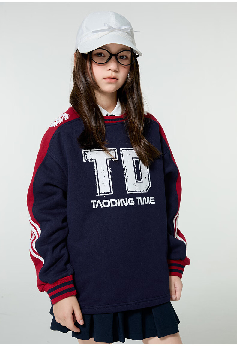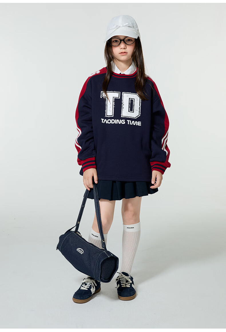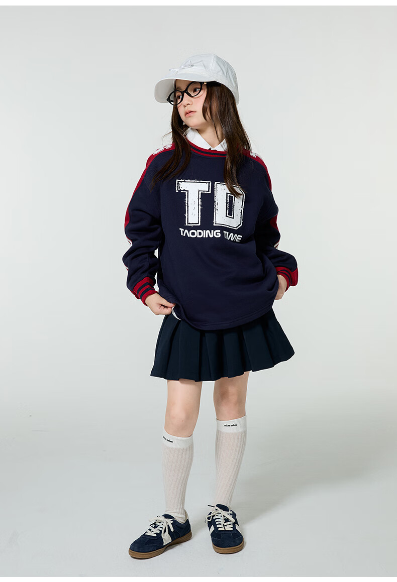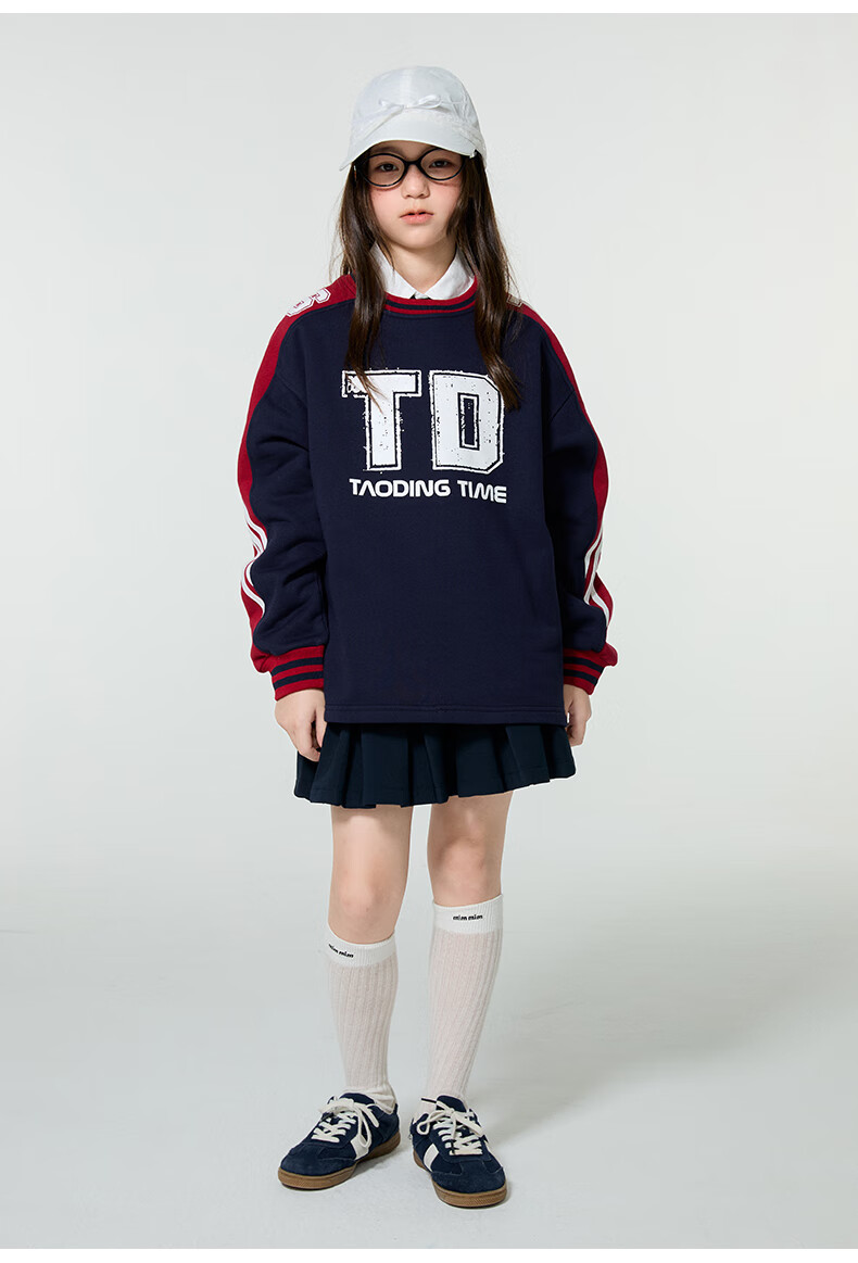 淘町女童卫衣一体绒圆领秋冬新款中大童美式运动加绒数字撞色印花 藏青色 120