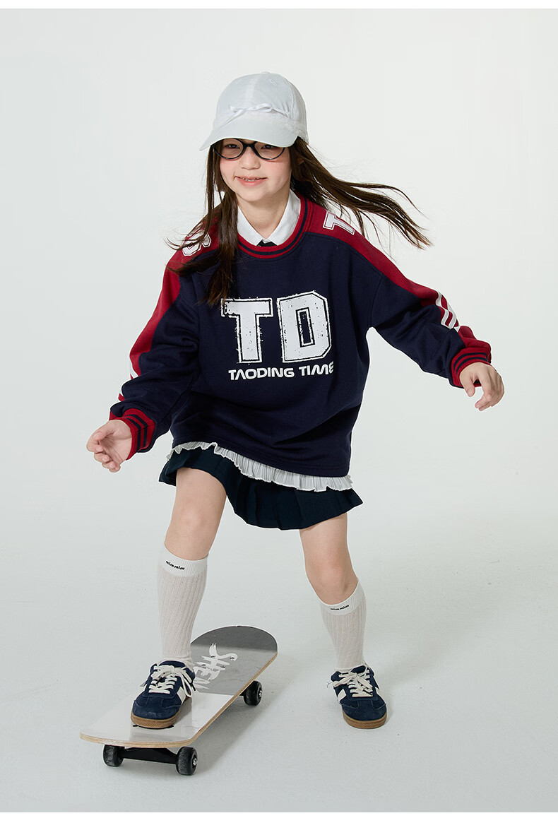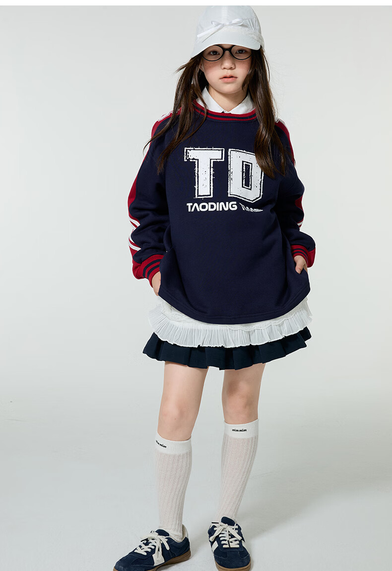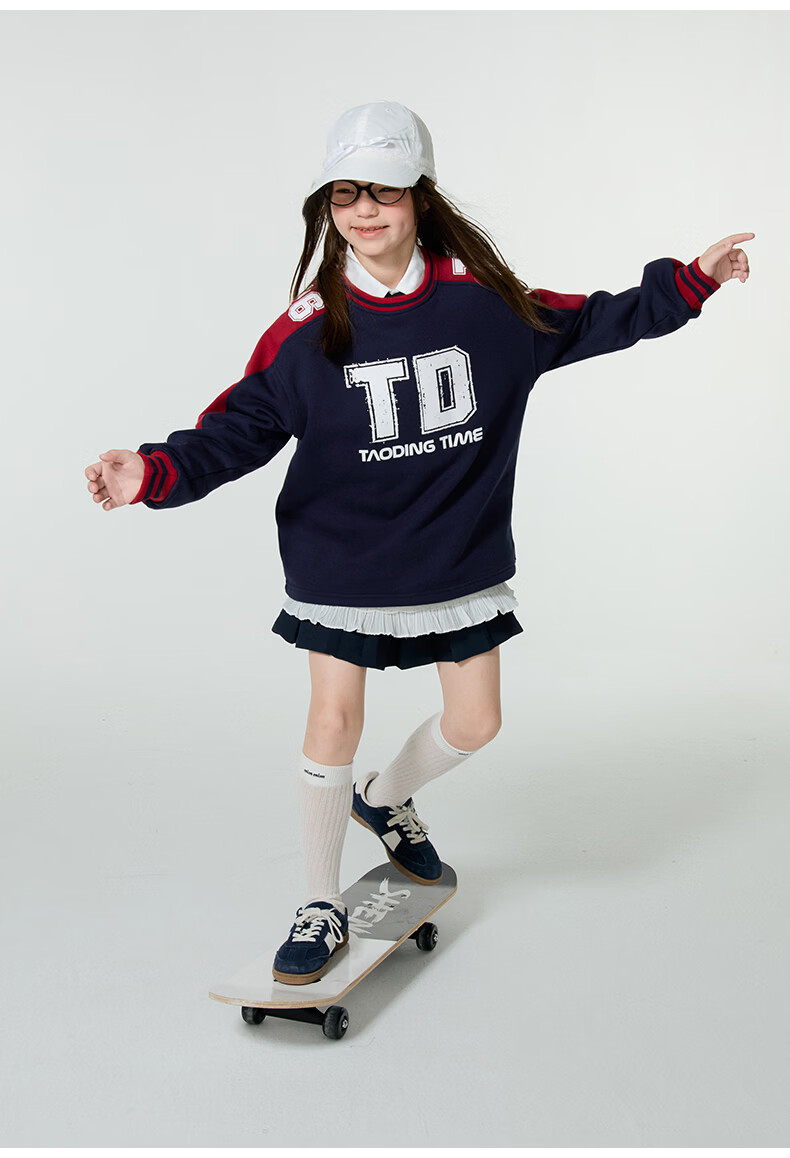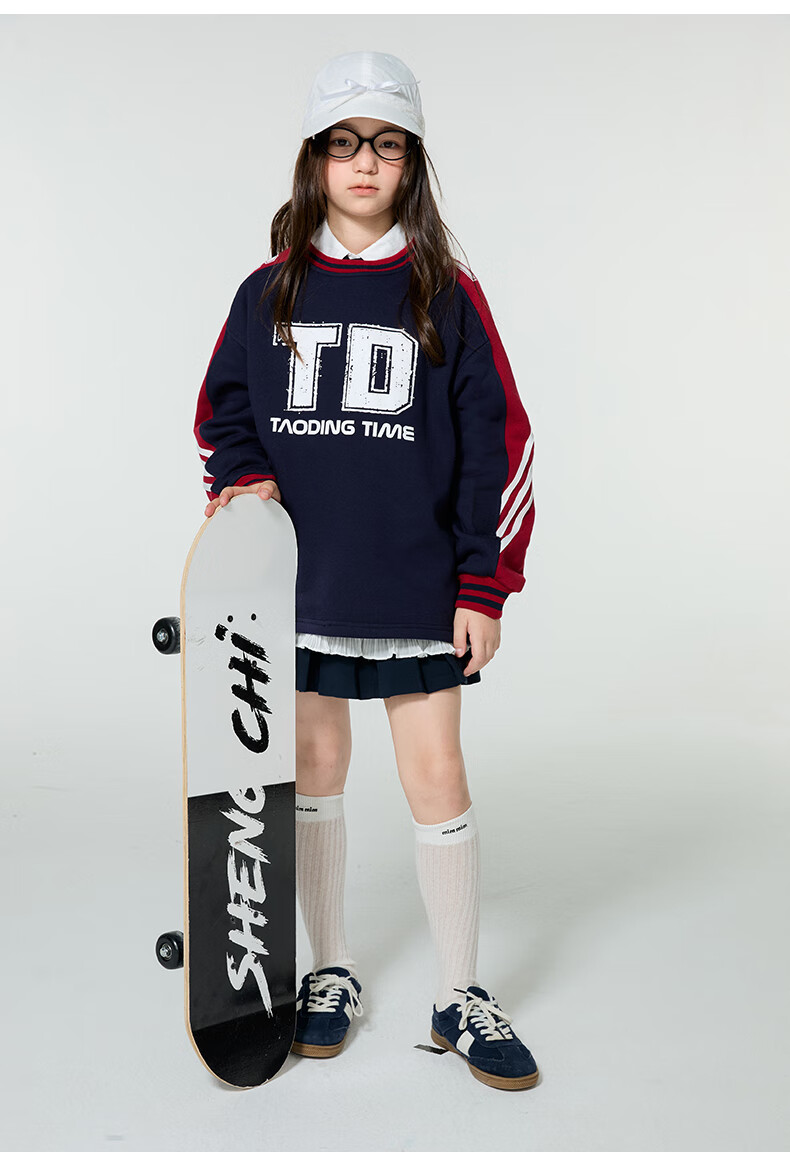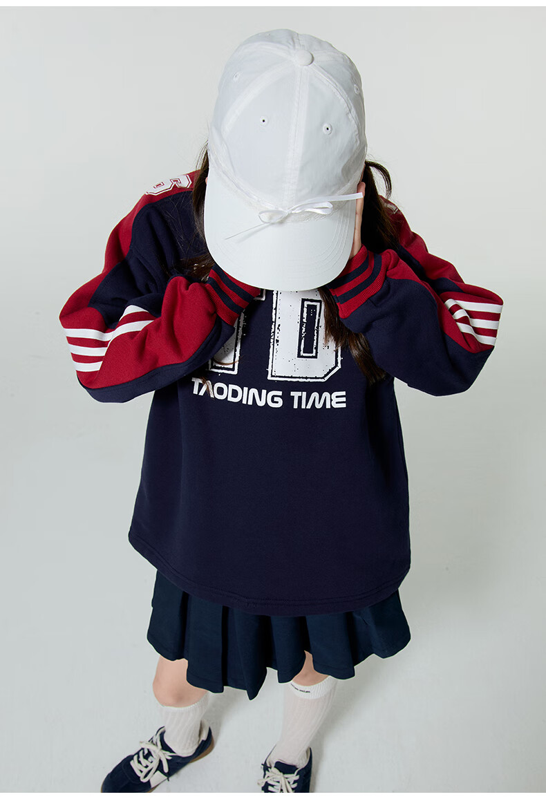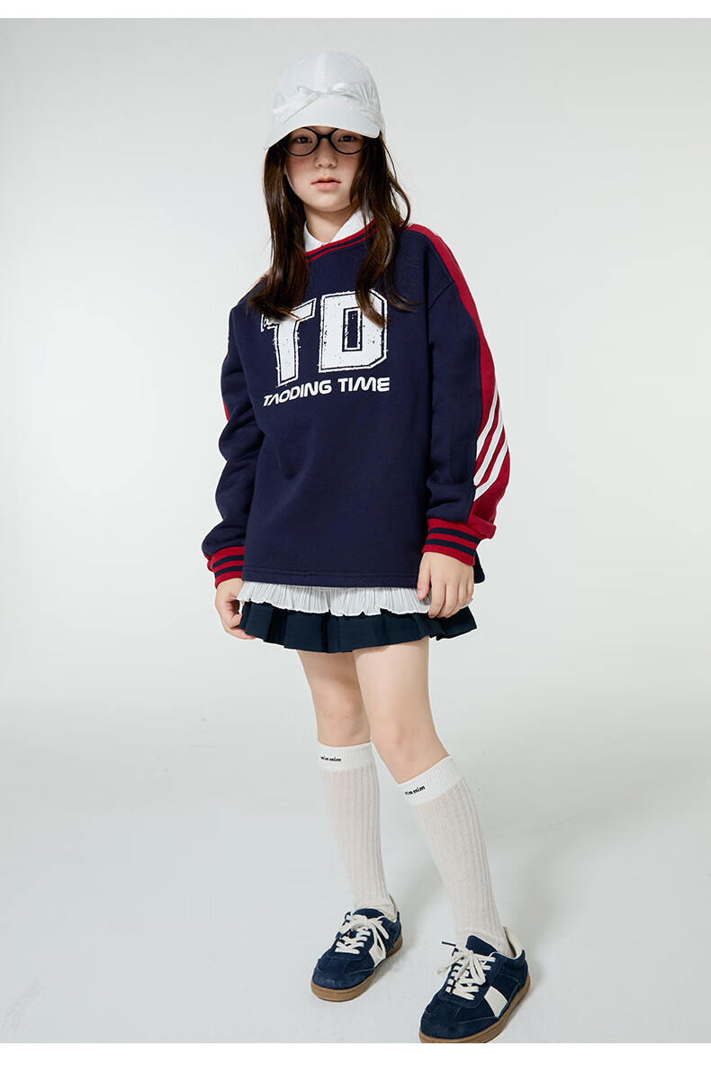 淘町女童卫衣一体绒圆领秋冬新款中大童美式运动加绒数字撞色印花 藏青色 120