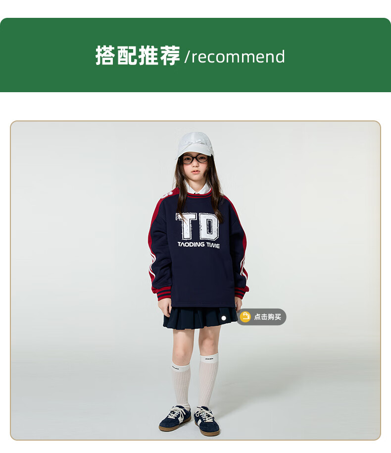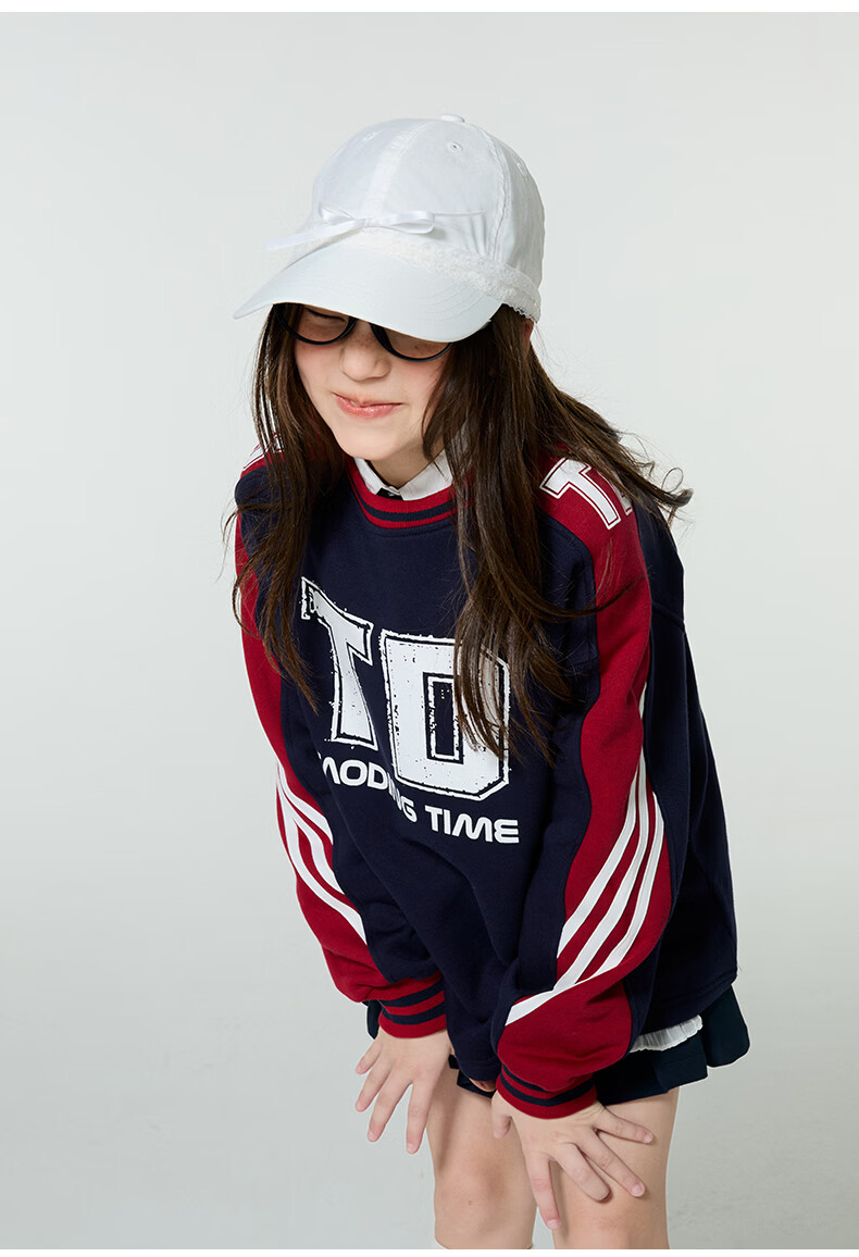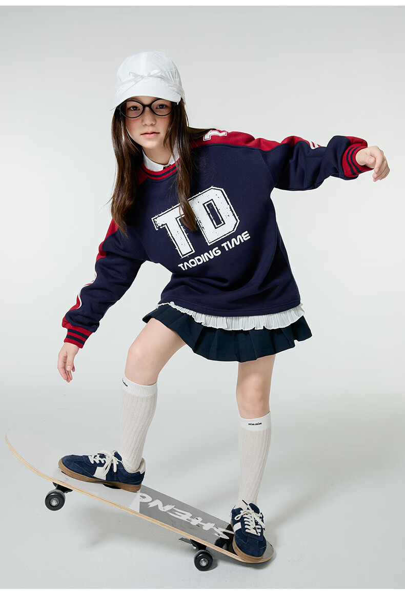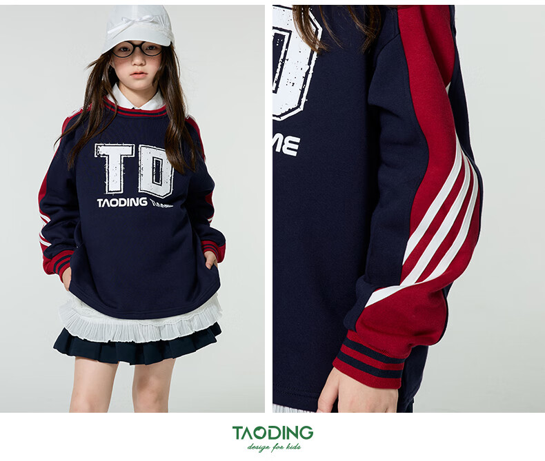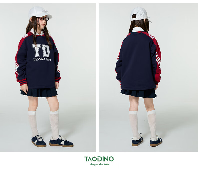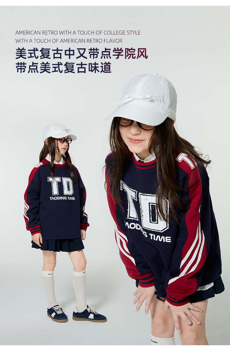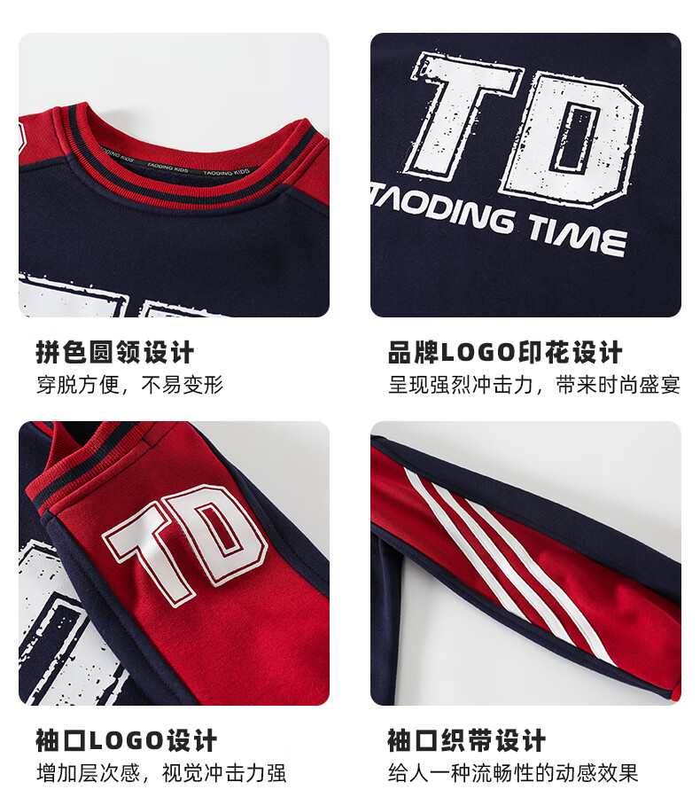 淘町女童卫衣一体绒圆领秋冬新款中大童美式运动加绒数字撞色印花 藏青色 120