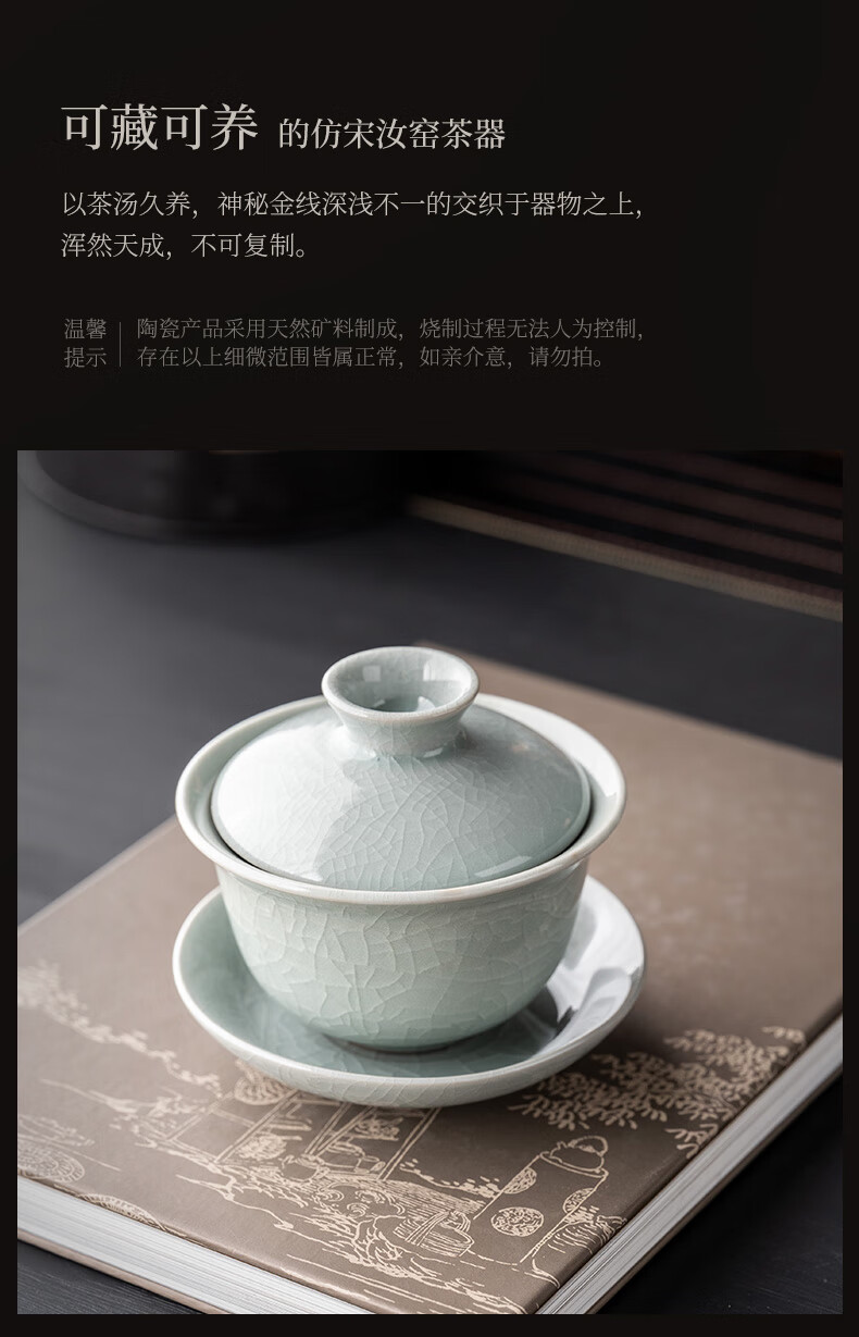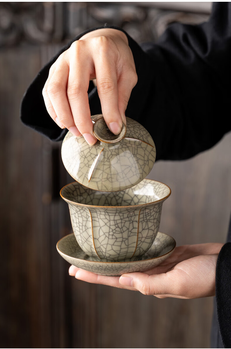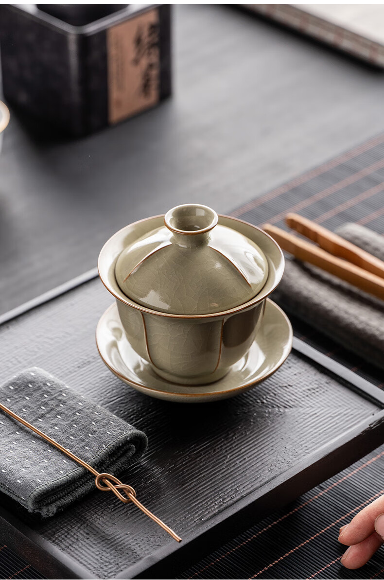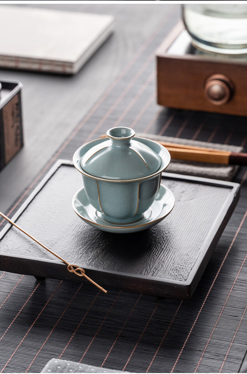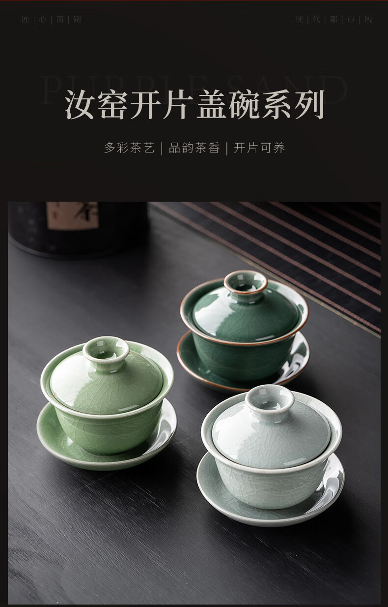 韵化【精选直发】汝窑三才盖碗开片铁线单个高档可养家用泡茶茶碗礼盒 密釉绿三才盖碗