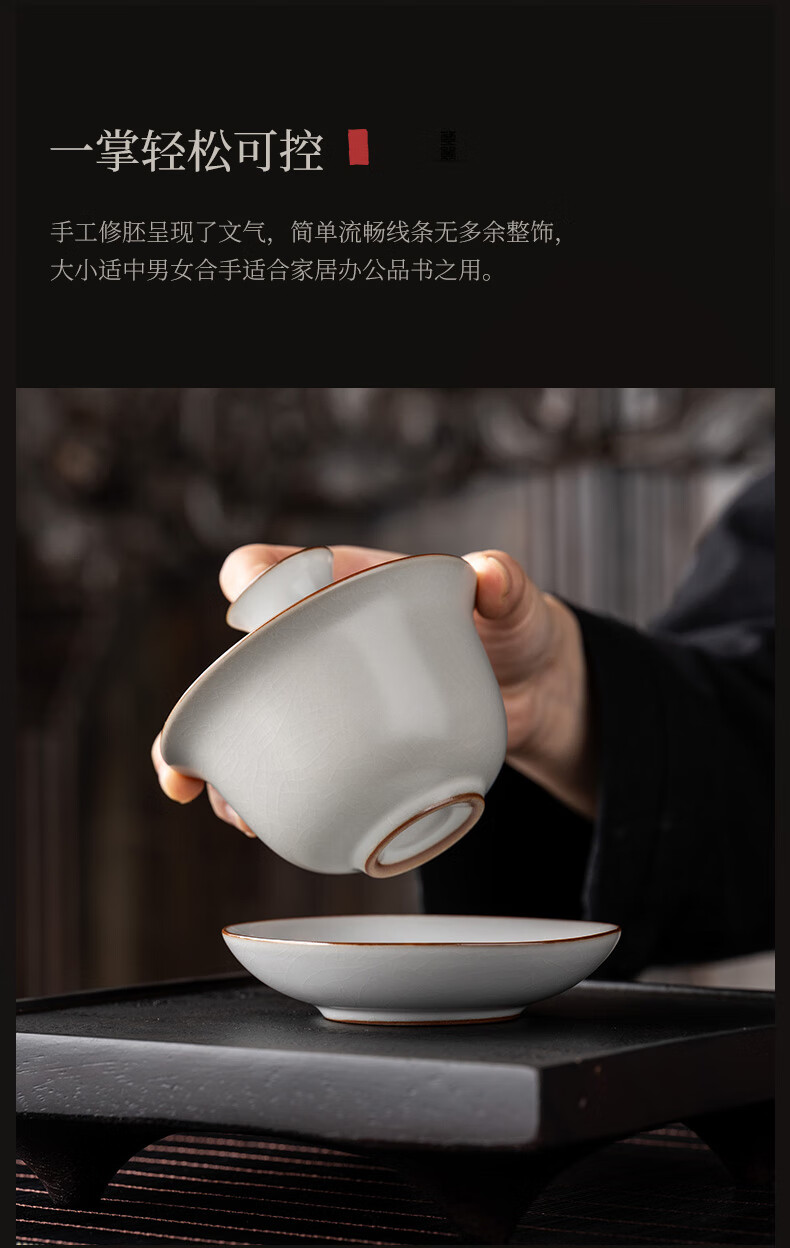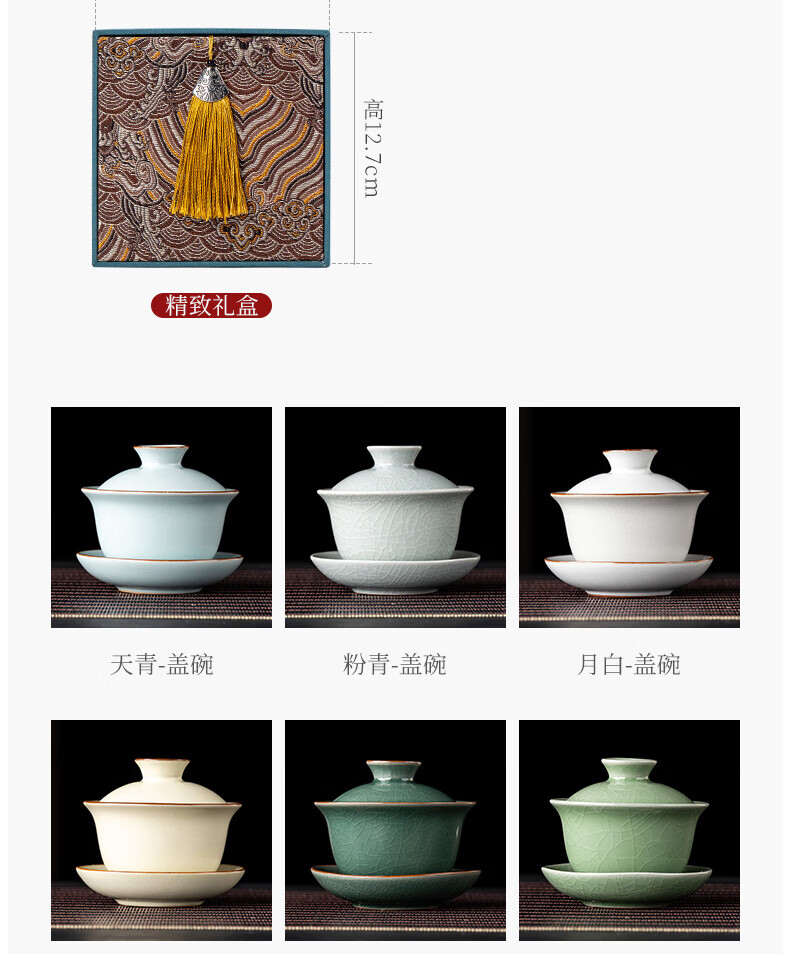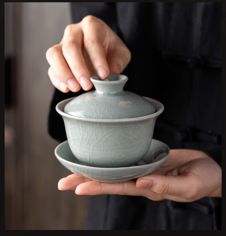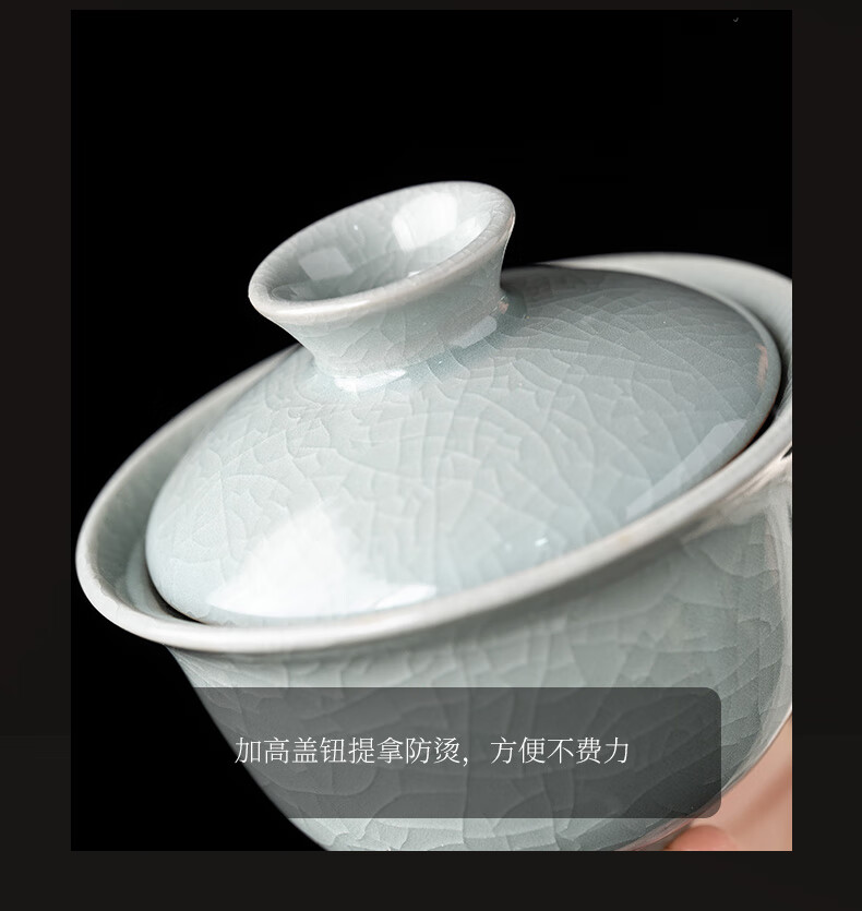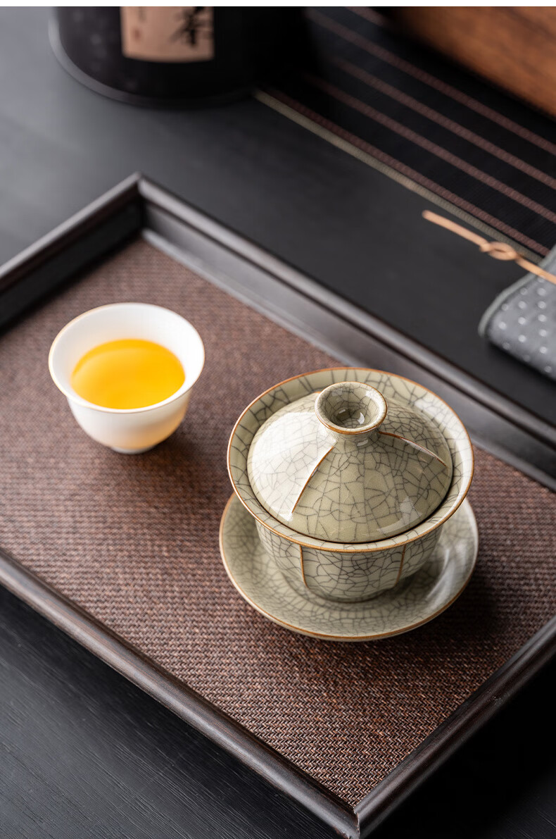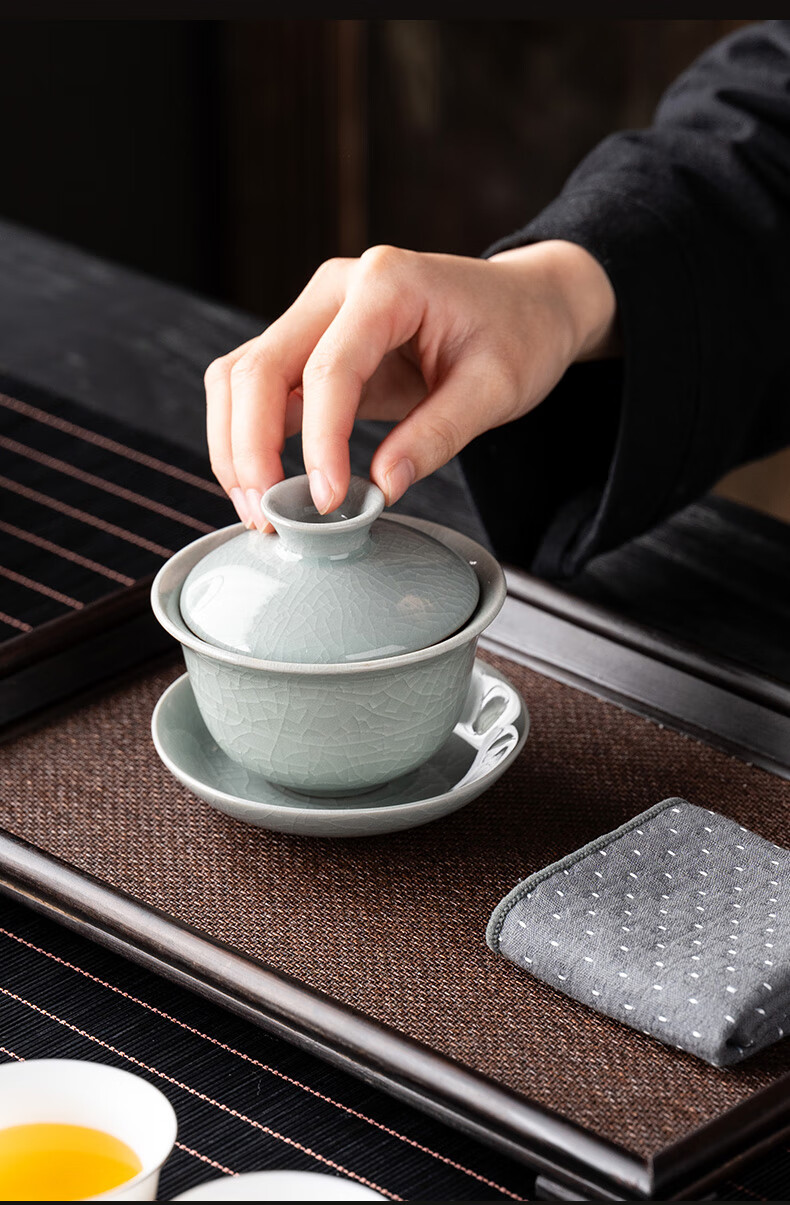 韵化【精选直发】汝窑三才盖碗开片铁线单个高档可养家用泡茶茶碗礼盒 密釉绿三才盖碗