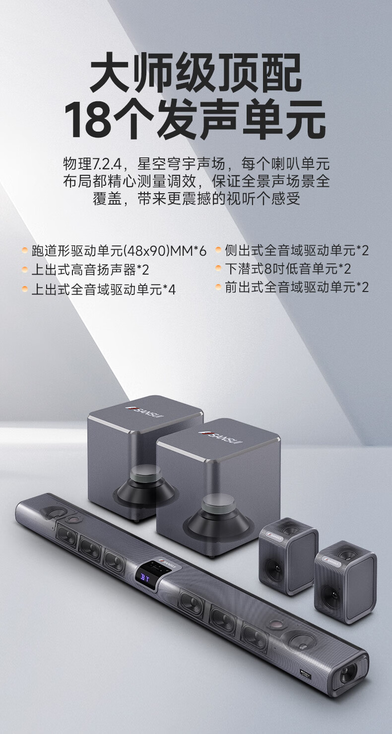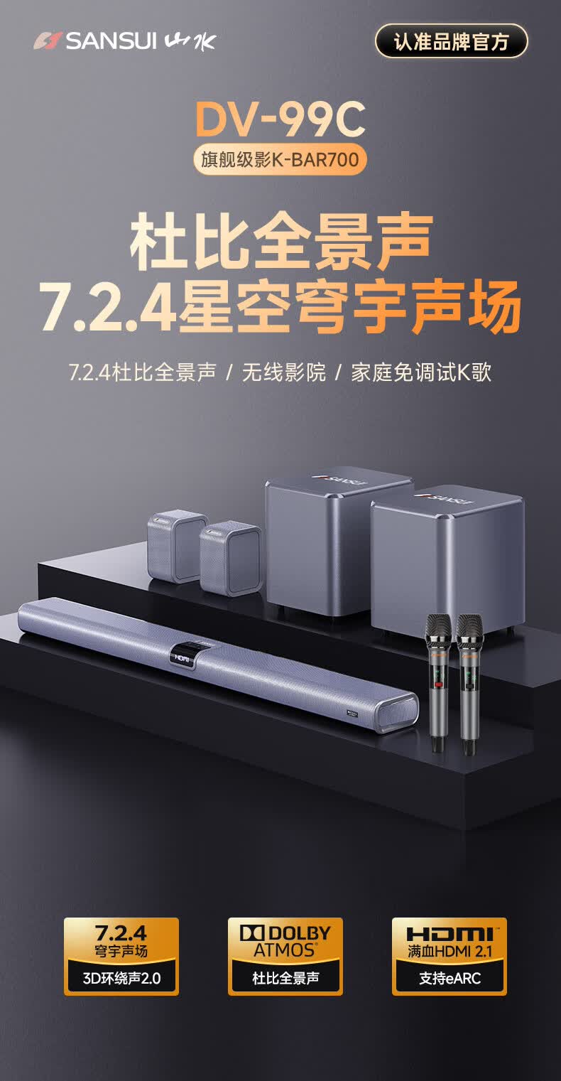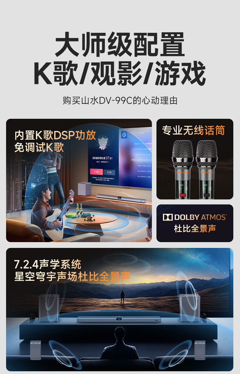 山水(SANSUI)DV-99C 7.2.4杜比全景声回音壁电视音响 家庭影院KTV套装投影仪智能蓝牙壁挂免布线无线带麦克风