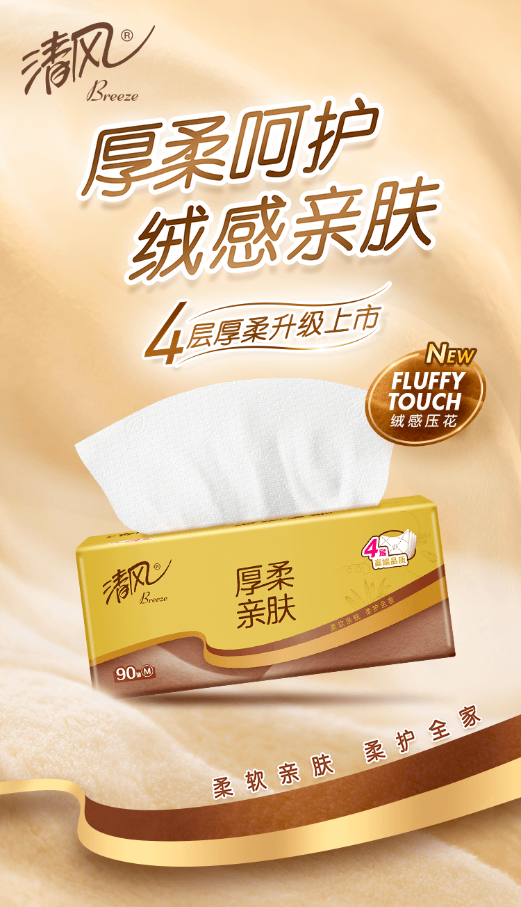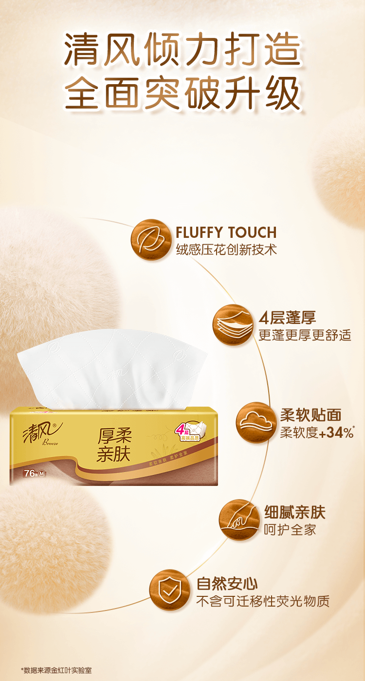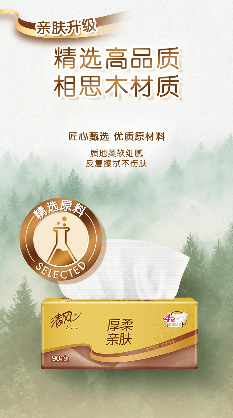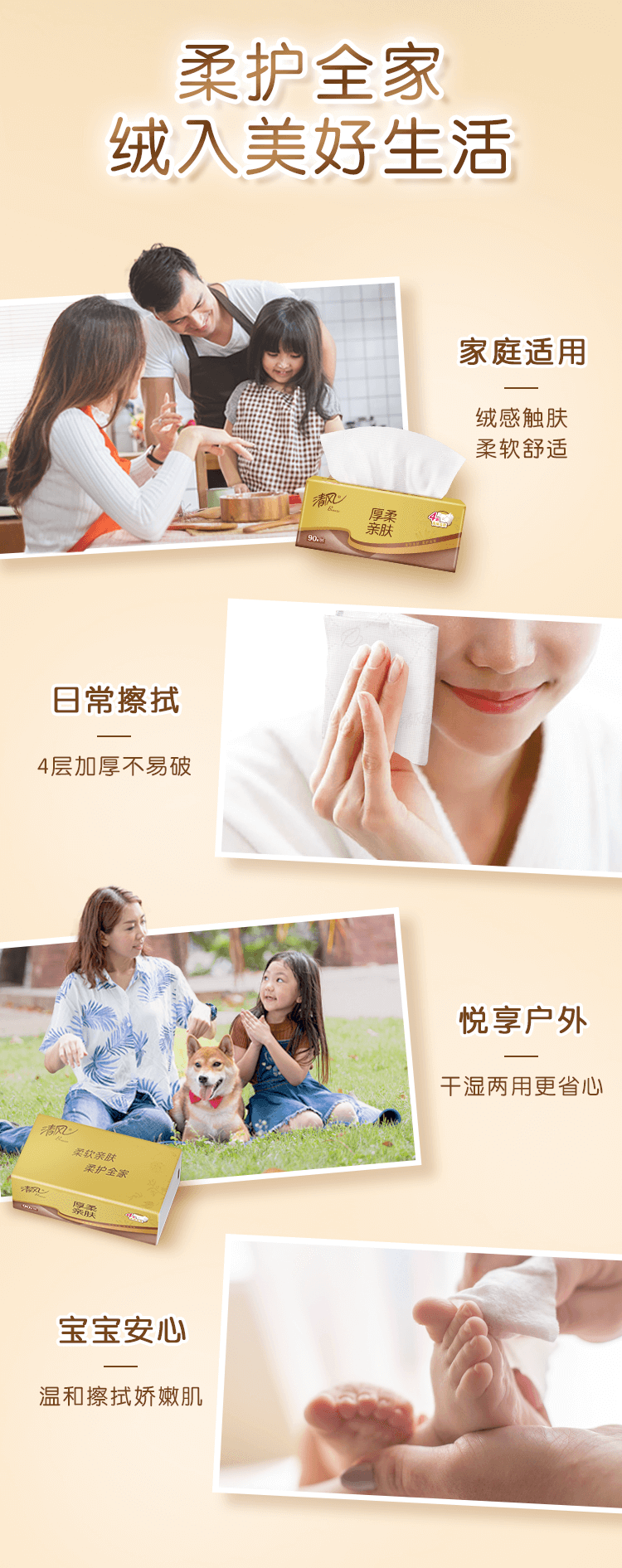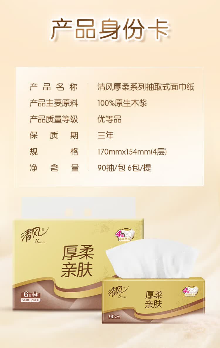 清风抽纸 厚柔4层90抽*6包M码 可湿水卫生纸巾 餐巾纸抽 面巾纸 提装