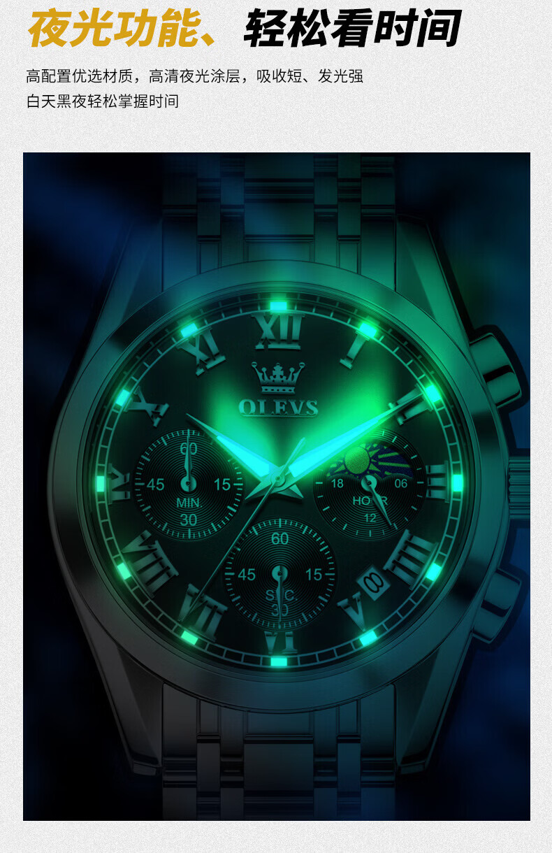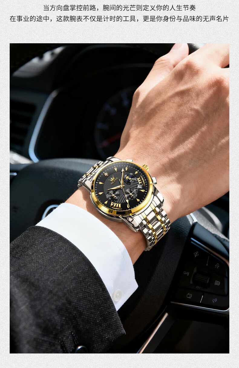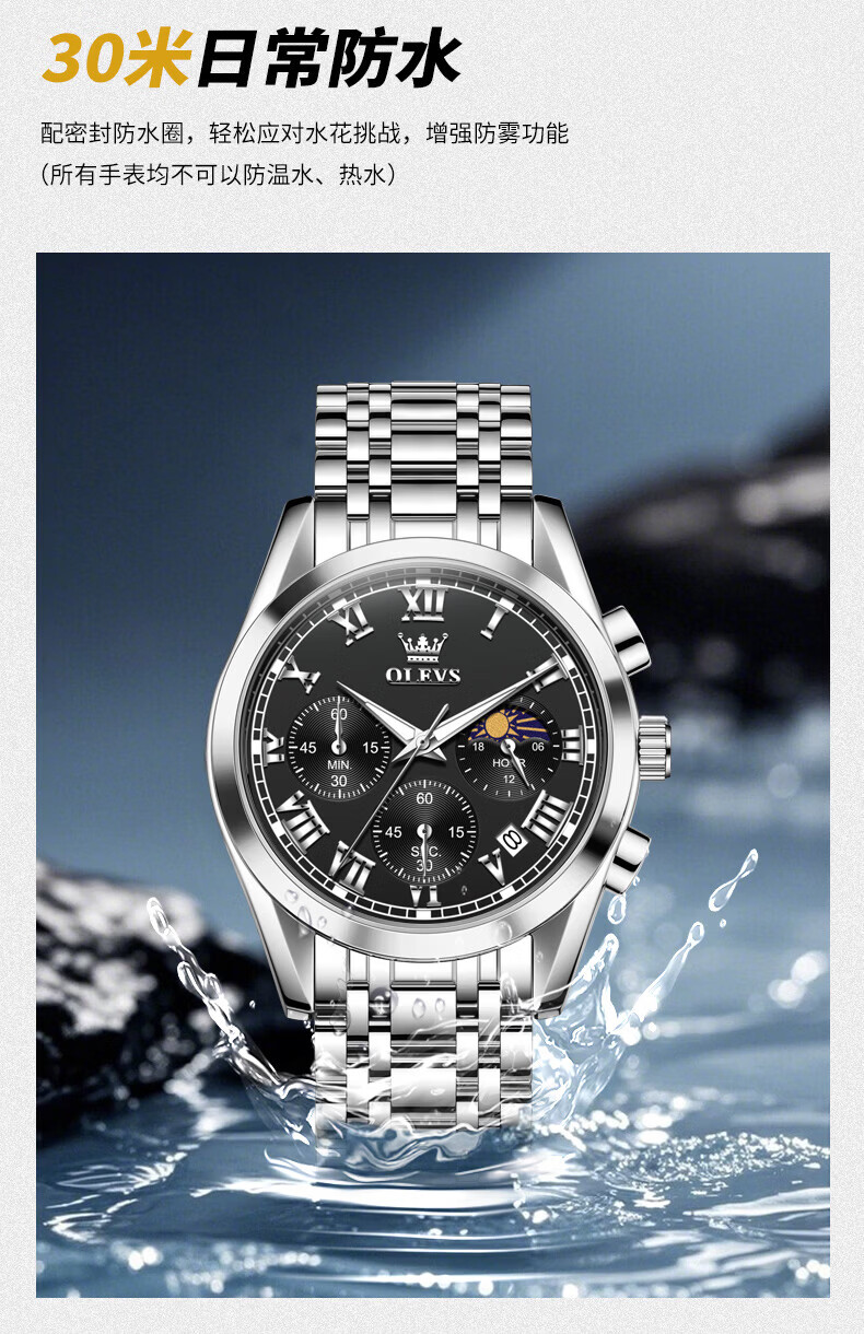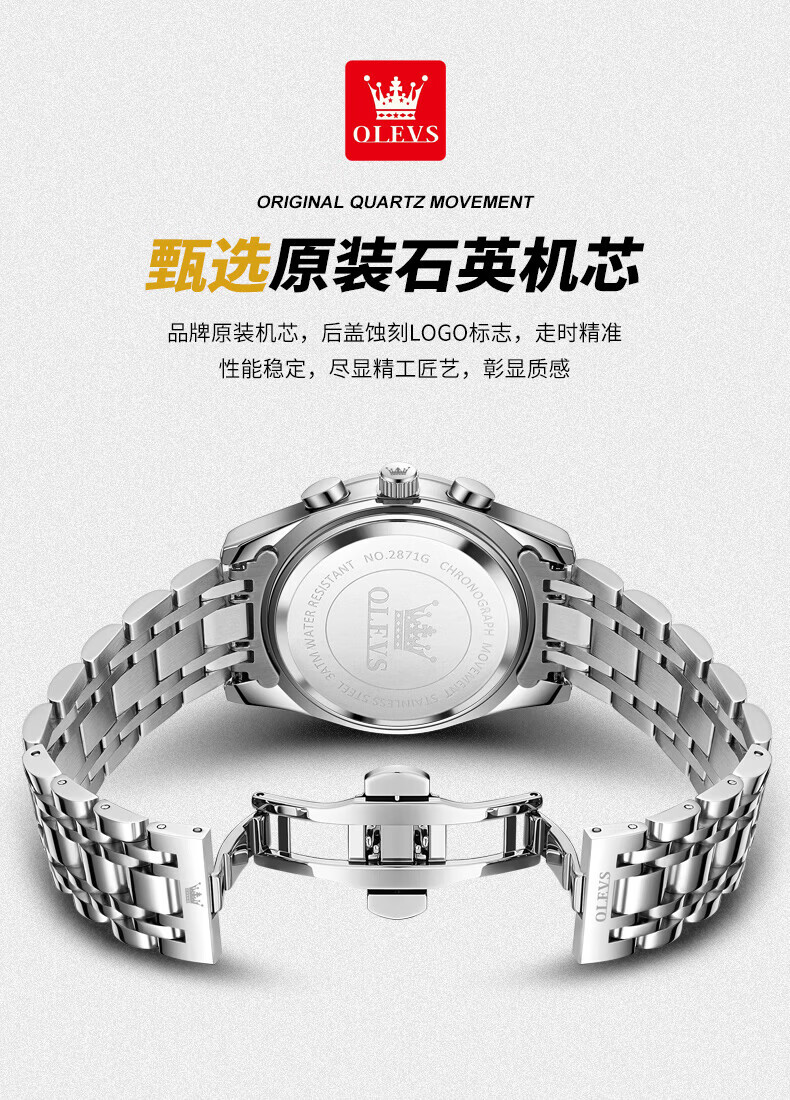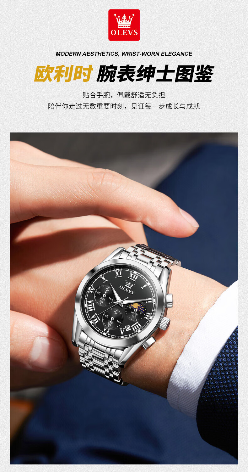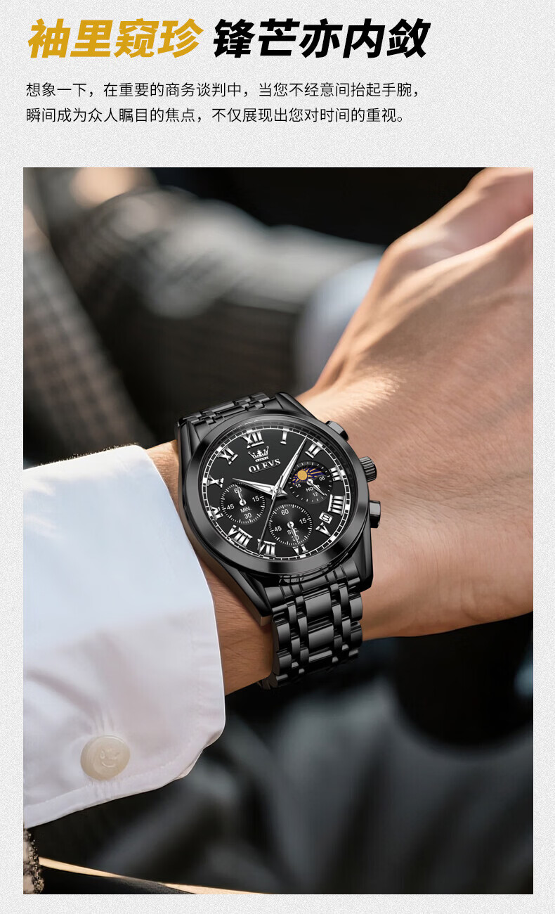 欧利时(OLEVS)瑞士认证品牌十大名表2026新款手表男石英表夜光防水商务男士手表 典藏版2871钢带全黑 免费刻字 终身质保