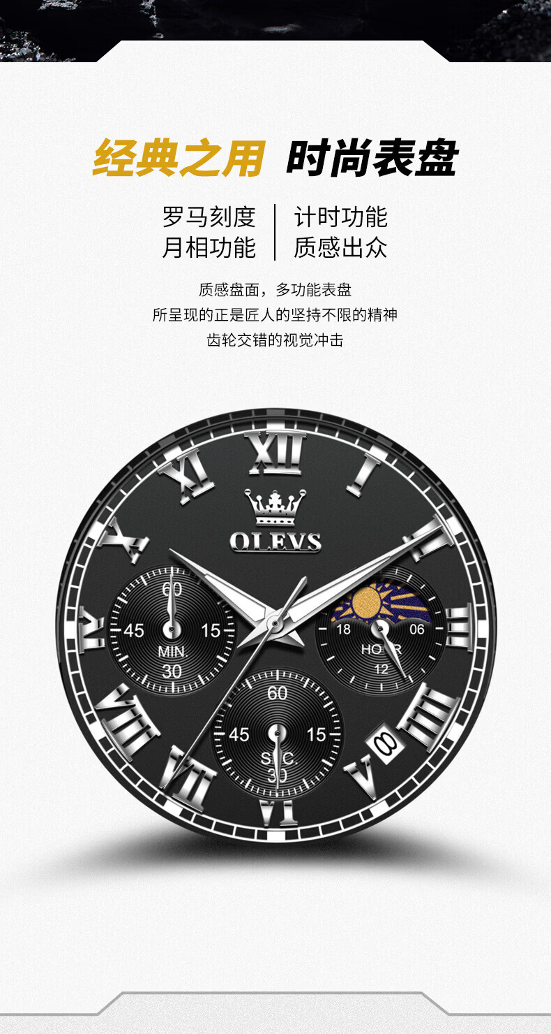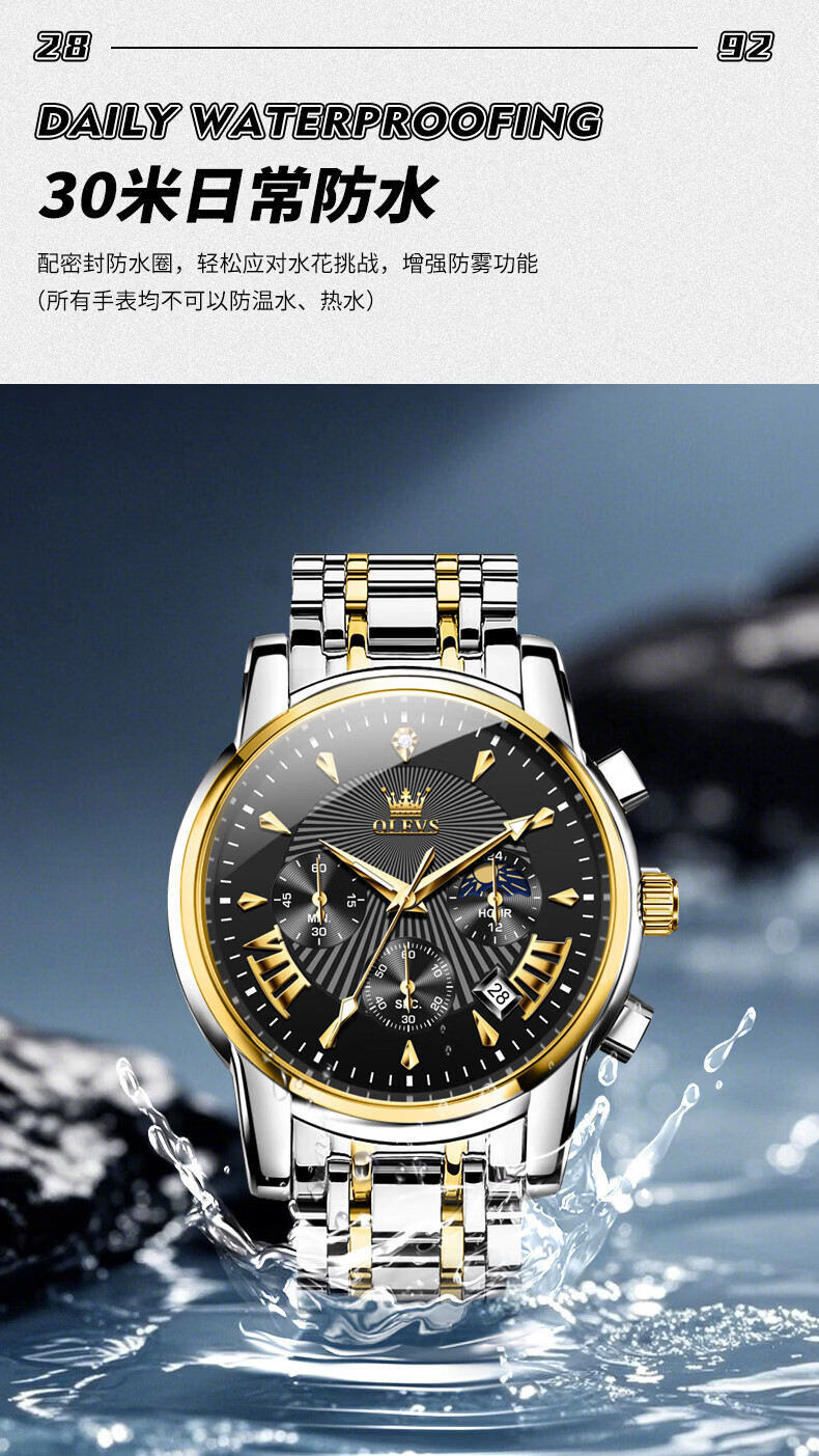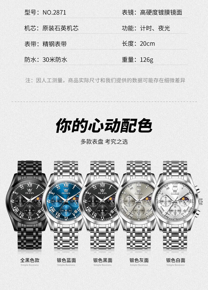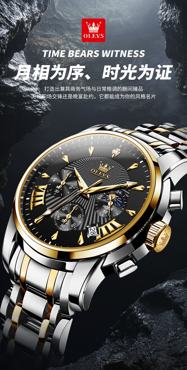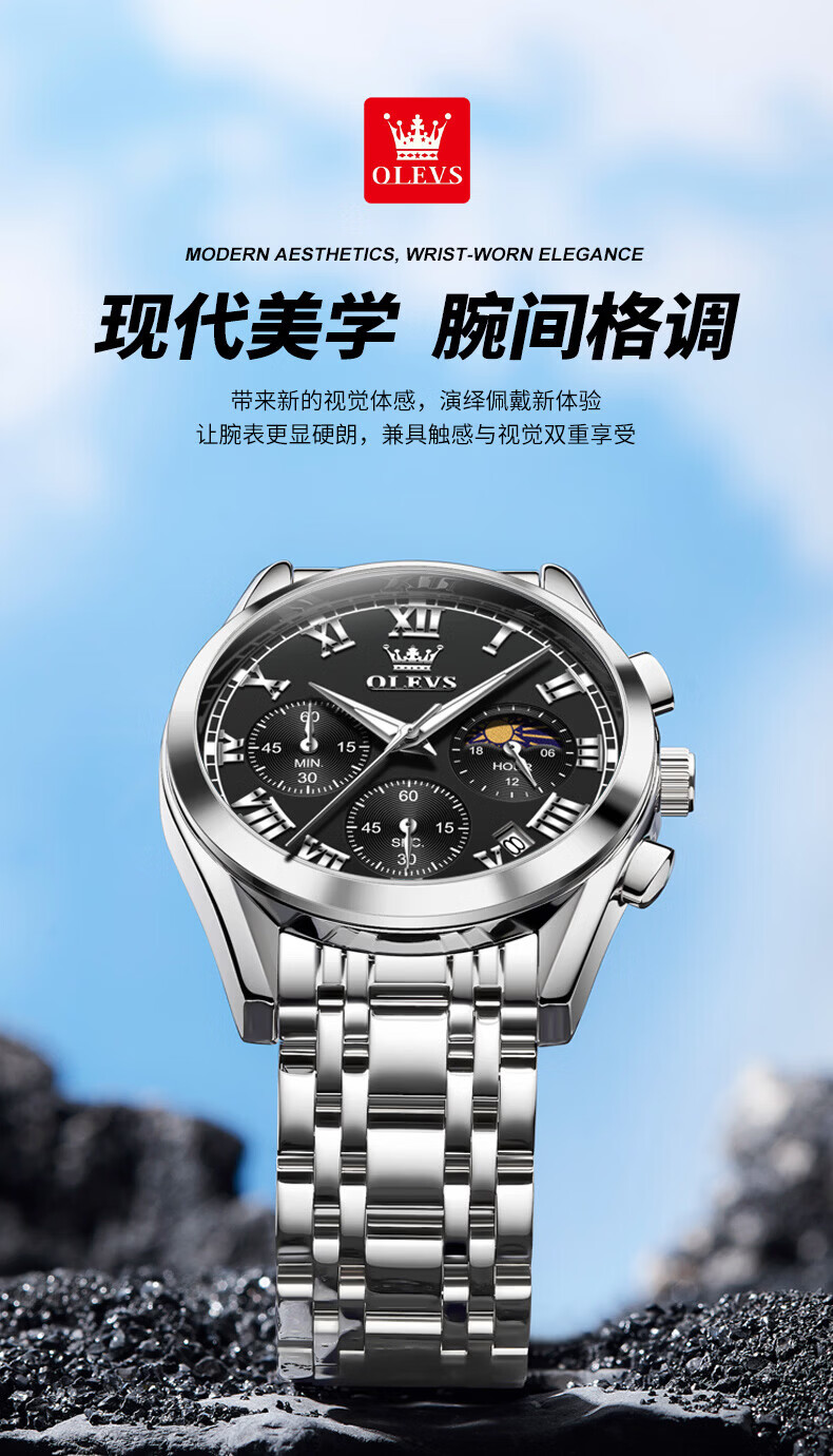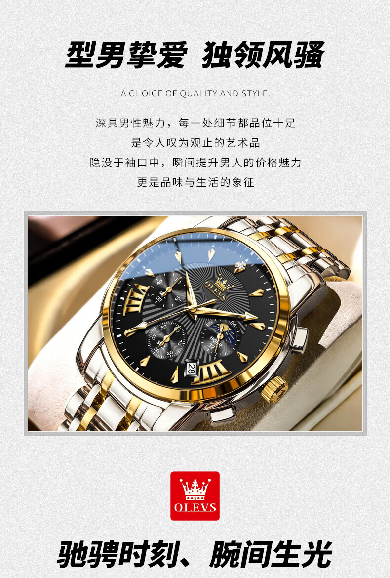 欧利时(OLEVS)瑞士认证品牌十大名表2026新款手表男石英表夜光防水商务男士手表 典藏版2871钢带全黑 免费刻字 终身质保