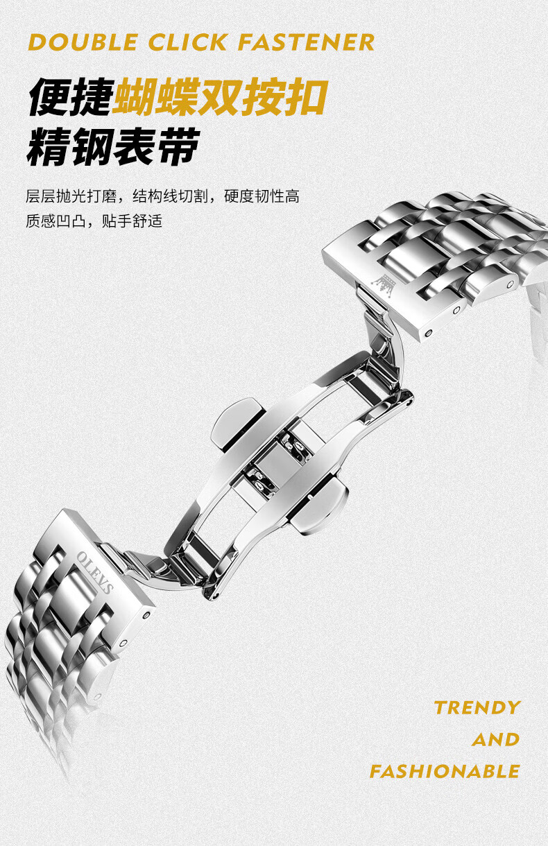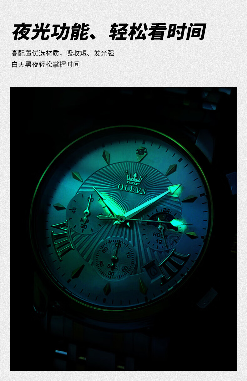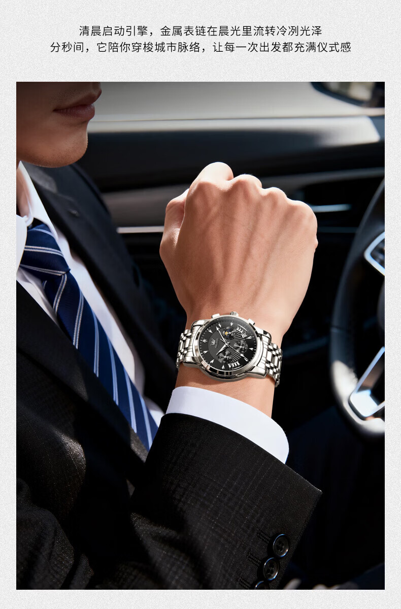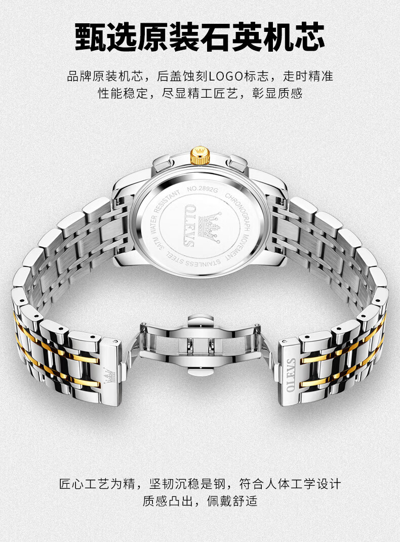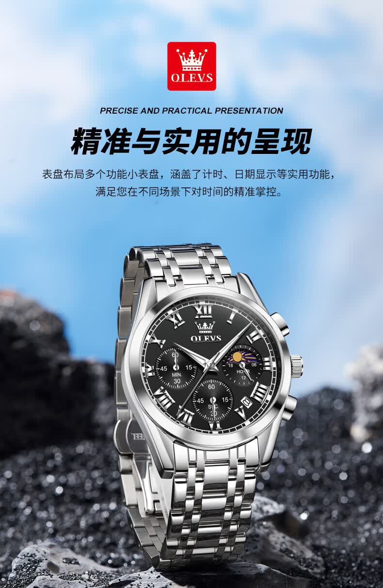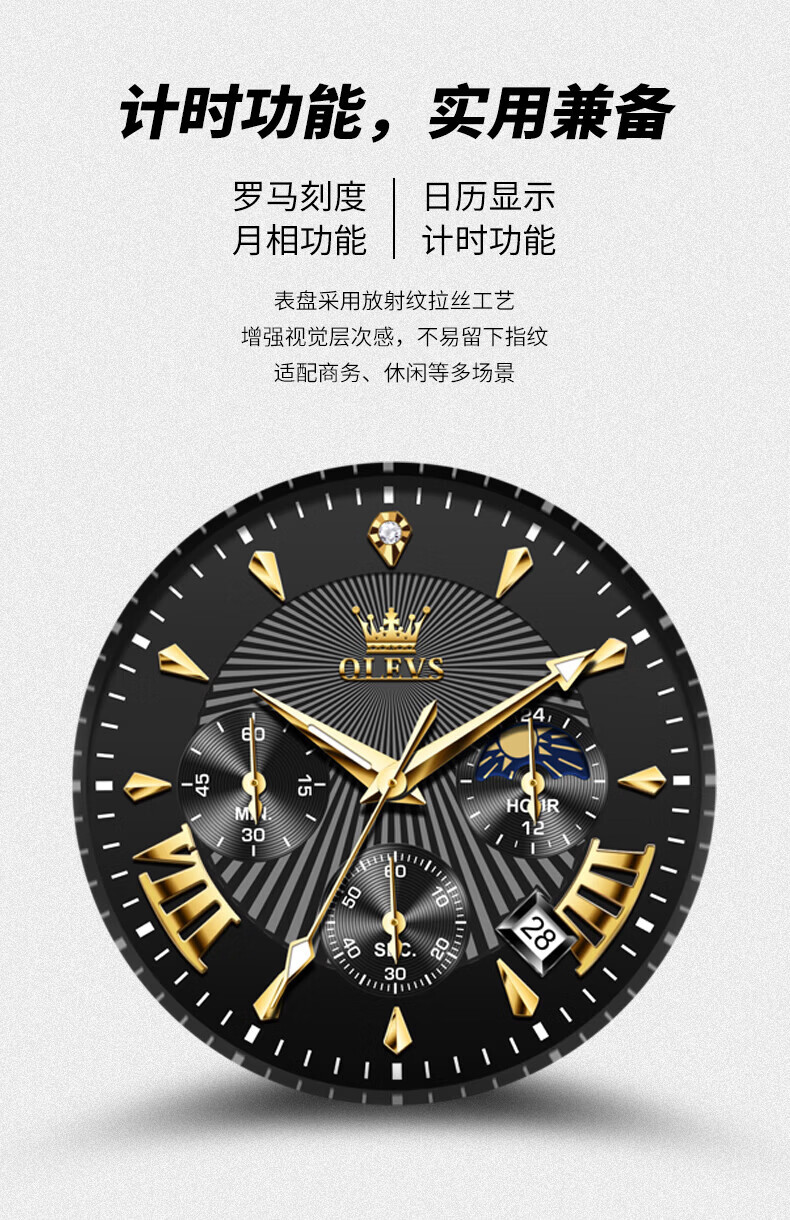 欧利时(OLEVS)瑞士认证品牌十大名表2026新款手表男石英表夜光防水商务男士手表 典藏版2871钢带全黑 免费刻字 终身质保
