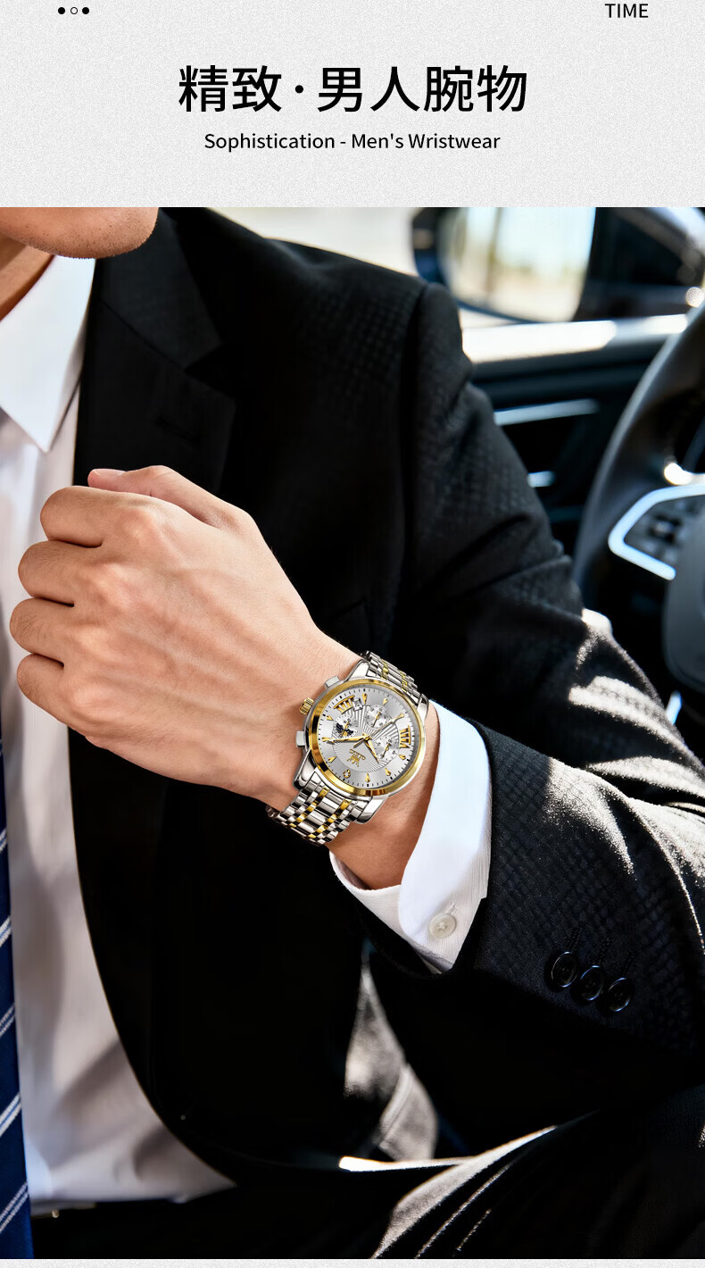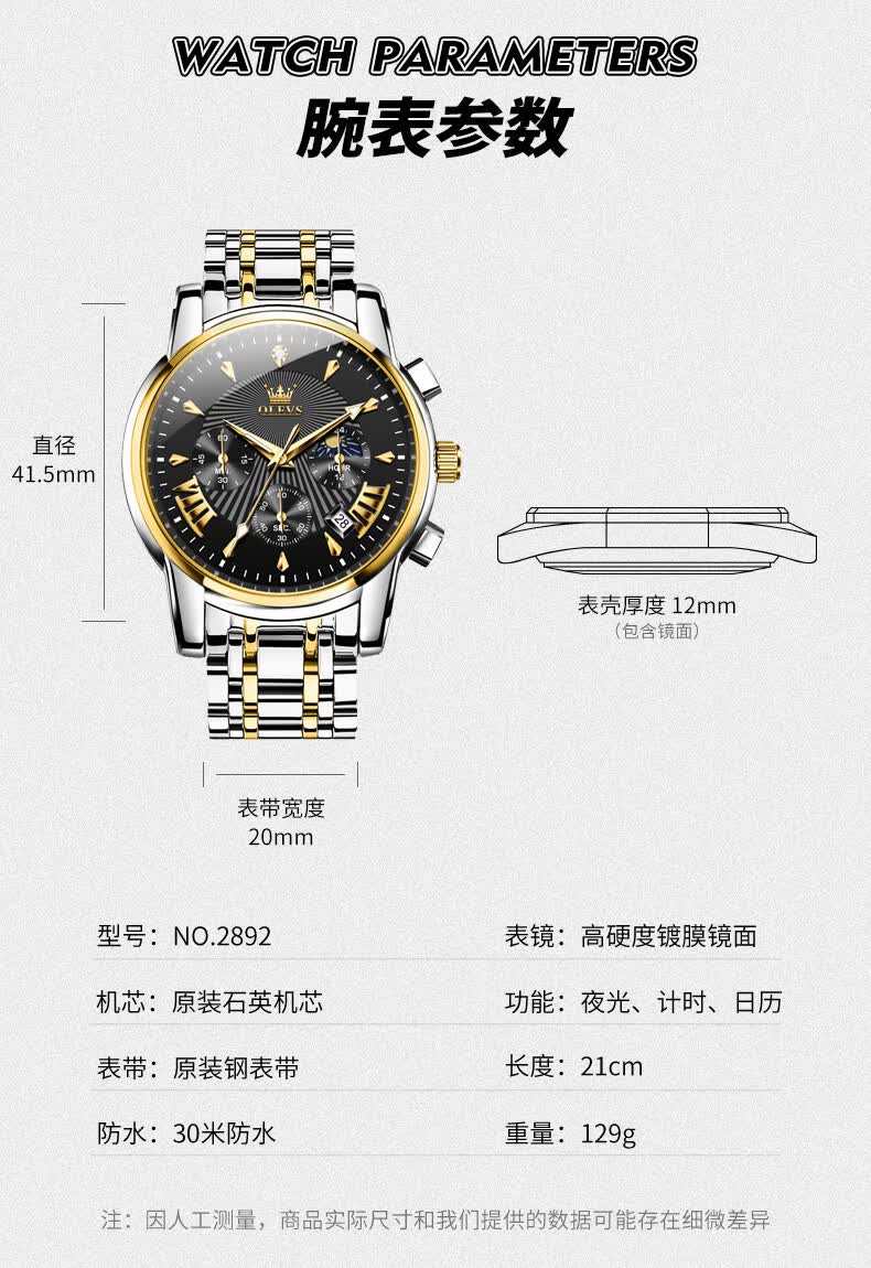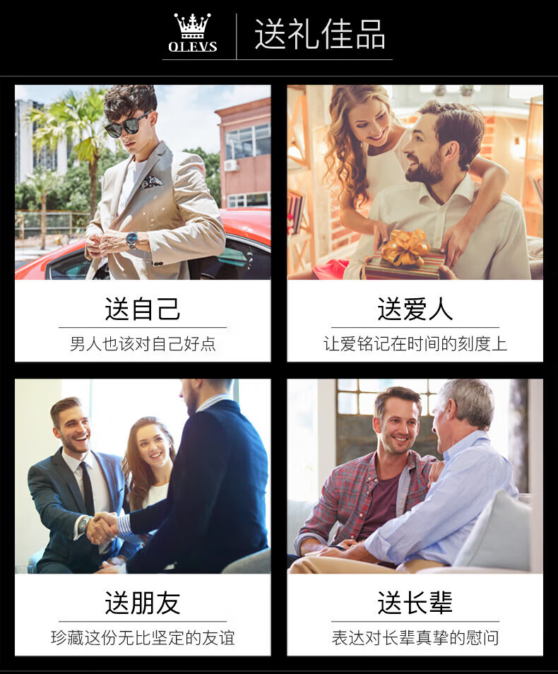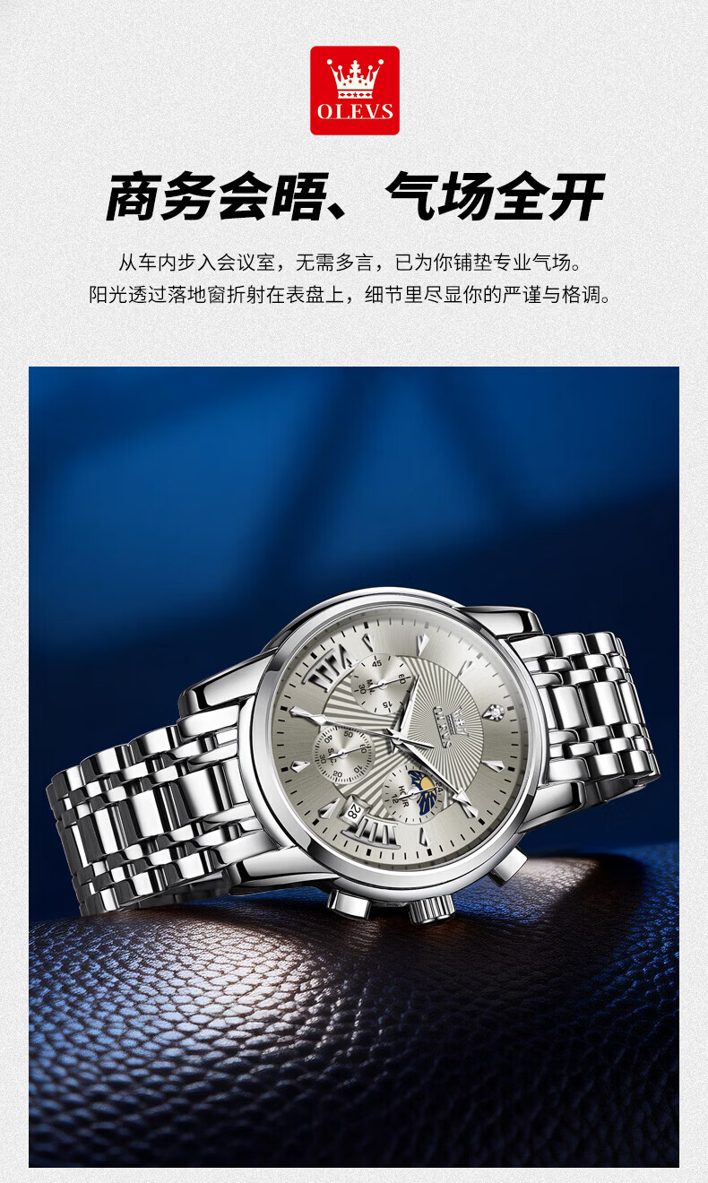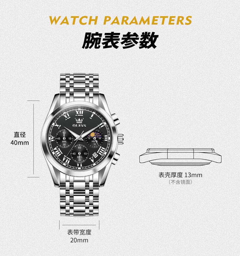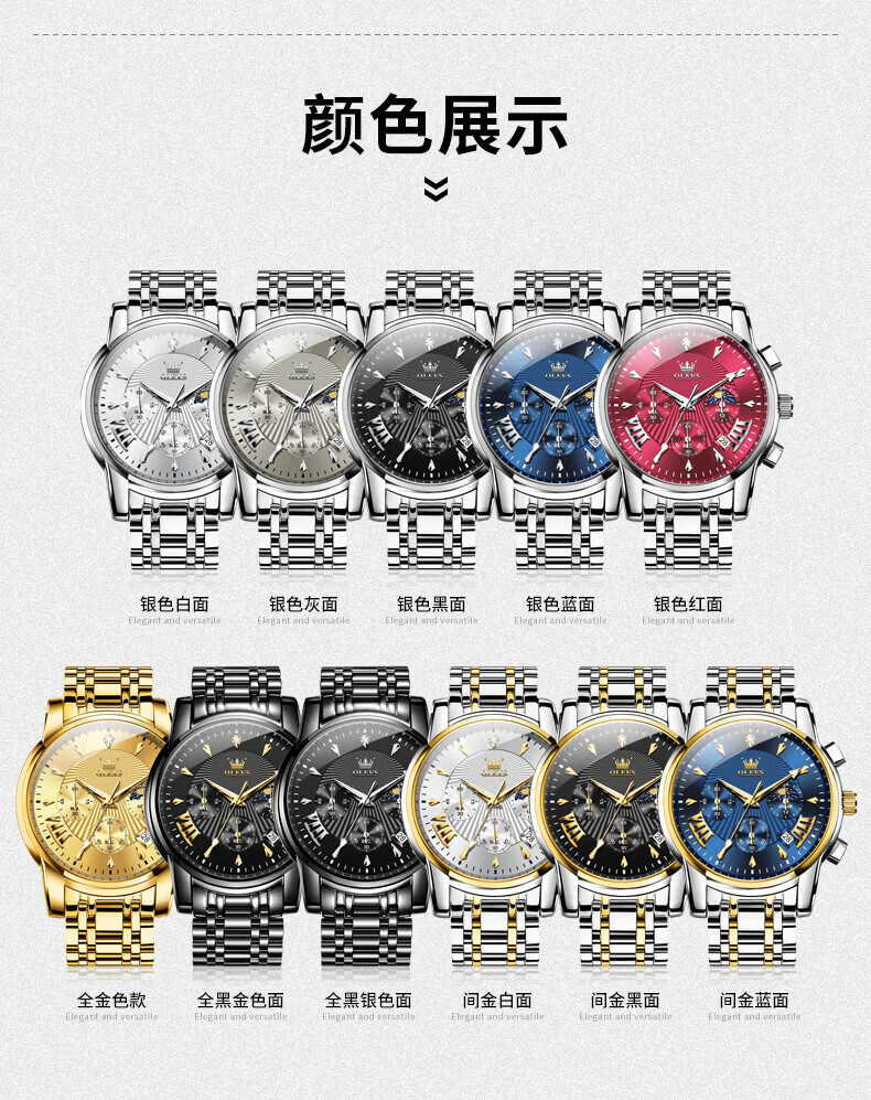 欧利时(OLEVS)瑞士认证品牌十大名表2026新款手表男石英表夜光防水商务男士手表 典藏版2871钢带全黑 免费刻字 终身质保
