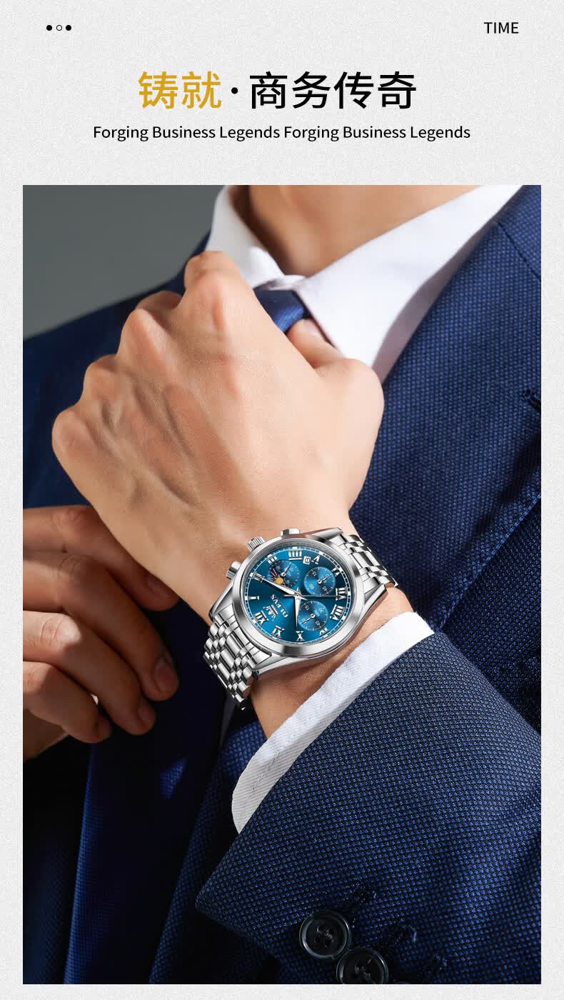 冠琴(GUANQIN)高端手表男全自动机械镂空飞轮精钢简约运动瑞士风格防水时尚腕表 【免费刻字+终身质保】钢带蓝面